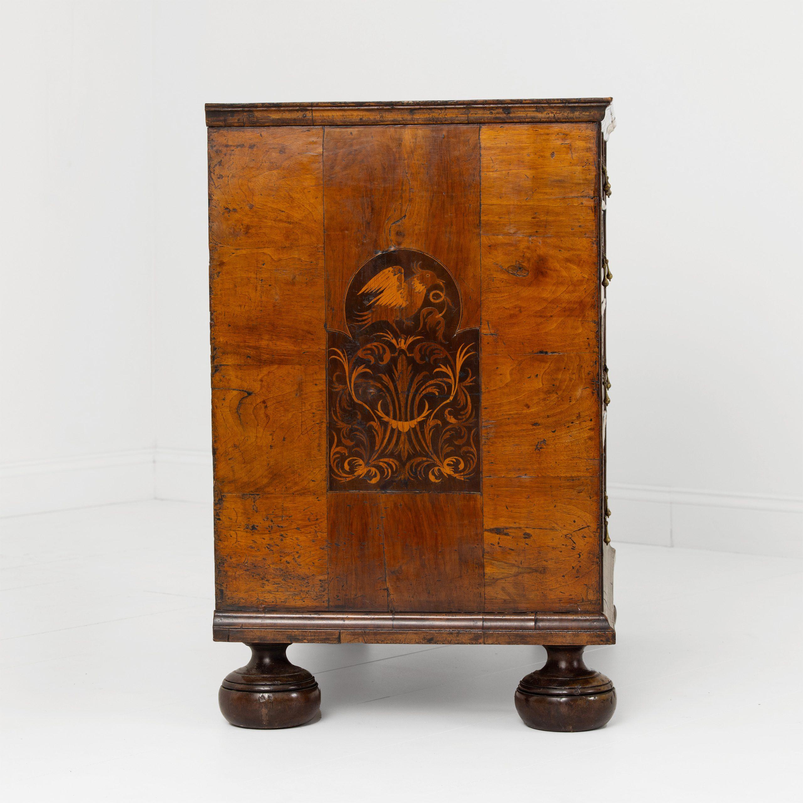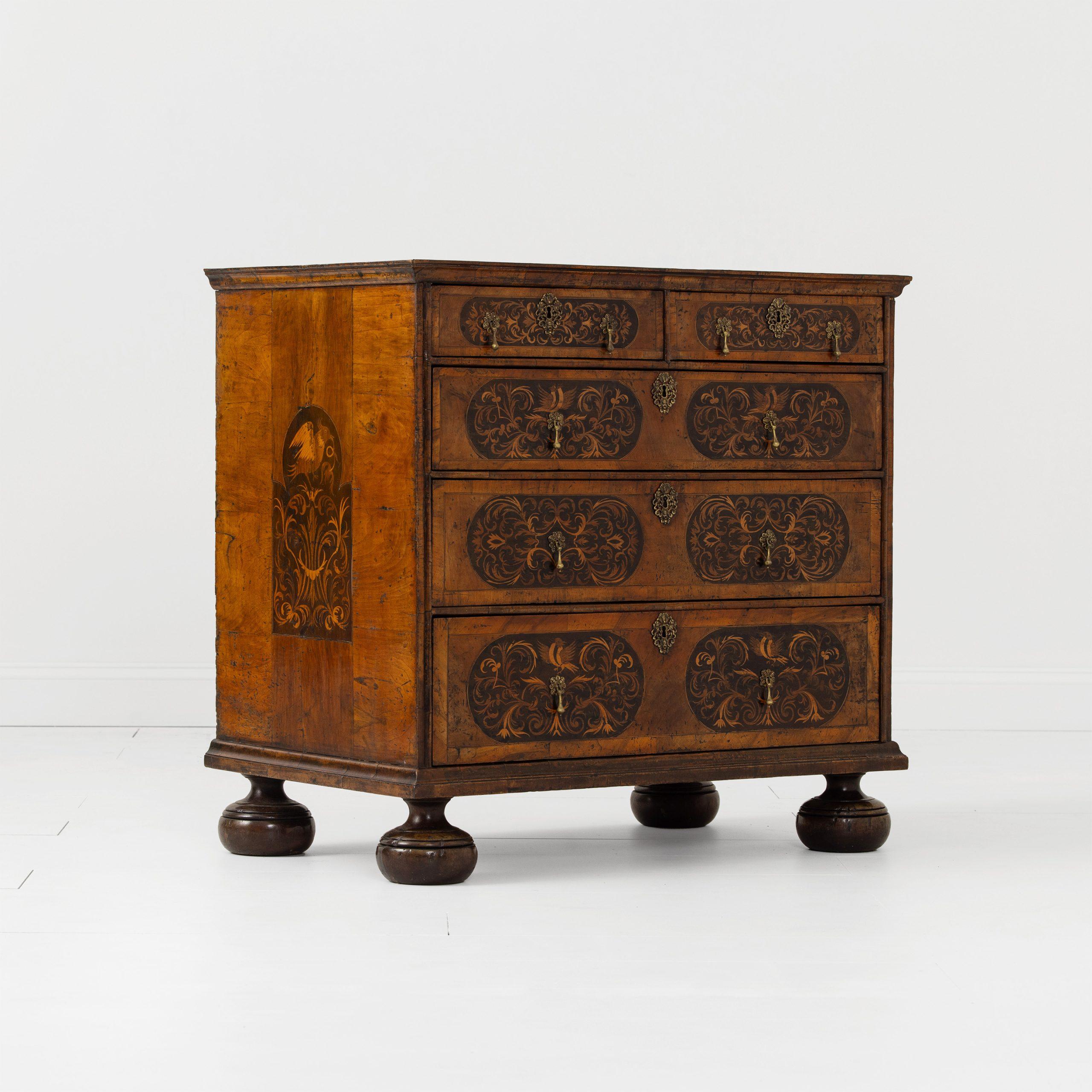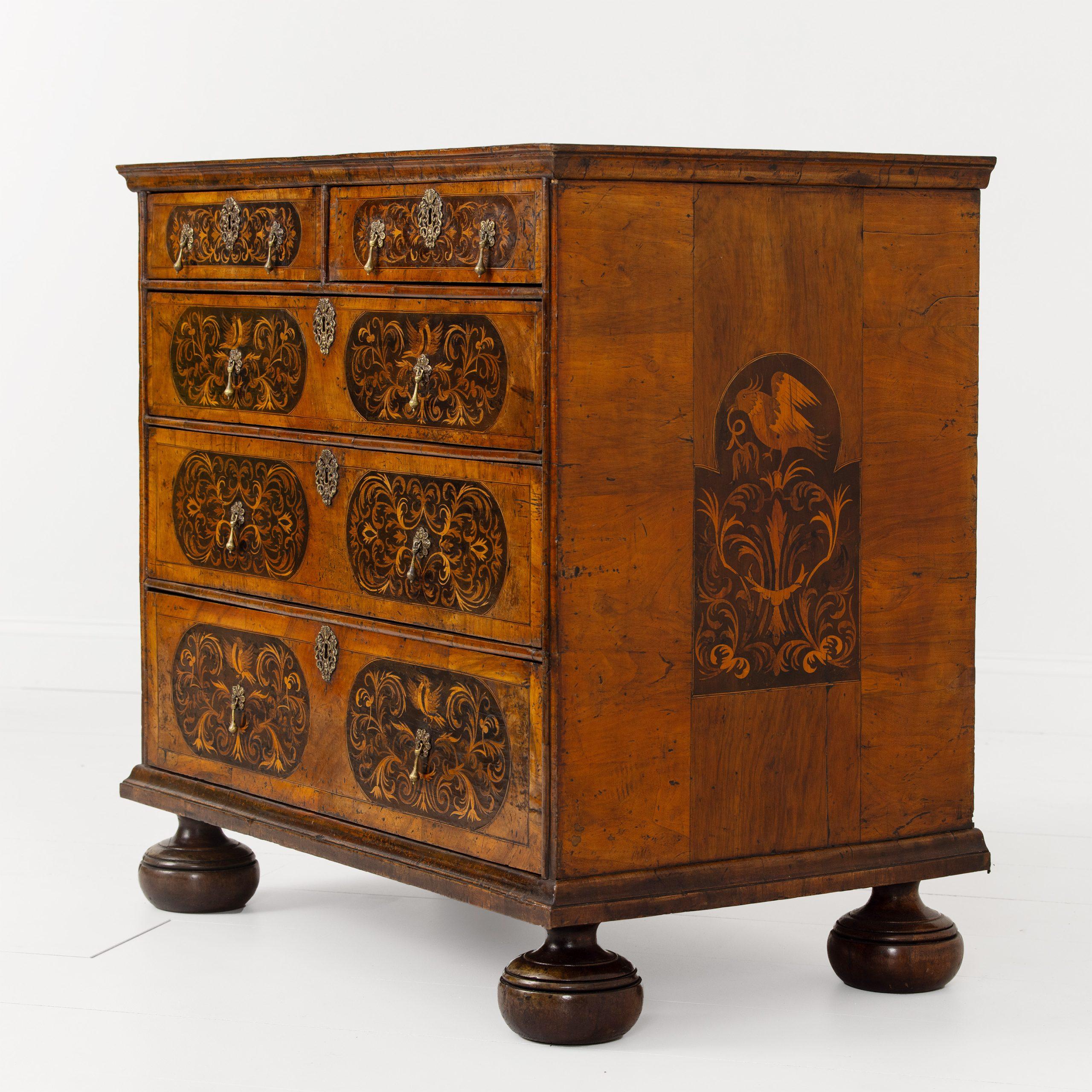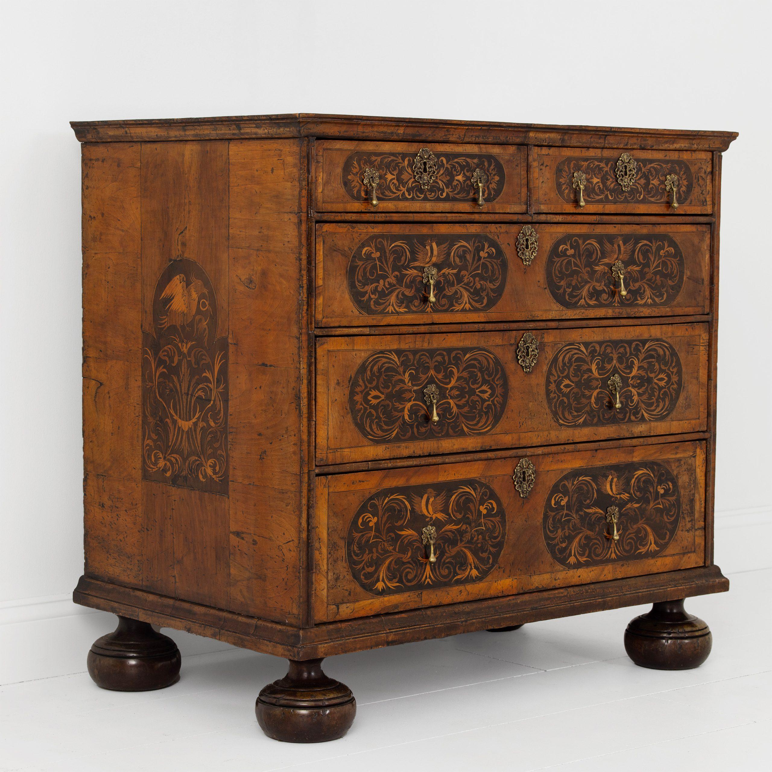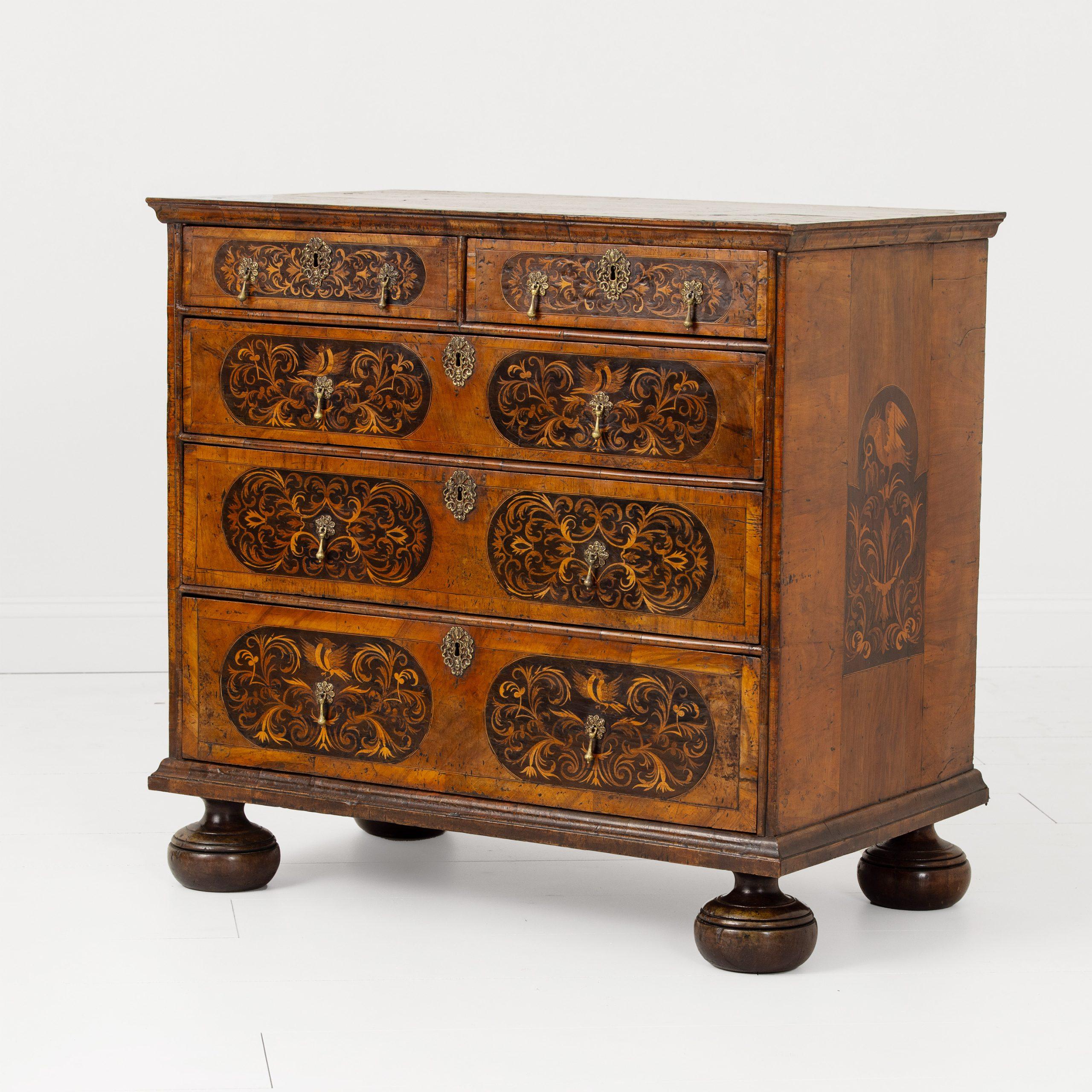 A fine English walnut and ebony seaweed marquetry chest of drawers from the William & Mary period, circa 1690. Ogee molded top with a central banded oval inlaid with exquisite hand-cut marquetry of birds, flowers, and foliated scrolls that resemble seaweed on an ebony ground. Two short, over three, long, graduating drawers inlaid with similar reserves of marquetry. Each drawer is adorned with brass escutcheons and teardrop handles. A large reserve of marquetry is centrally located on each side, depicting a bird perched above scrolls of leaves. Rests upon bun feet.