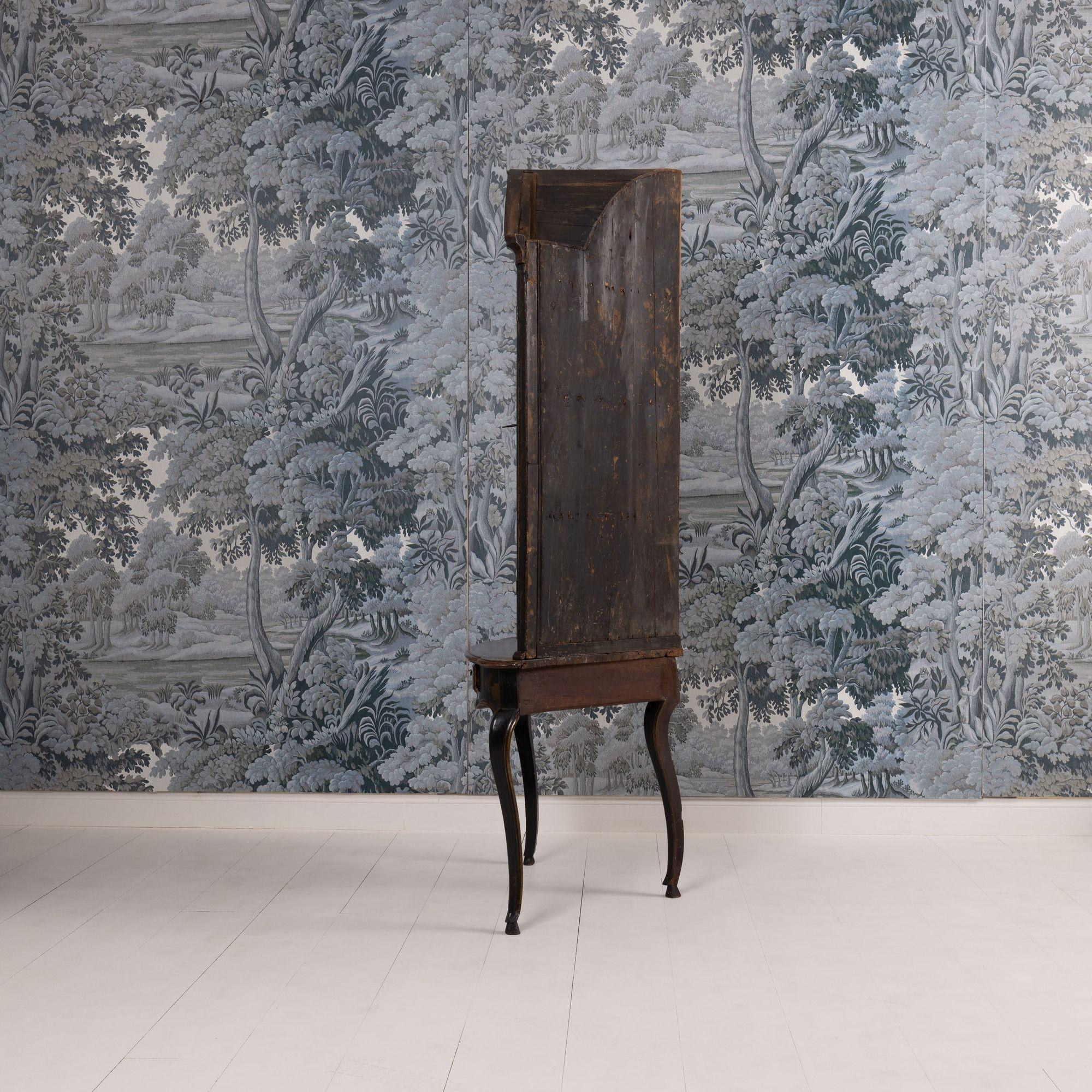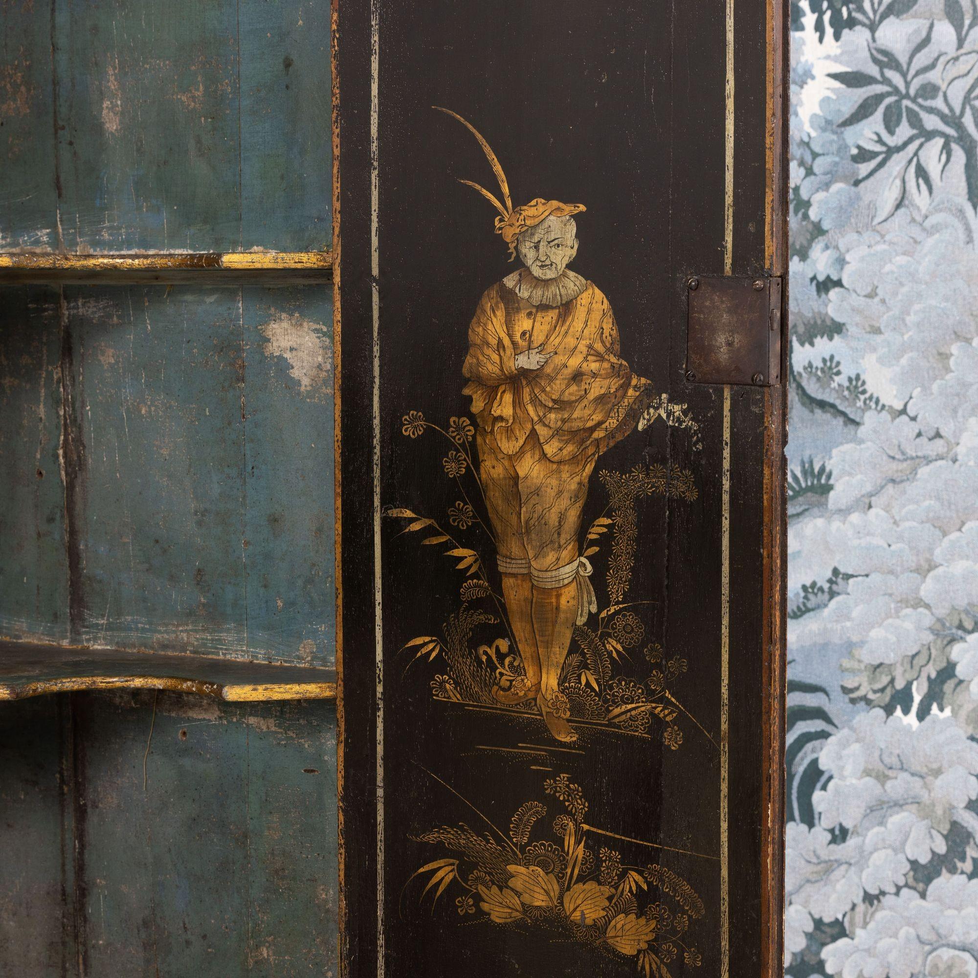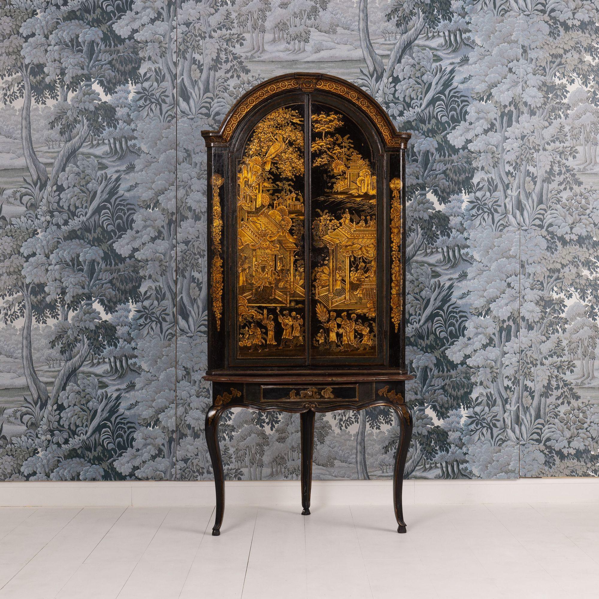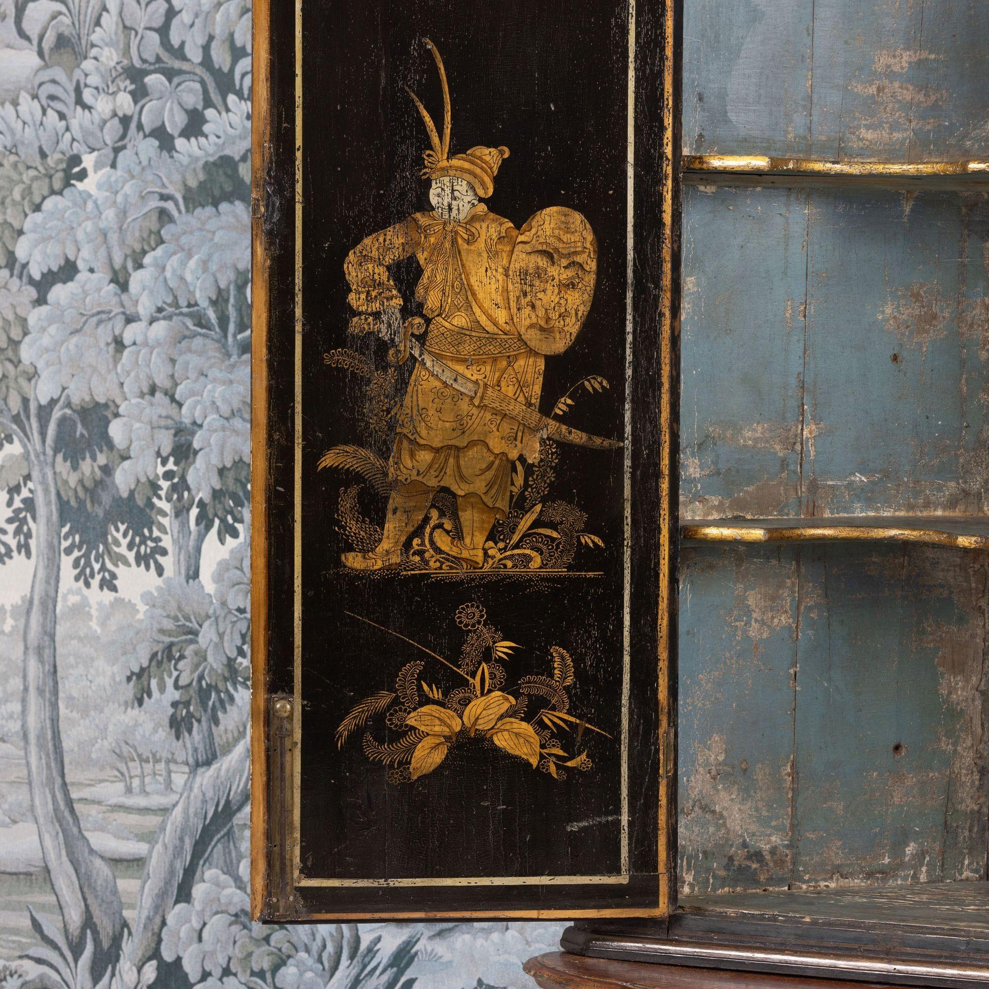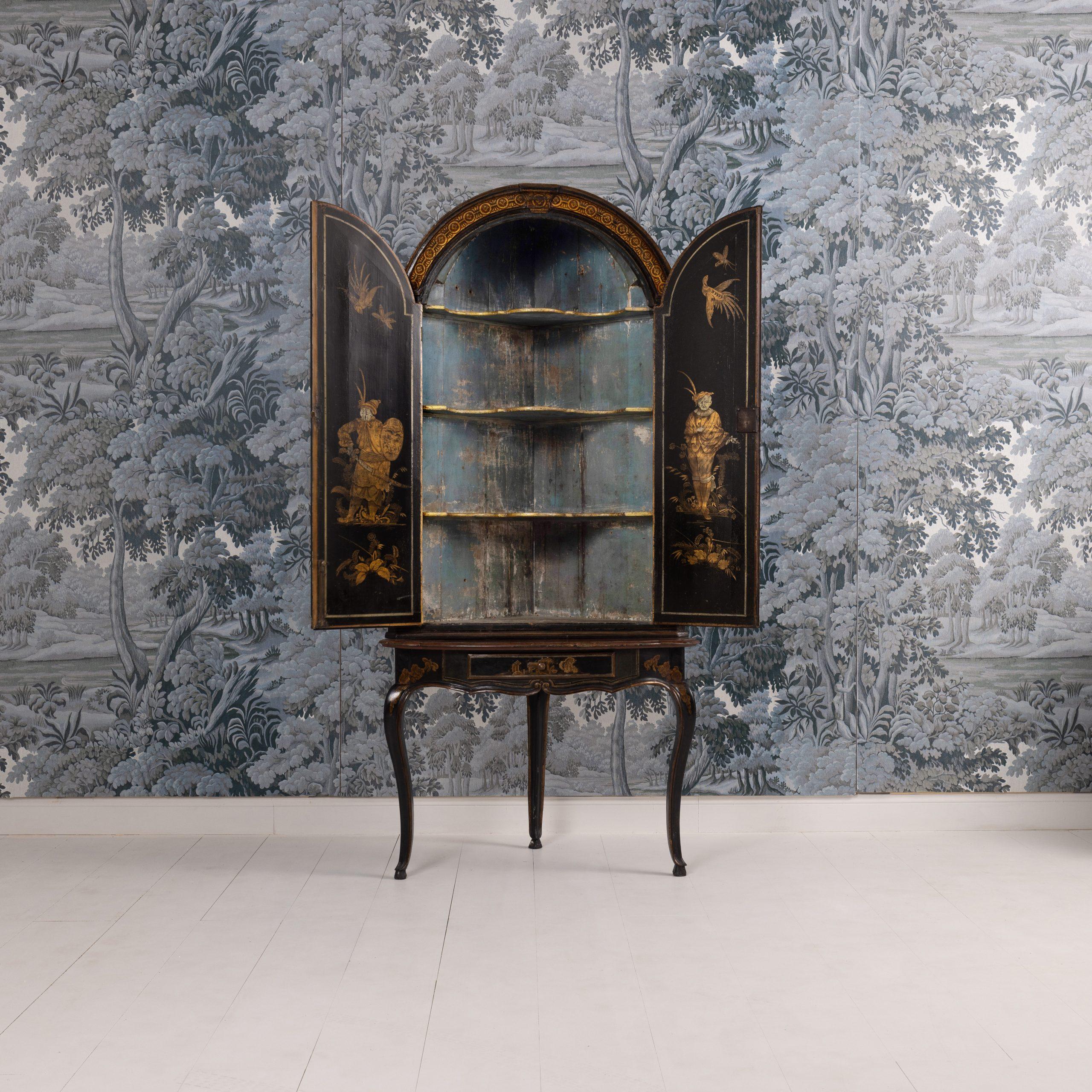 A fine 18th c. English black lacquer and parcel gilt Japanned corner cabinet on stand, circa 1760. Attributed to Giles Grendey, London; cabinet maker (1693-1780). The cabinet and stand were acquired from a property in Italy. The lacquered cabinet was most likely designed as a stand-alone, wall-mount cabinet. The triform stand is a later addition, certainly 18th century and likely of Italian origin. The quality of the lacquer work is exceptional and still in beautiful condition. The upper cabinet works well on the stand, giving an elegantly tall and slender look and feel. The cabinet and stand have clearly been together for some 200 years or so. For related work attributed to Grendey, see Christie’s Sale 19032 – The Exceptional Sale – lot 27 and Christie’s Sale 19983 – The Collection of Mrs. Henry Ford – Lot 25.