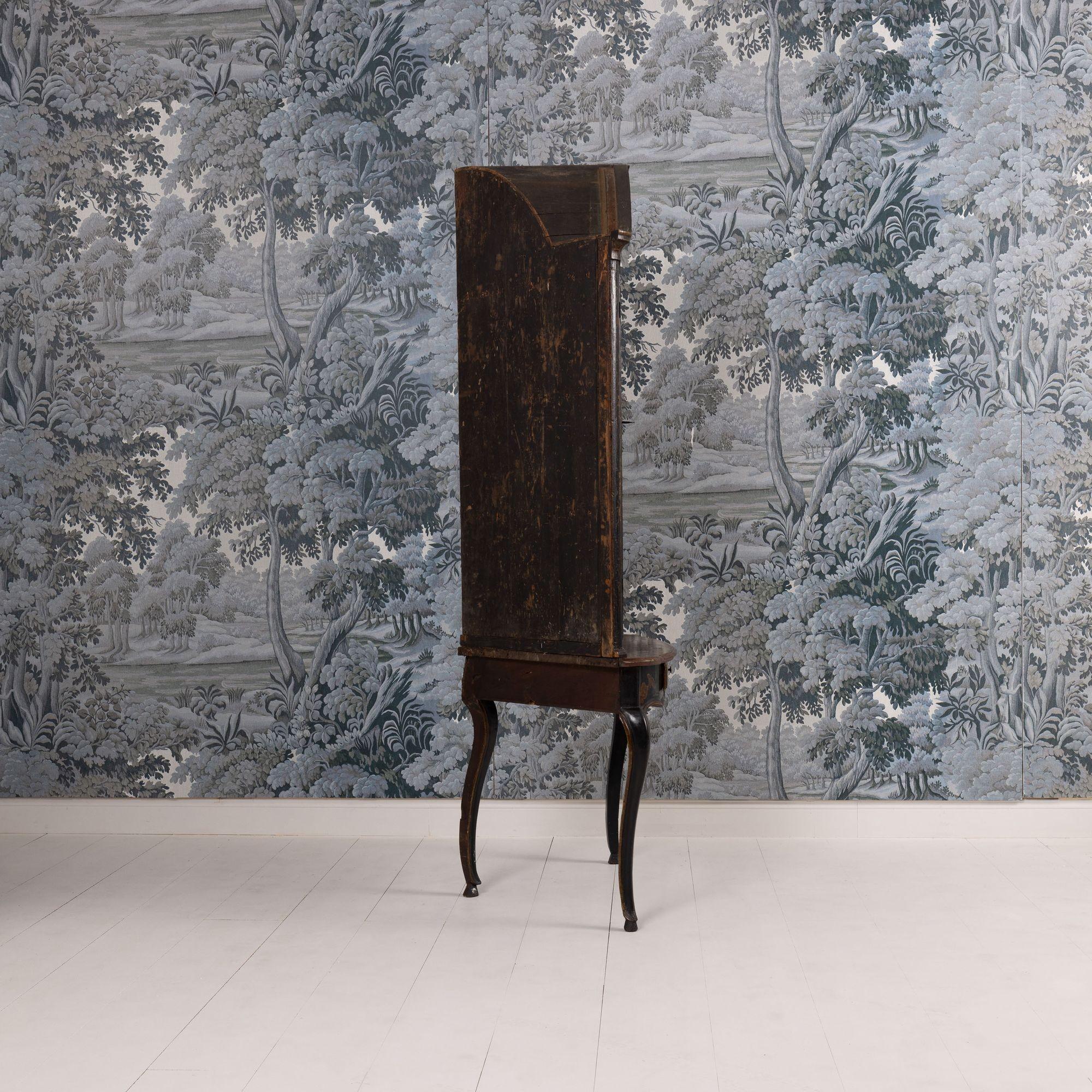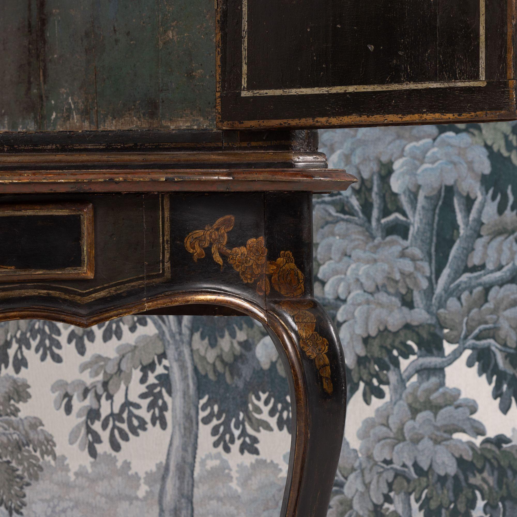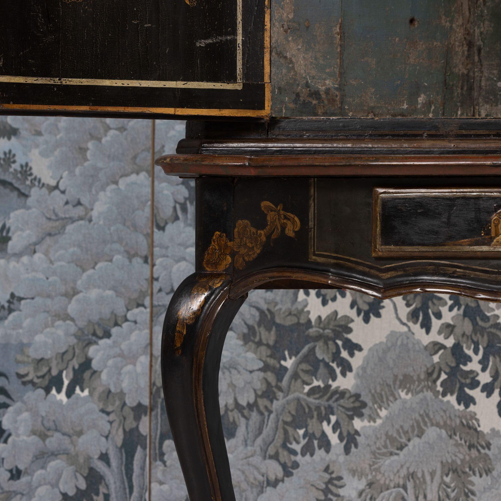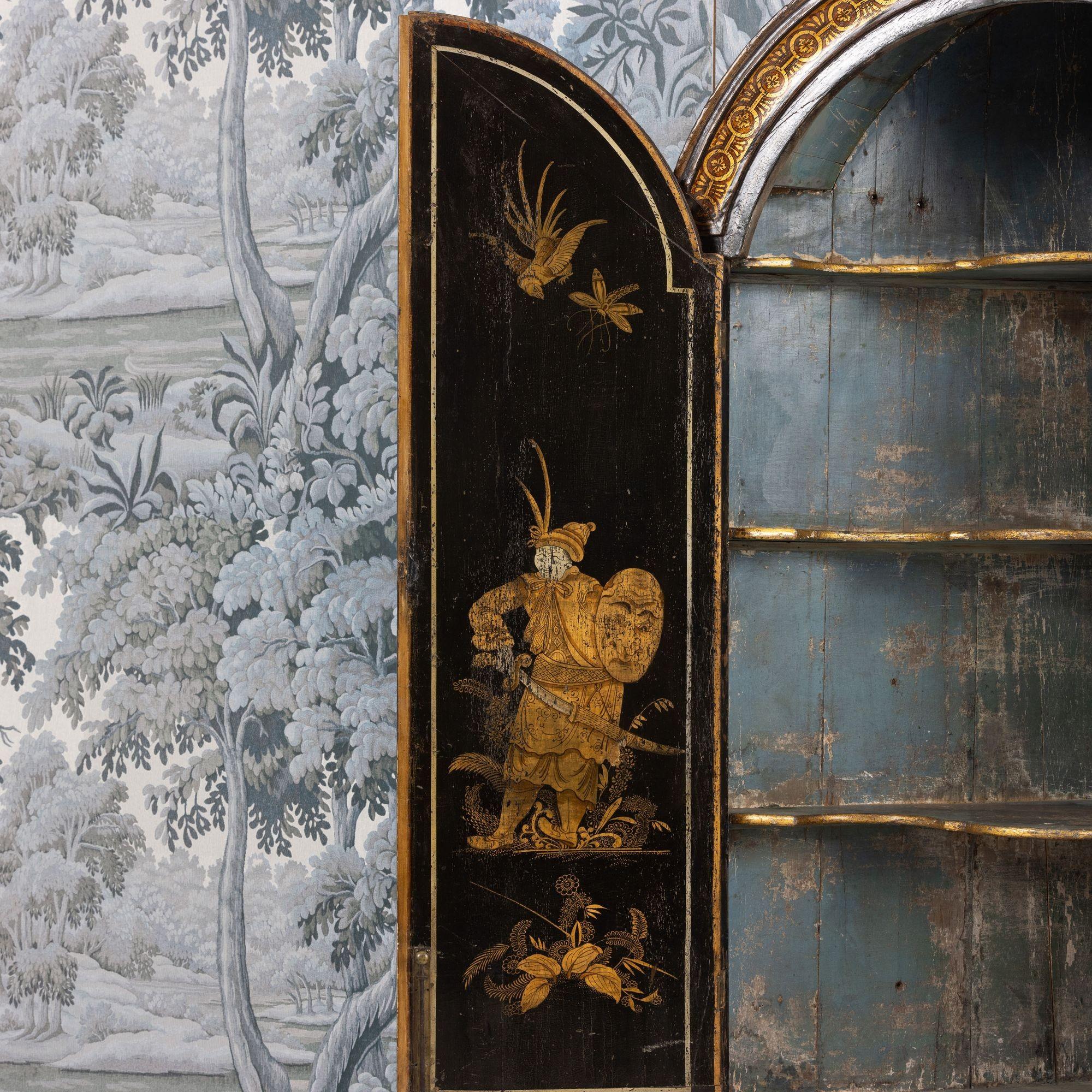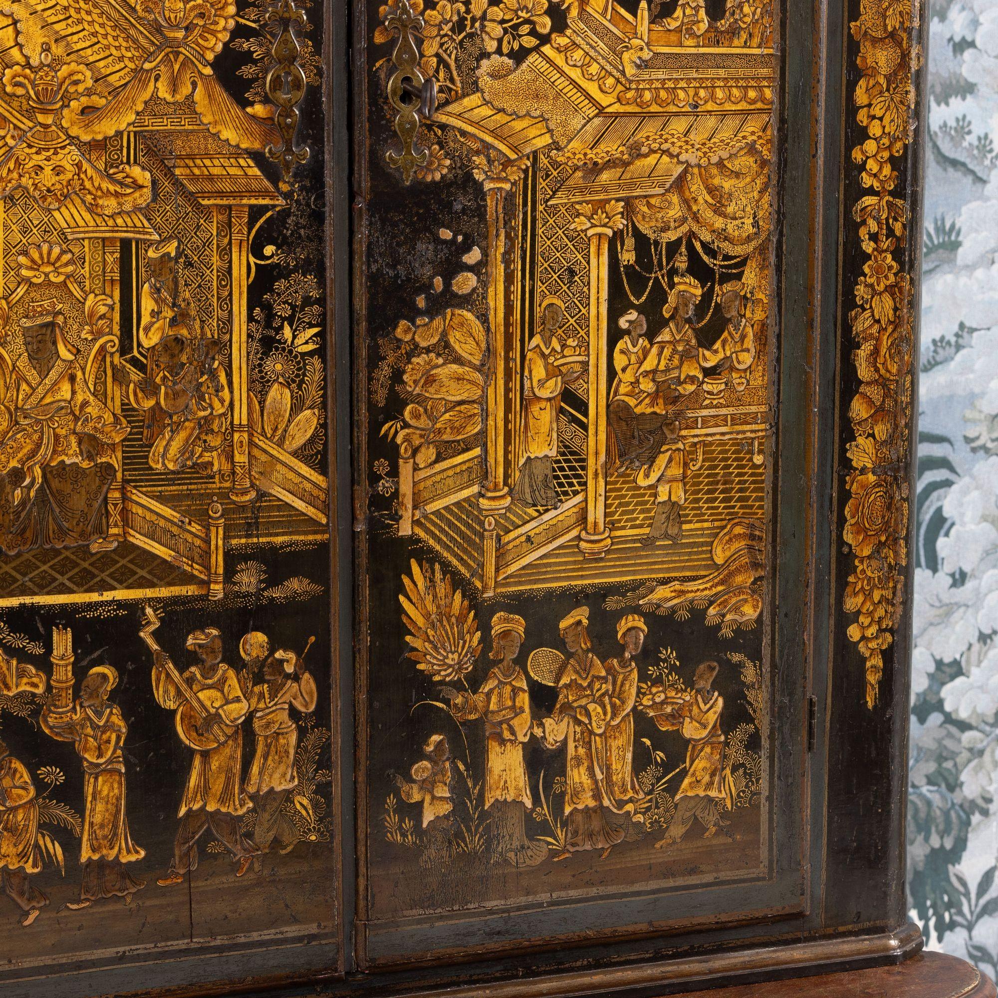 A fine 18th c. English black lacquer and parcel gilt Japanned corner cabinet on stand, circa 1760. Attributed to Giles Grendey, London; cabinet maker (1693-1780). The cabinet and stand were acquired from a property in Italy. The lacquered cabinet was most likely designed as a stand-alone, wall-mount cabinet. The triform stand is a later addition, certainly 18th century and likely of Italian origin. The quality of the lacquer work is exceptional and still in beautiful condition. The upper cabinet works well on the stand, giving an elegantly tall and slender look and feel. The cabinet and stand have clearly been together for some 200 years or so. For related work attributed to Grendey, see Christie’s Sale 19032 – The Exceptional Sale – lot 27 and Christie’s Sale 19983 – The Collection of Mrs. Henry Ford – Lot 25.