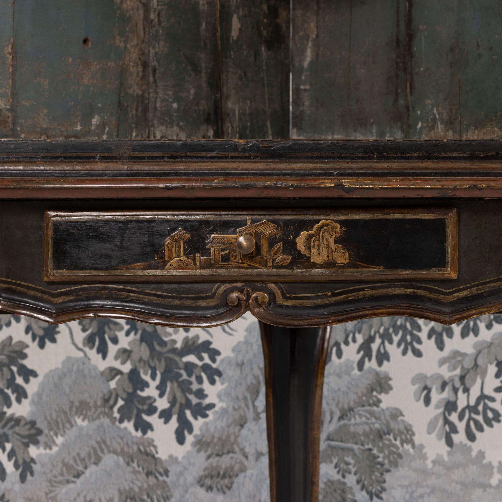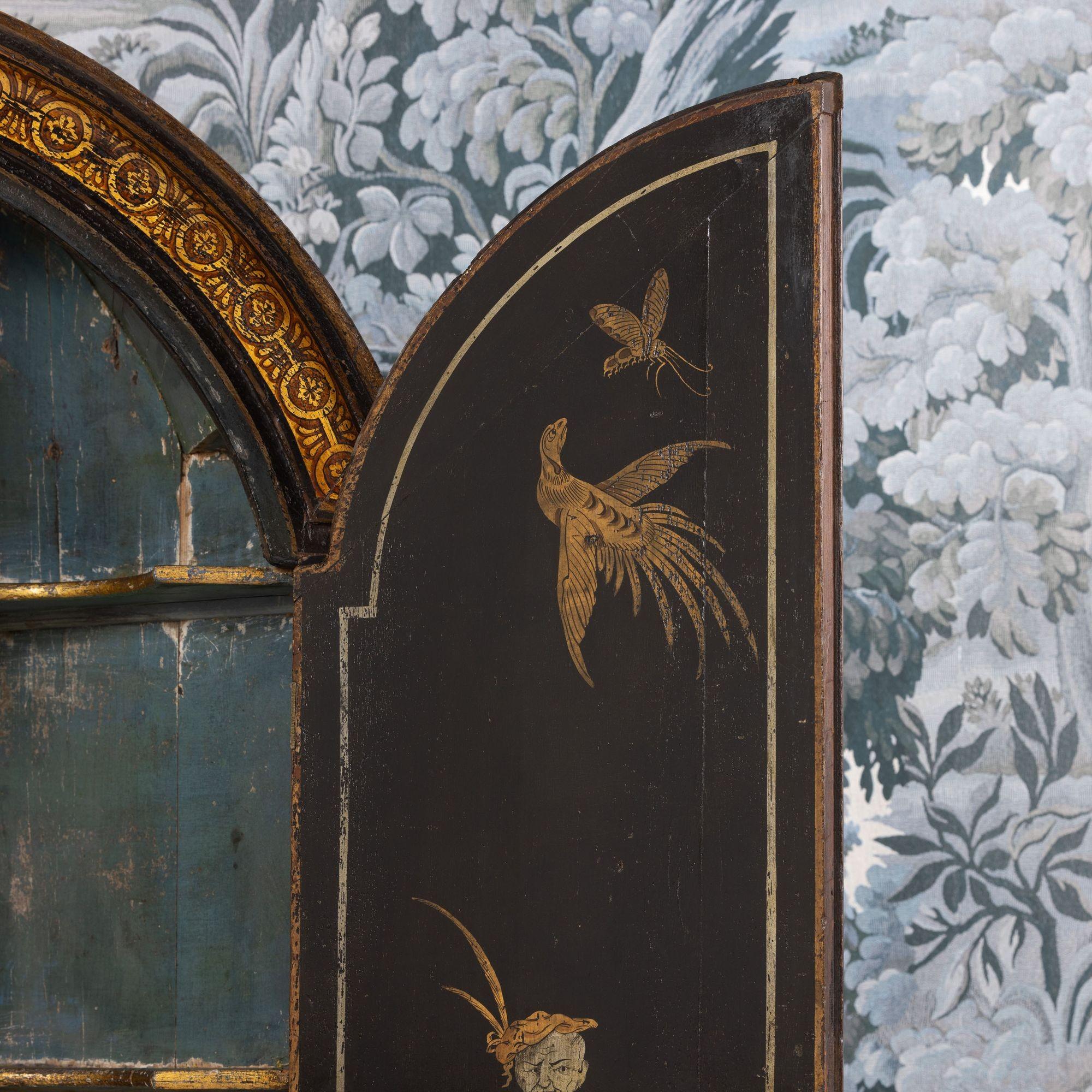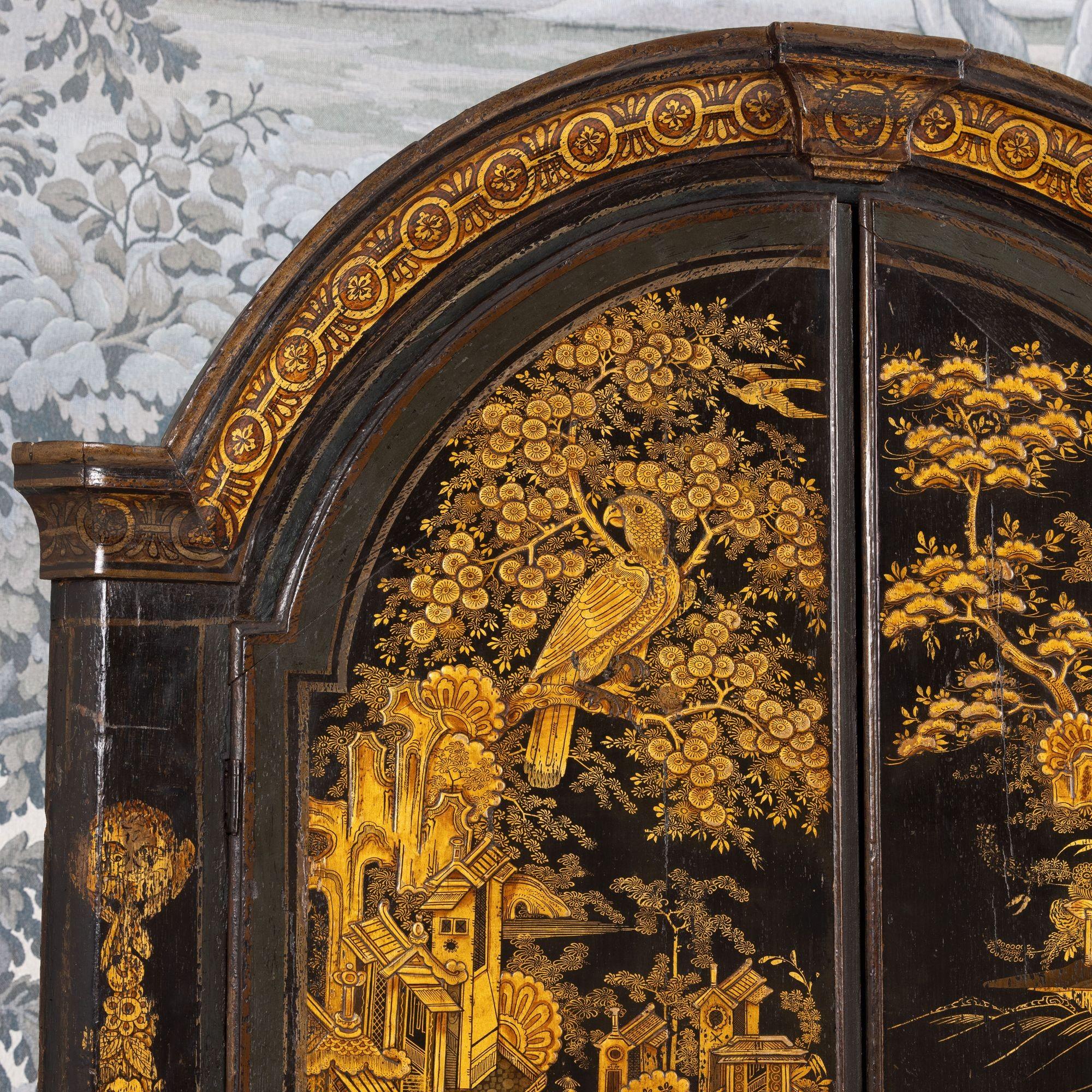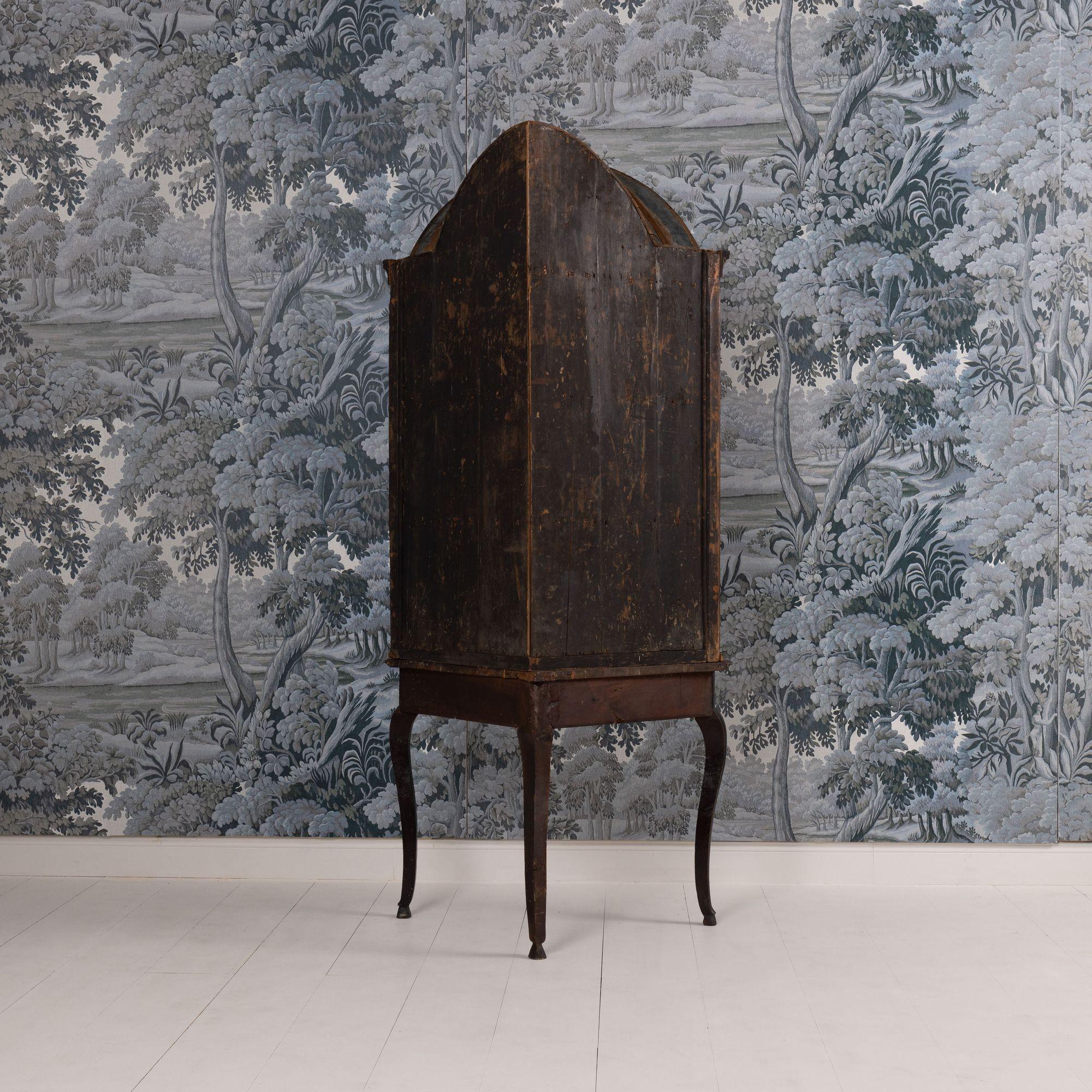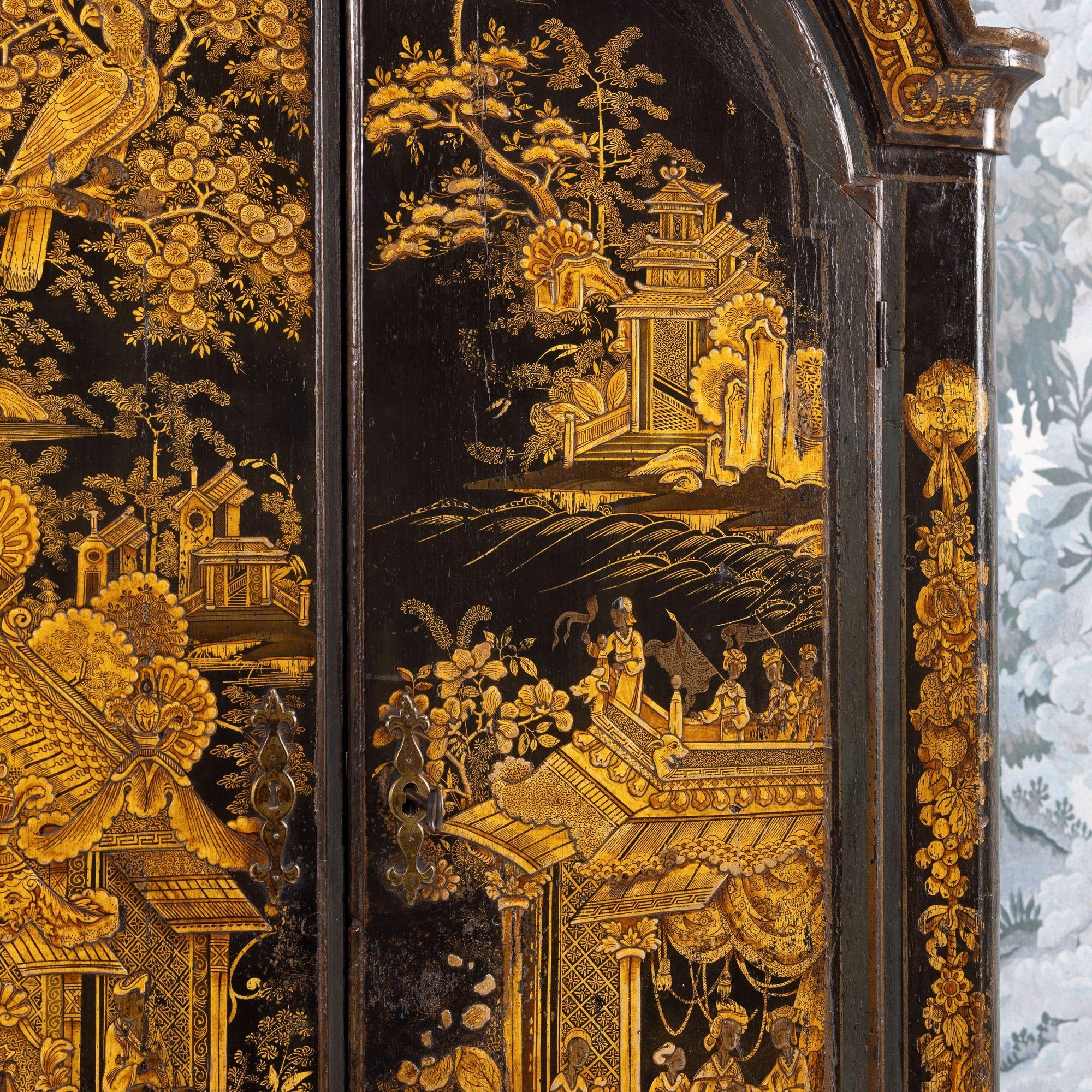 A fine 18th c. English black lacquer and parcel gilt Japanned corner cabinet on stand, circa 1760. Attributed to Giles Grendey, London; cabinet maker (1693-1780). The cabinet and stand were acquired from a property in Italy. The lacquered cabinet was most likely designed as a stand-alone, wall-mount cabinet. The triform stand is a later addition, certainly 18th century and likely of Italian origin. The quality of the lacquer work is exceptional and still in beautiful condition. The upper cabinet works well on the stand, giving an elegantly tall and slender look and feel. The cabinet and stand have clearly been together for some 200 years or so. For related work attributed to Grendey, see Christie’s Sale 19032 – The Exceptional Sale – lot 27 and Christie’s Sale 19983 – The Collection of Mrs. Henry Ford – Lot 25.