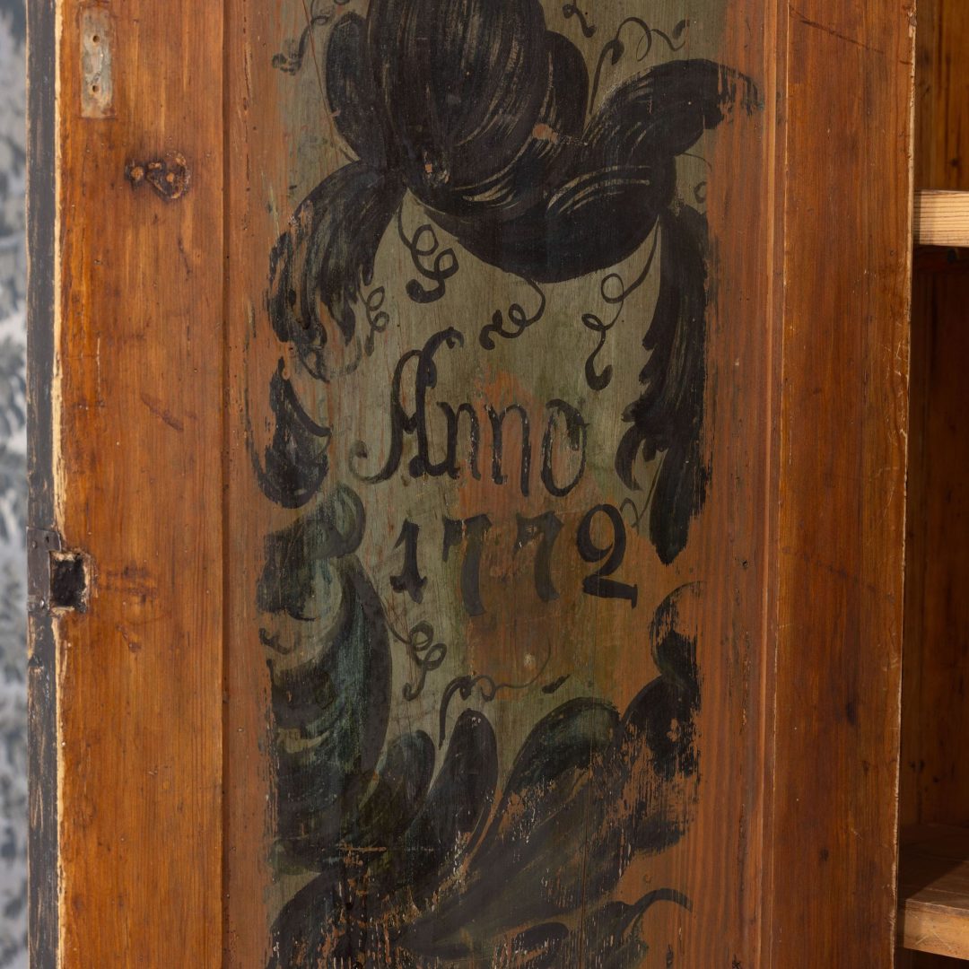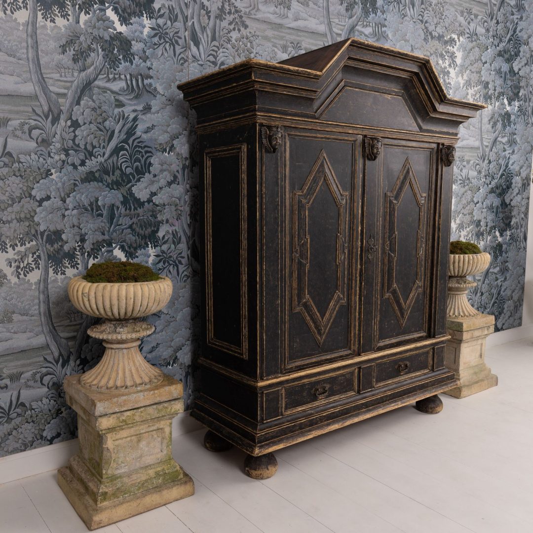 An important and richly carved Swedish armoire cabinet from the Baroque period with handsome bun feet. Provenance on the inside of the left door, dates the piece to 1772 (Anno 1772). On the inside of the right door is the name of the owner (Gustaf Hi Smitt). Original lock and hardware. Beautifully proportioned with a shaped pediment cornice. Charming carved cherub heads and carved diamond detailing on the door fronts with molding detail on the sides. Inside there are two removable shelves. The large doors sit above two drawers. Working lock and drawers. This is a rare piece with plenty of storage potential. As often is the case with these fine 18th century pieces, the cabinet disassembles into nine pieces for ease of transport.