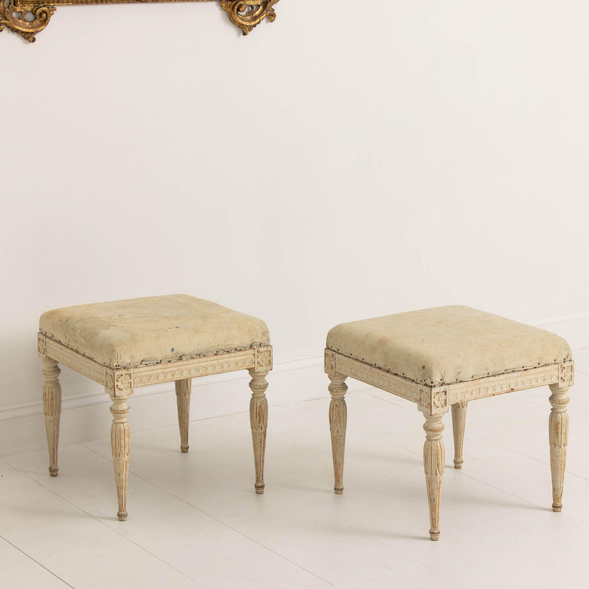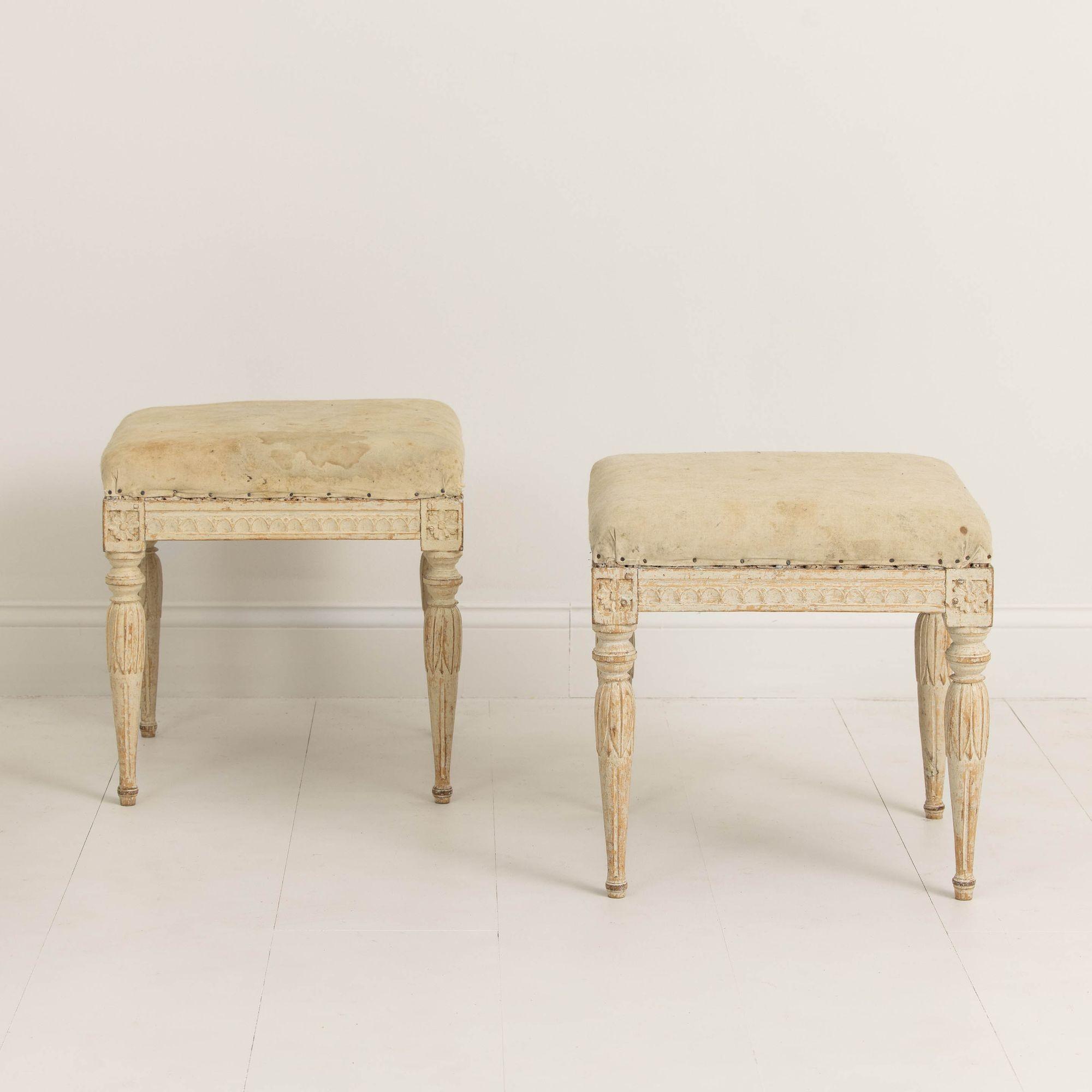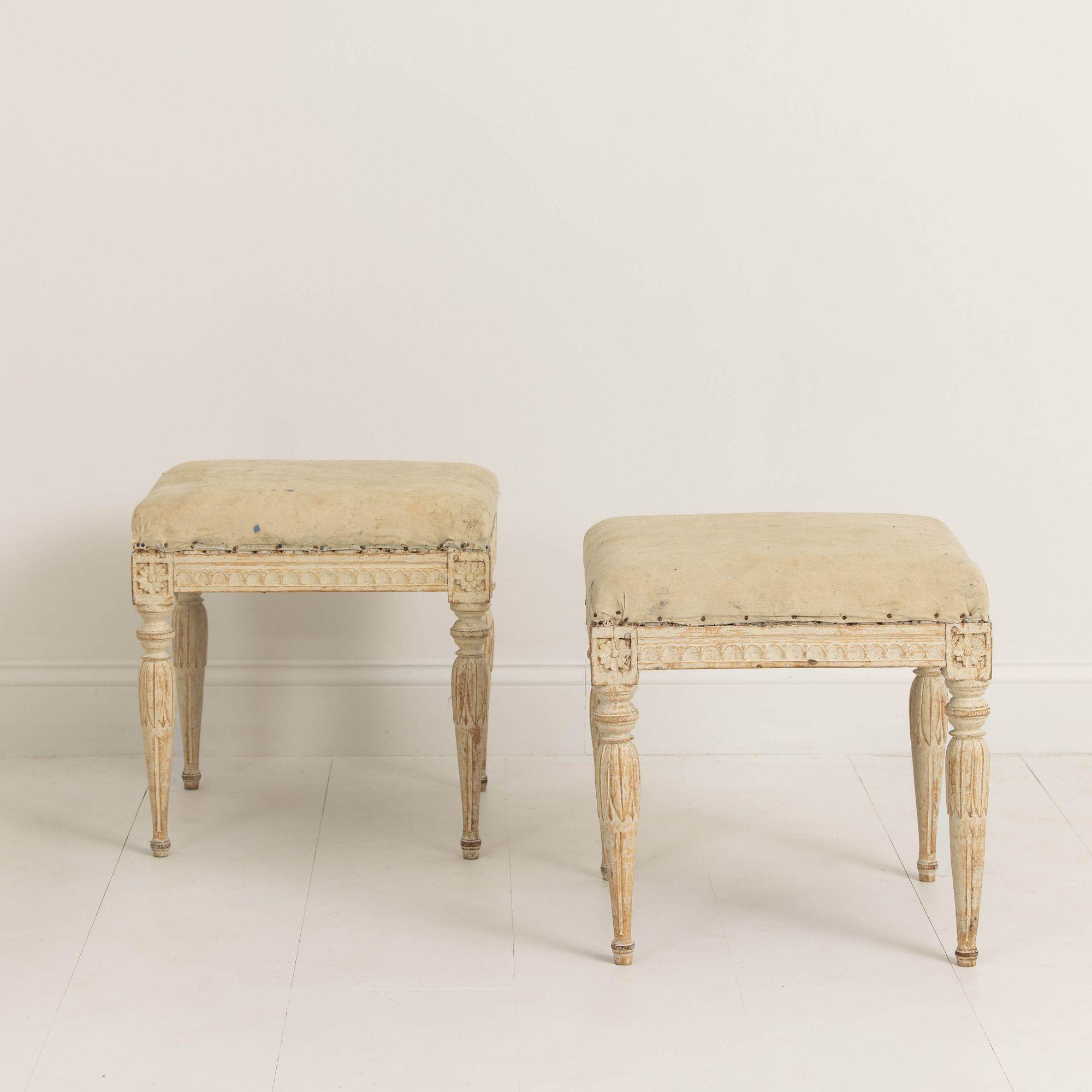 A charming pair of Swedish benches from the early Gustavian period in original paint, circa 1780. These stools display beautiful carved egg and dart detail on the seat frame, rosettes on the corner posts, and acanthus leaves on round, tapered legs.