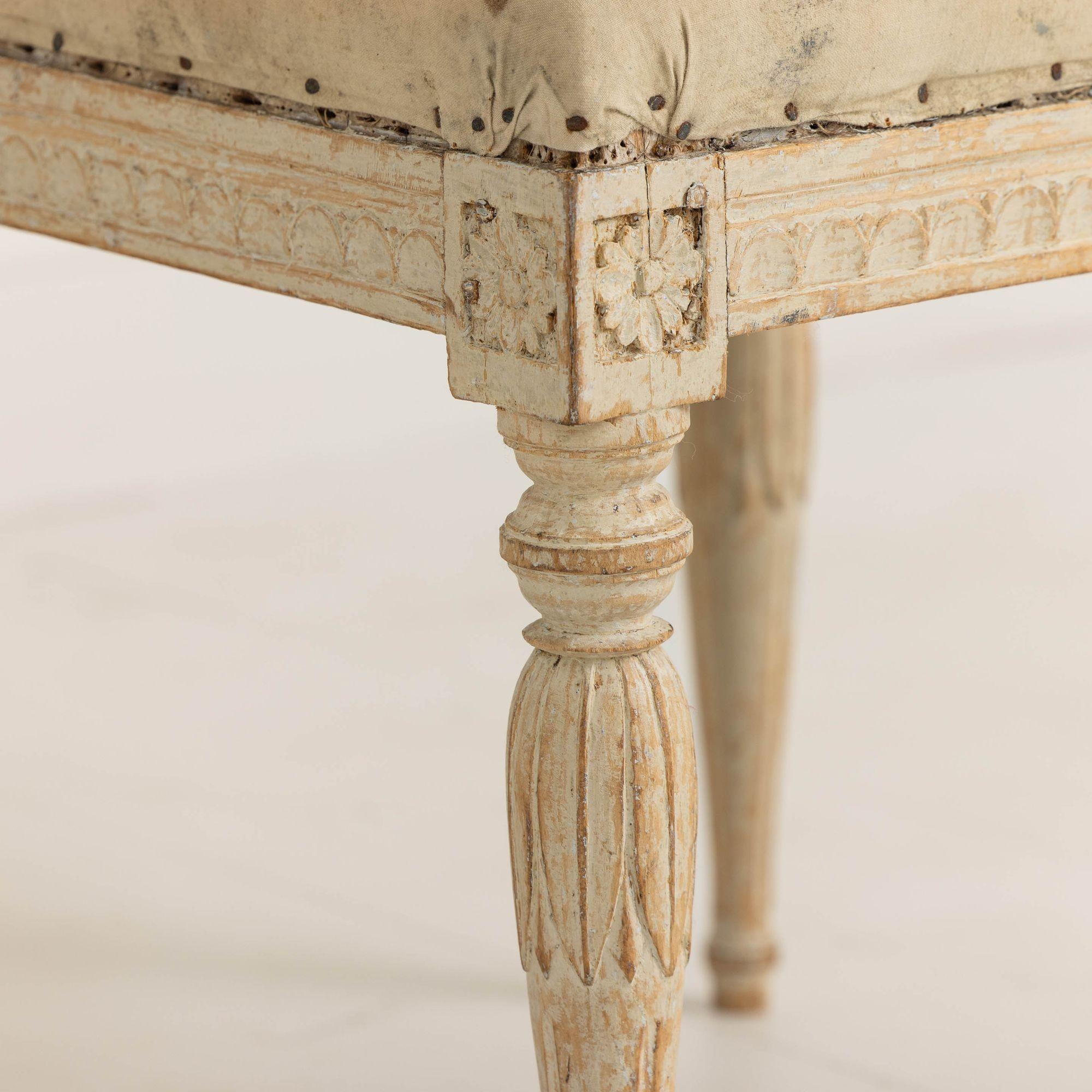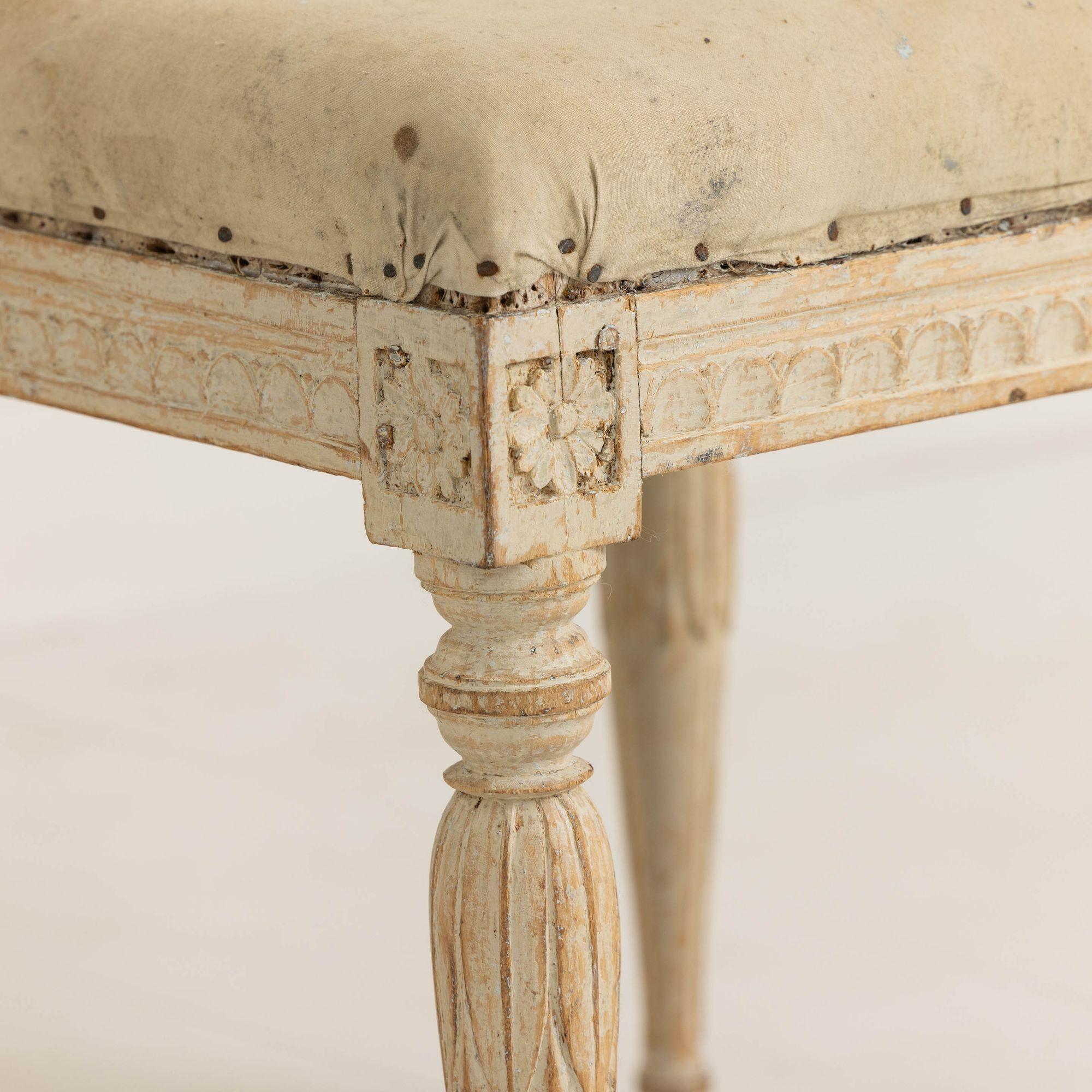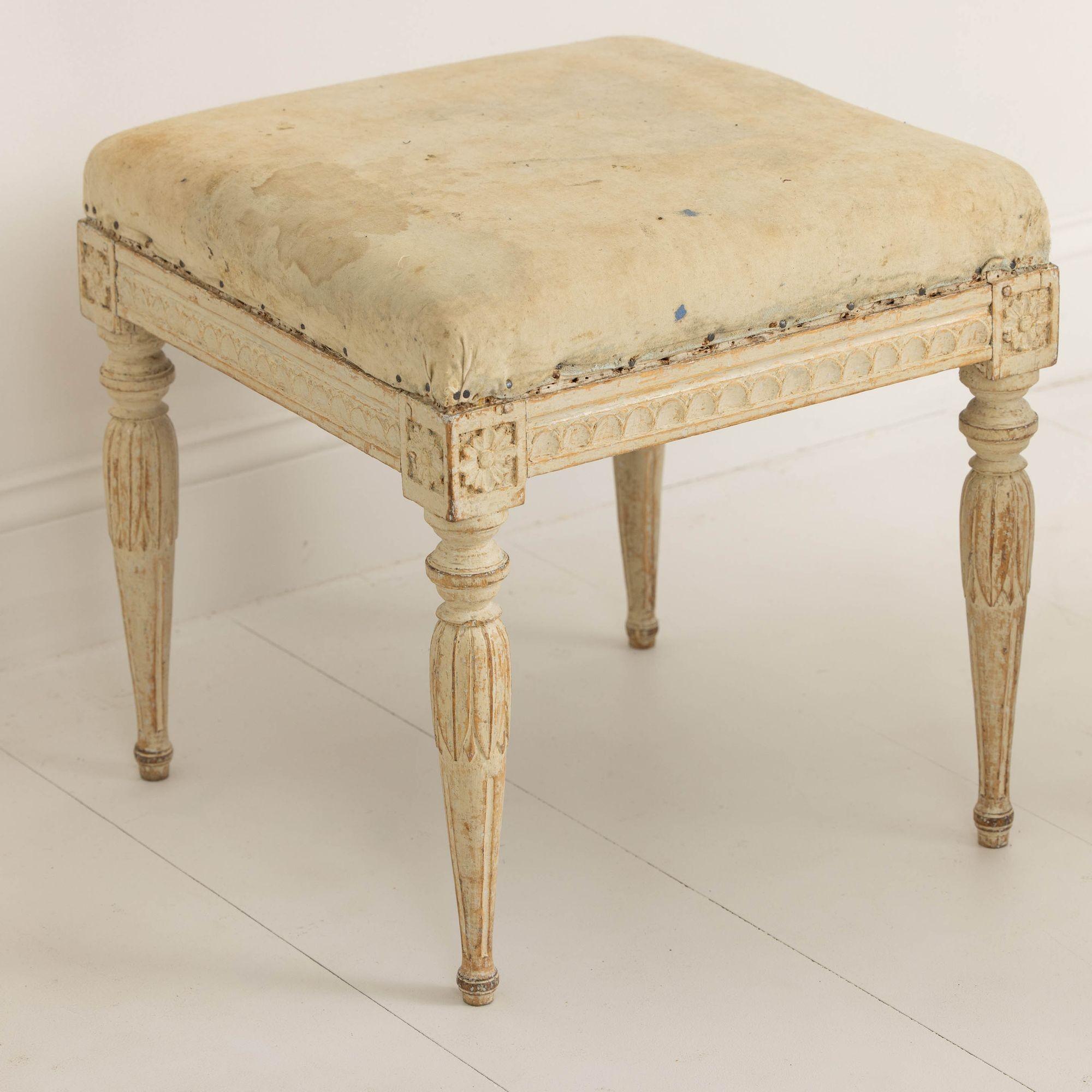 A charming pair of Swedish benches from the early Gustavian period in original paint, circa 1780. These stools display beautiful carved egg and dart detail on the seat frame, rosettes on the corner posts, and acanthus leaves on round, tapered legs.