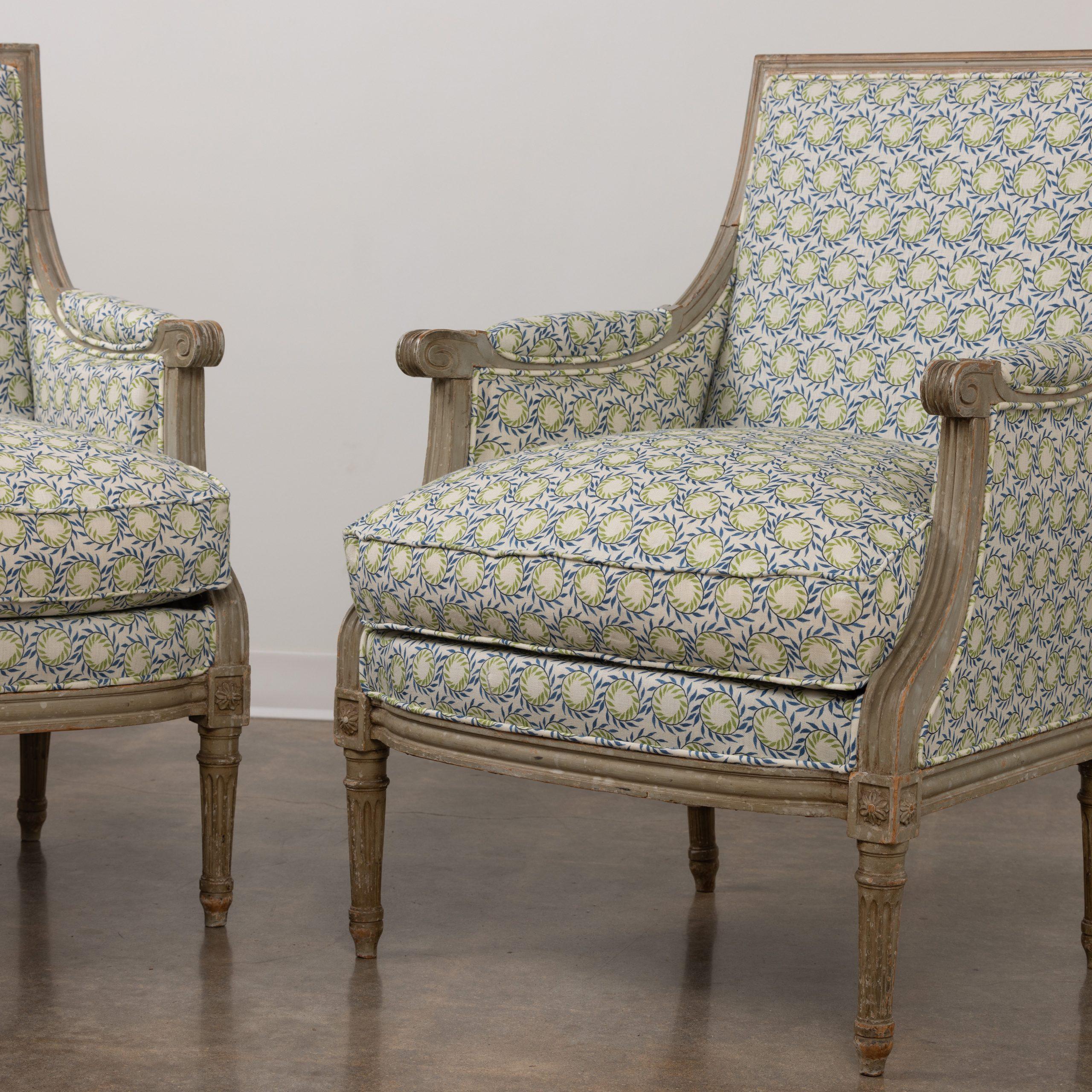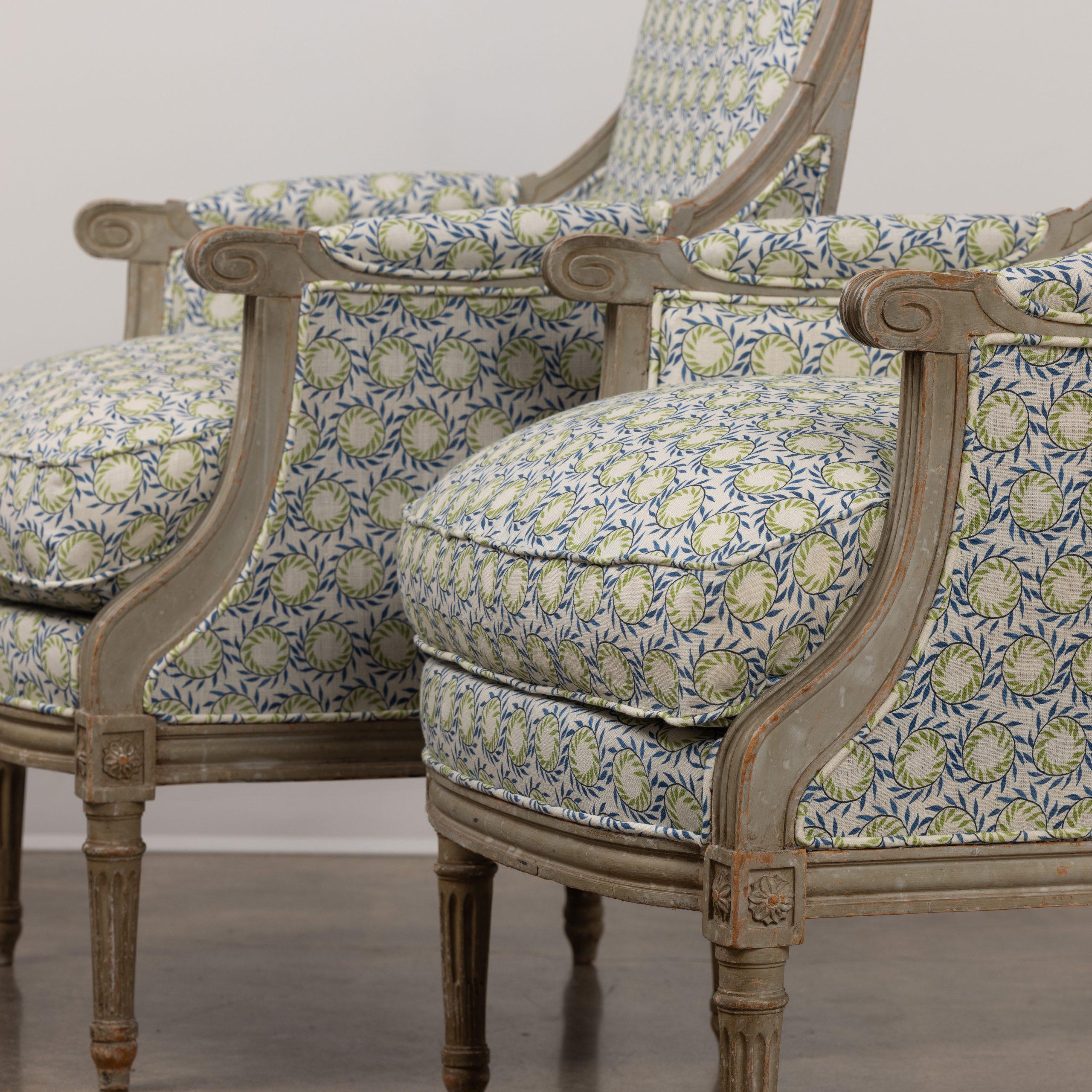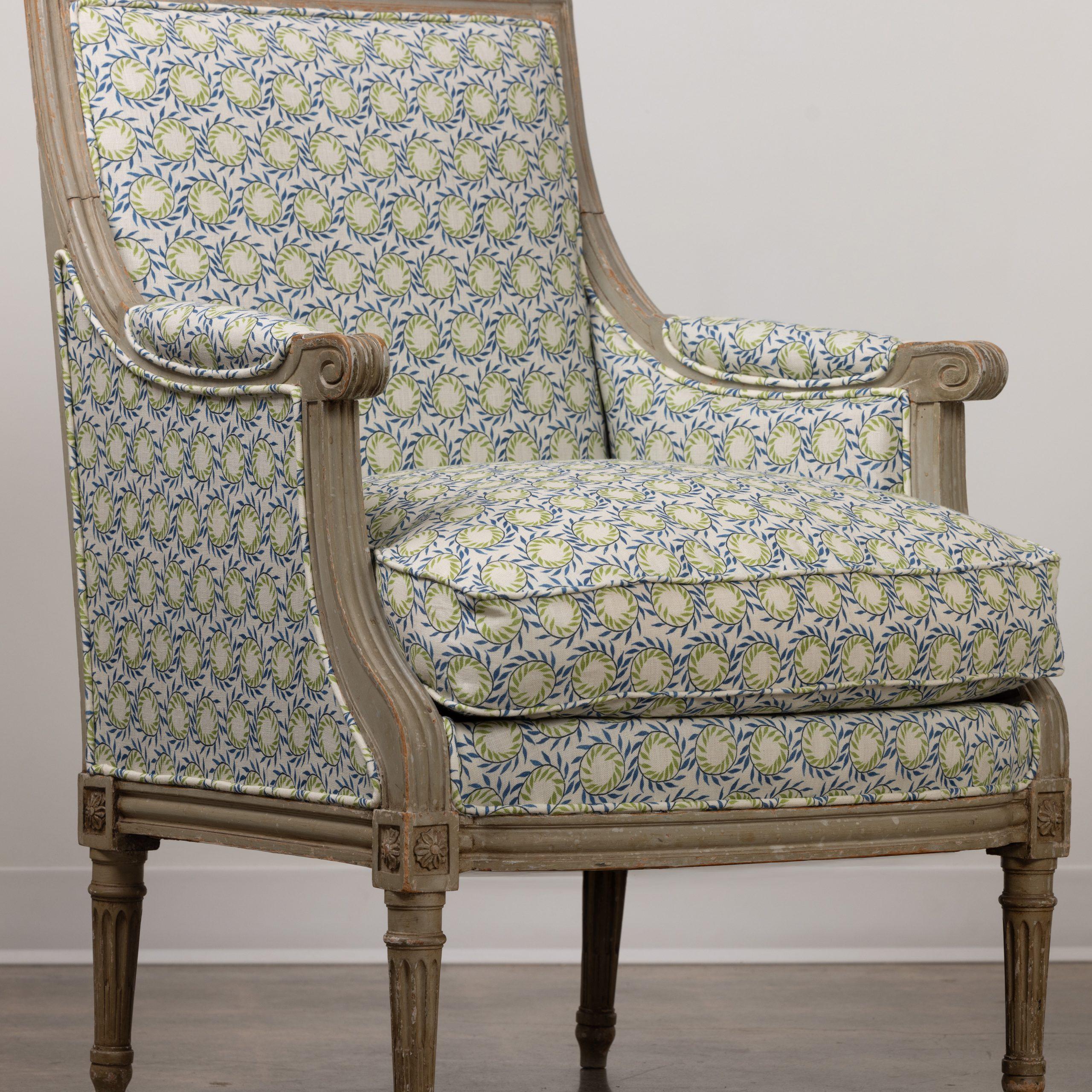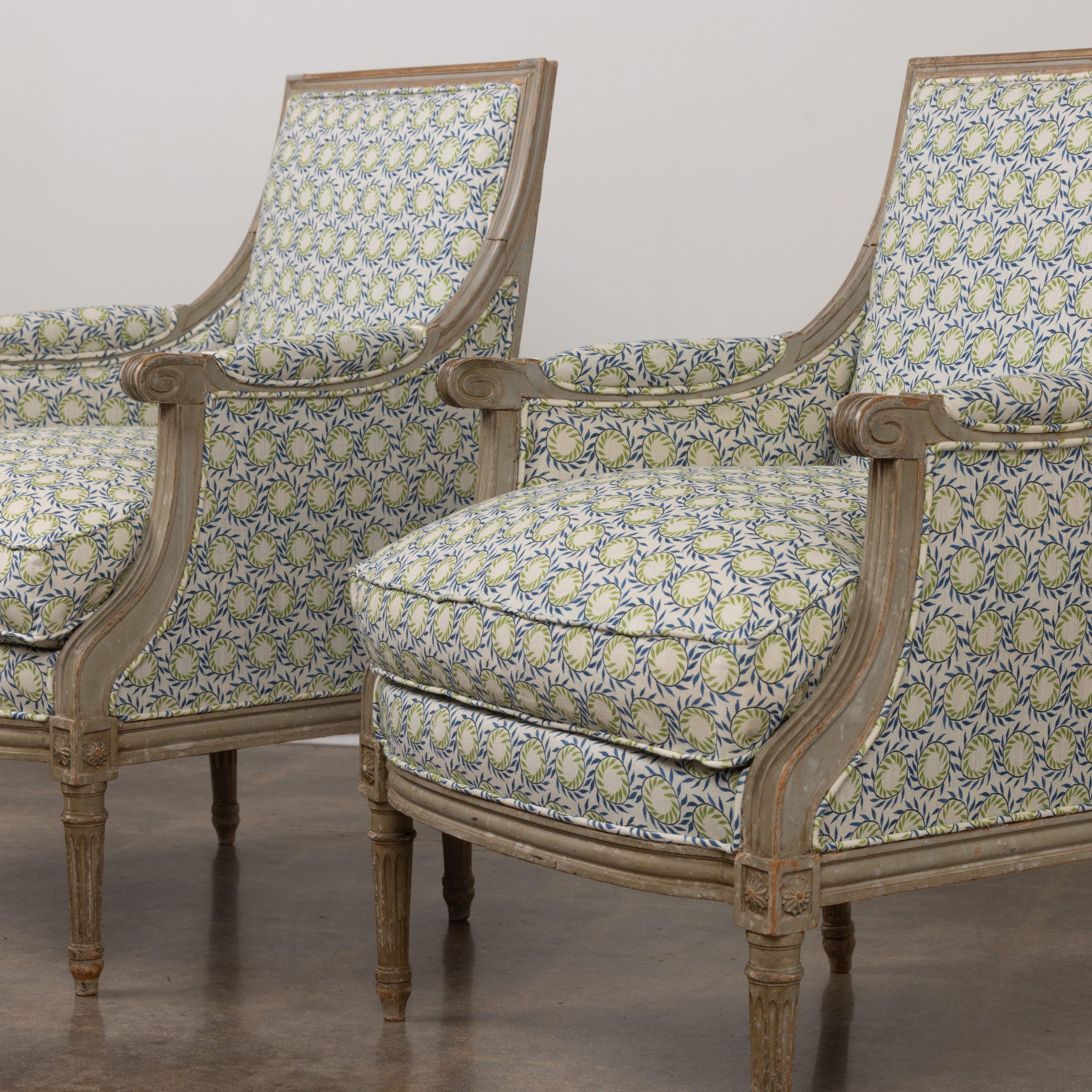 A pair of French Louis XVI style bergères in original paint from the 19th century. Rosettes on the corner posts with tapered and fluted legs. Newly upholstered in a smart blue and green fabric. These beautiful chairs are very comfortable.