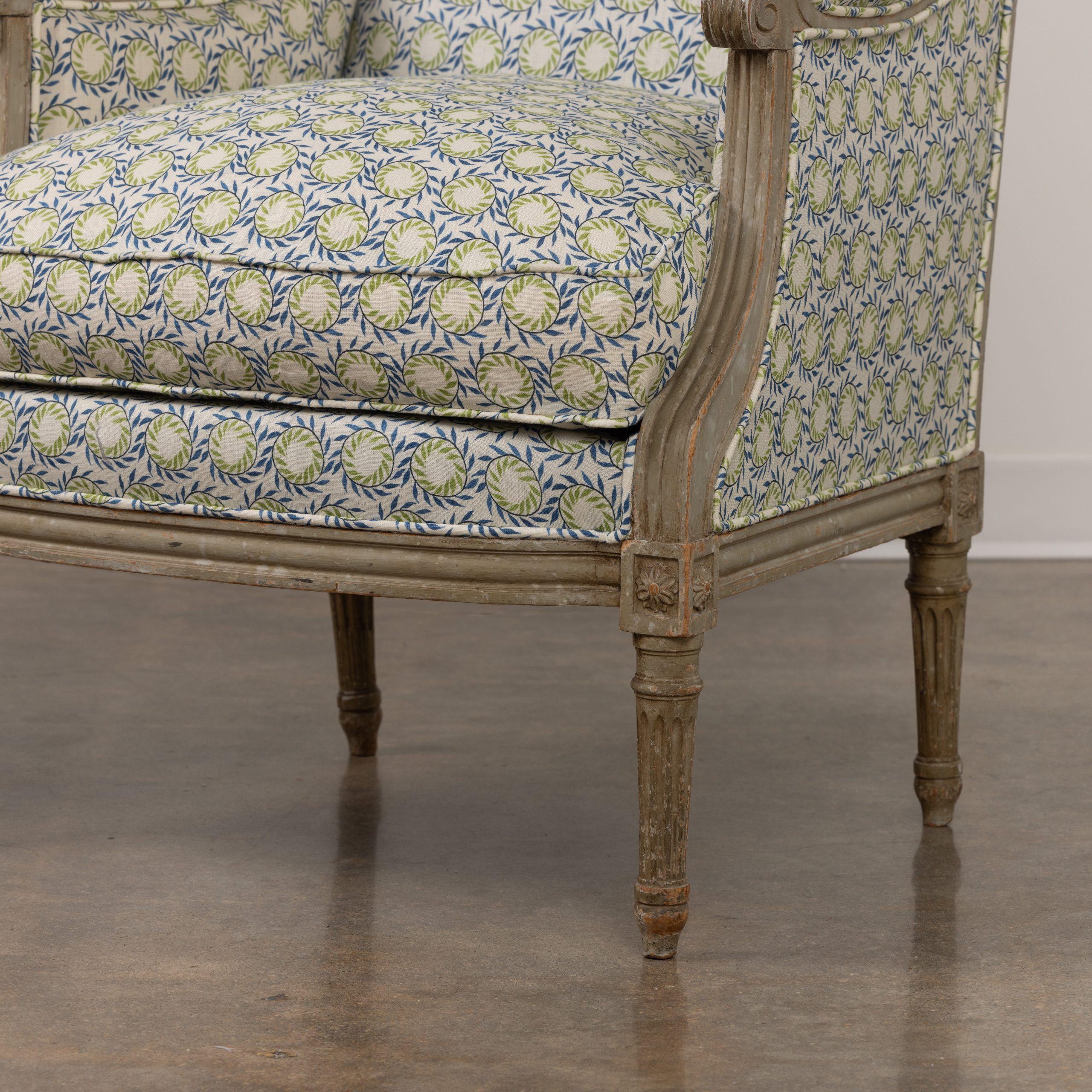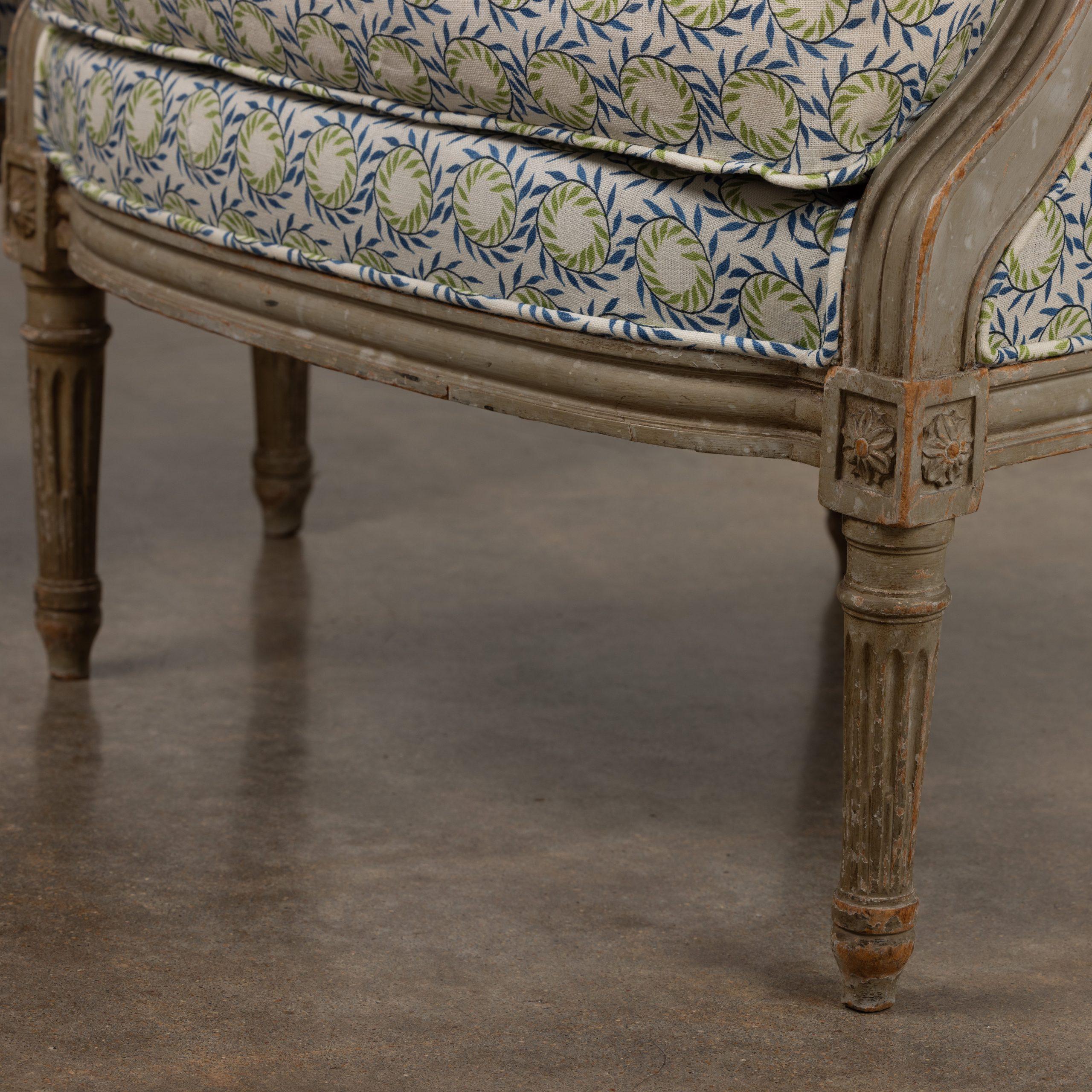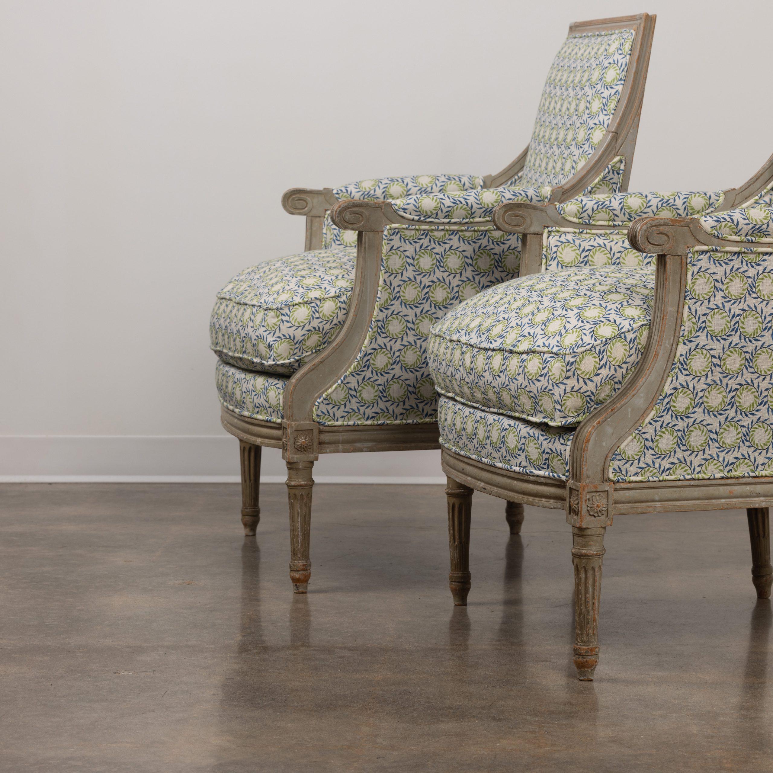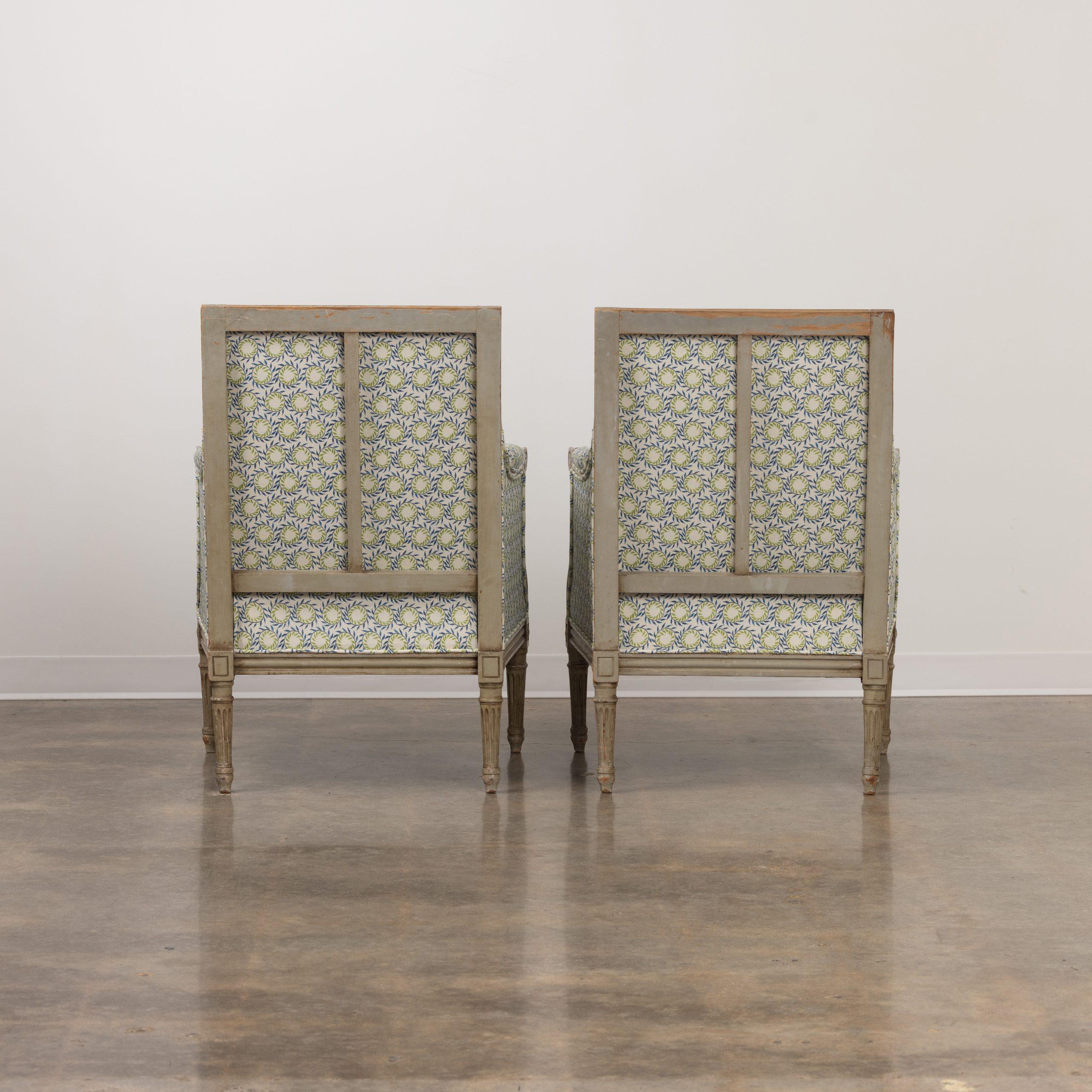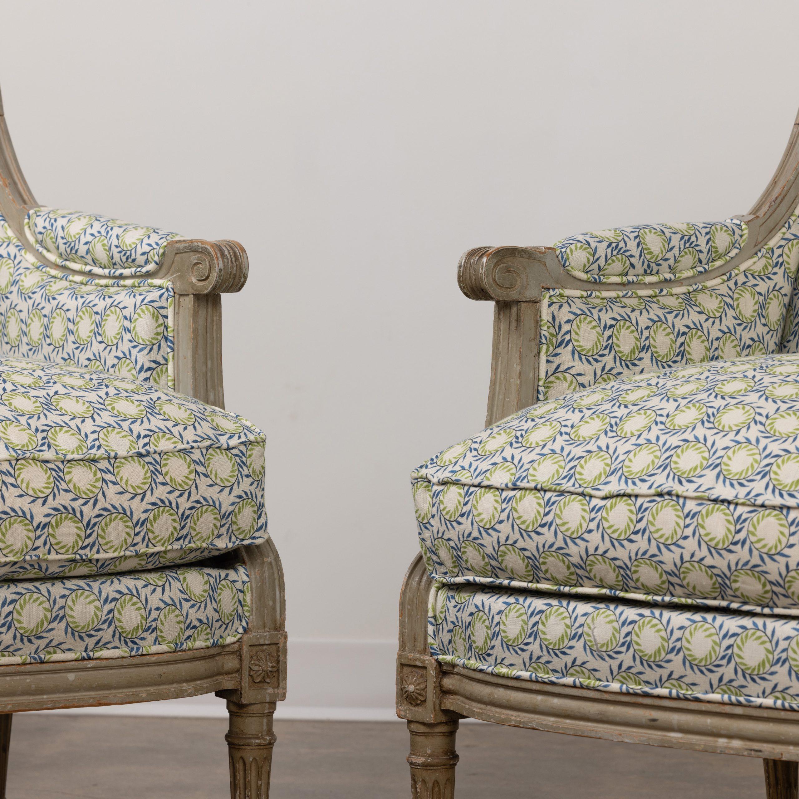 A pair of French Louis XVI style bergères in original paint from the 19th century. Rosettes on the corner posts with tapered and fluted legs. Newly upholstered in a smart blue and green fabric. These beautiful chairs are very comfortable.