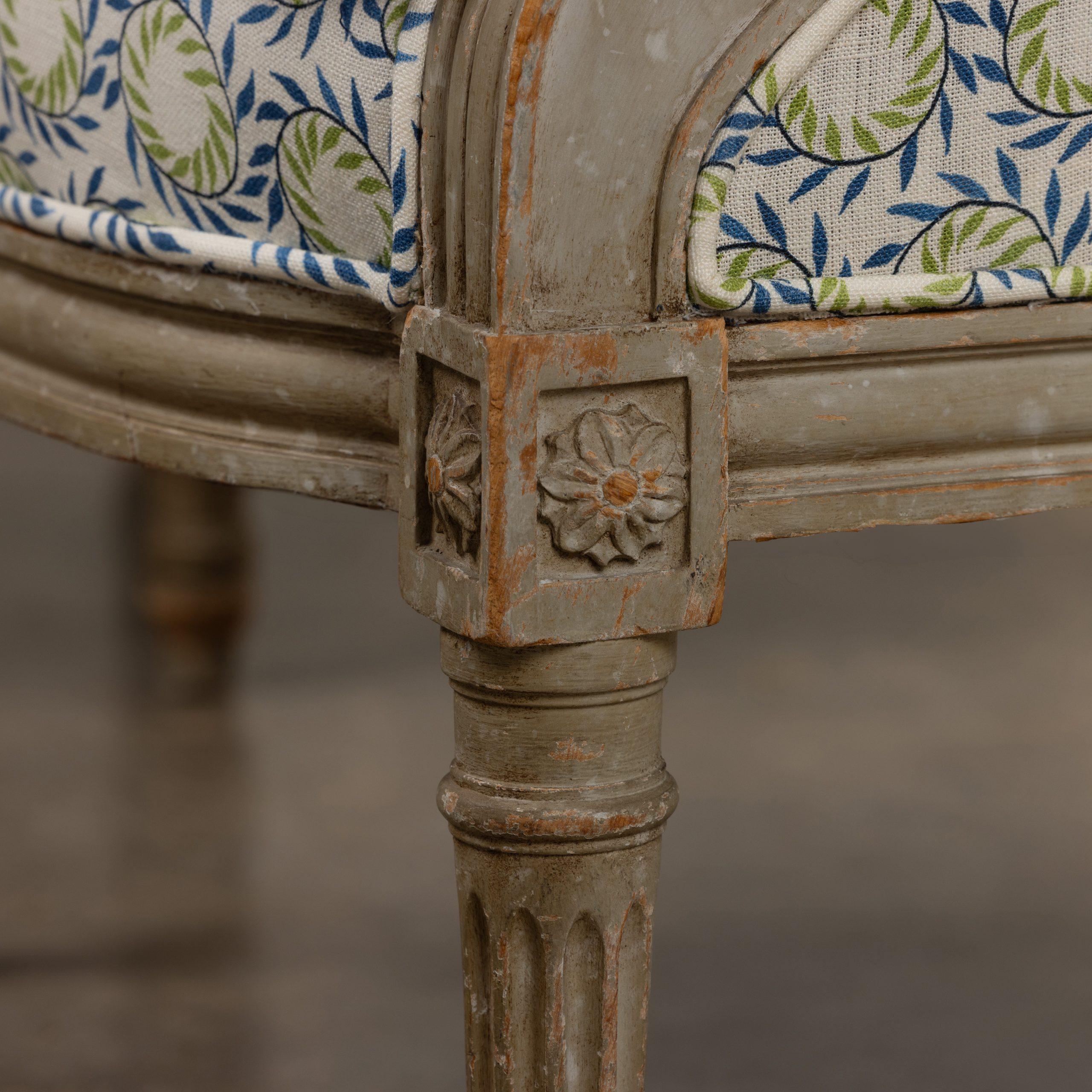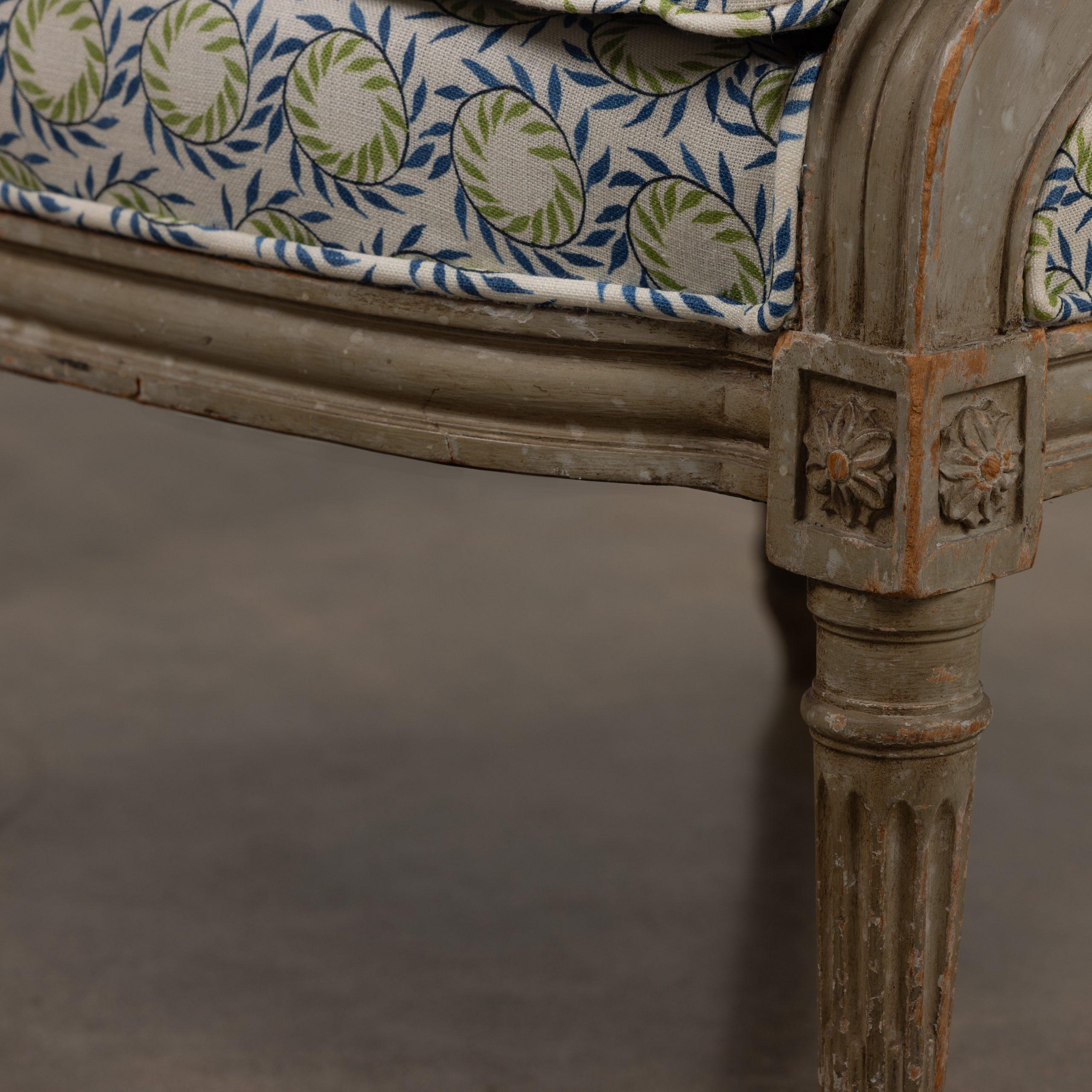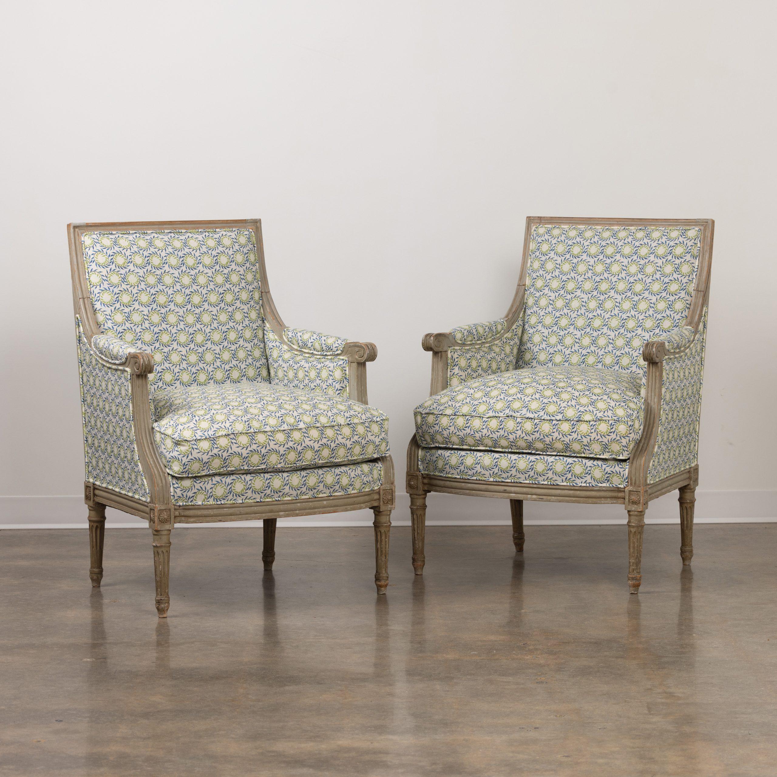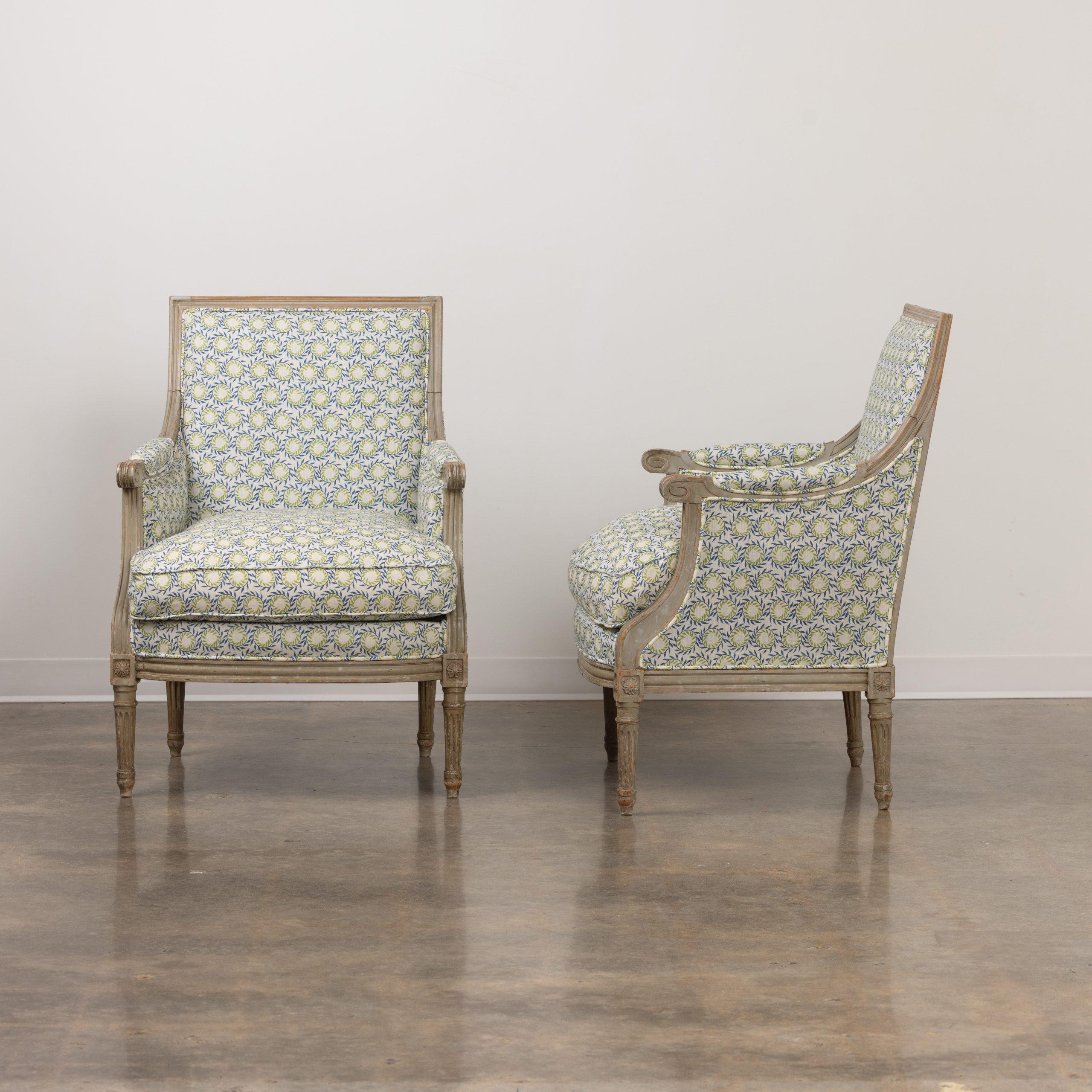 A pair of French Louis XVI style bergères in original paint from the 19th century. Rosettes on the corner posts with tapered and fluted legs. Newly upholstered in a smart blue and green fabric. These beautiful chairs are very comfortable.