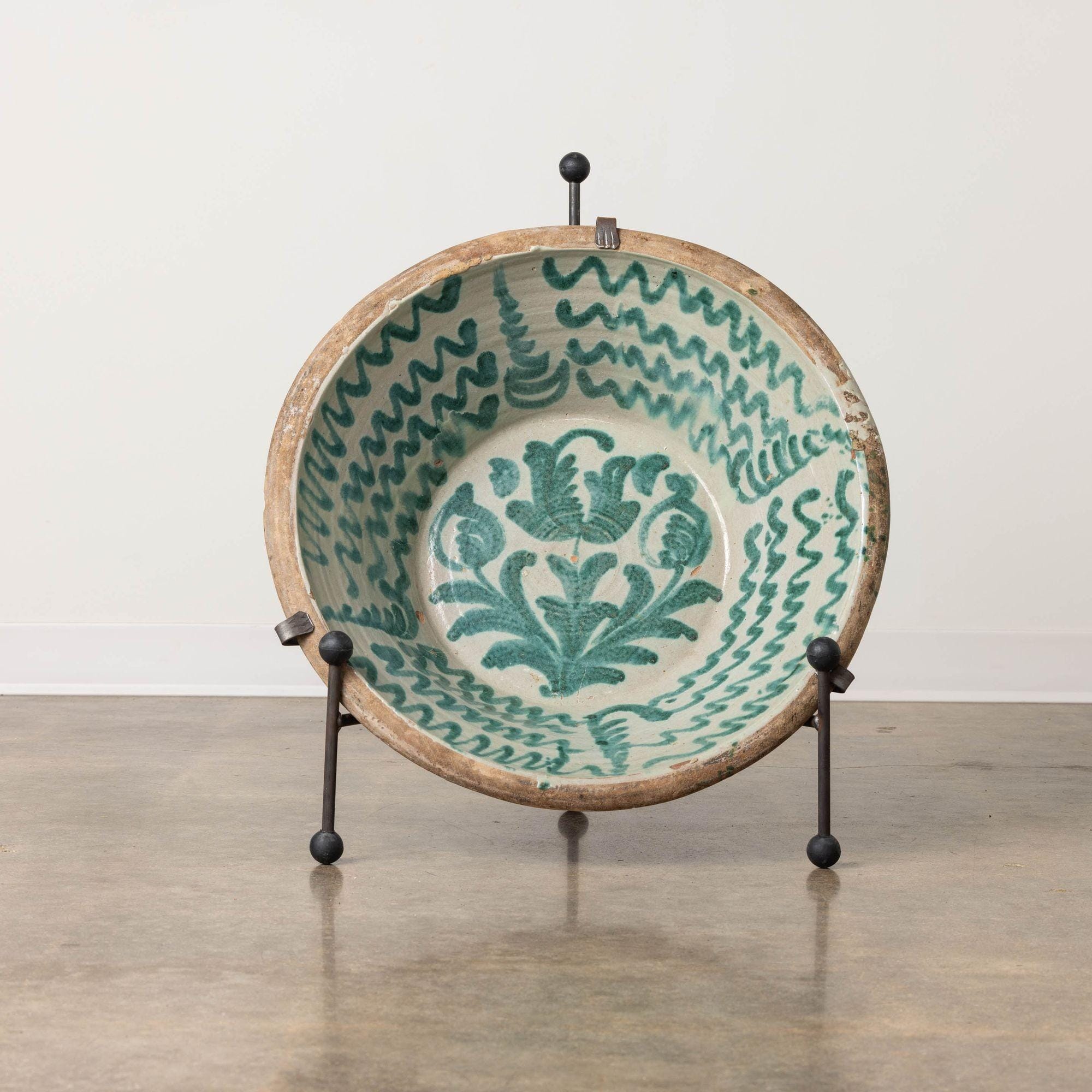 A large 18th c. Spanish Fajalauza “Lebrillo” from Granada. Circa 1780. A lebrillo is a large ceramic bowl with a rim. The origins are the Spanish Moresque. Named Fajalauza after the Nasri door of the Albaicin where the largest production center of the ceramist was located. This antique glazed terracotta bowl features a green lily flower with decorative sides over a milk-white base. In the past, this bowl was used for household chores such as cooking, washing clothes, and bathing children. Sold with both a hand-forged iron stand and wall-mount hanger. We have other bowls available. Please inquire for more details.