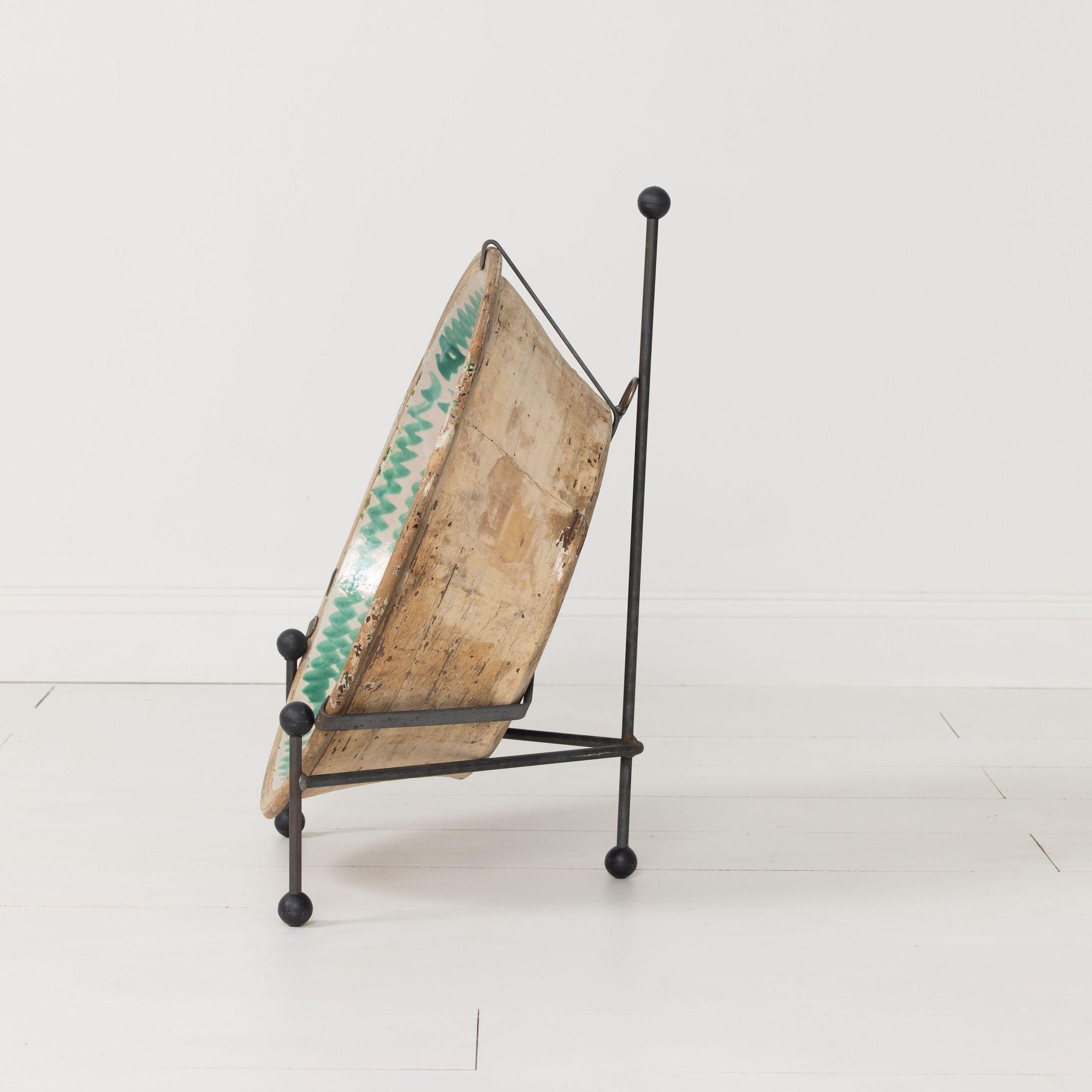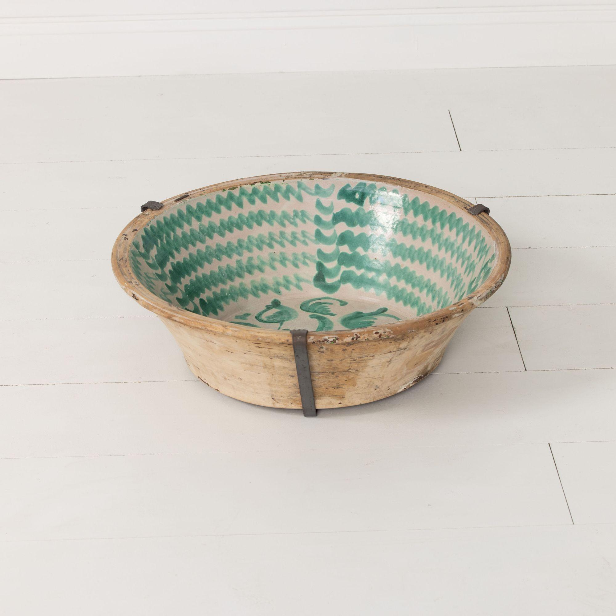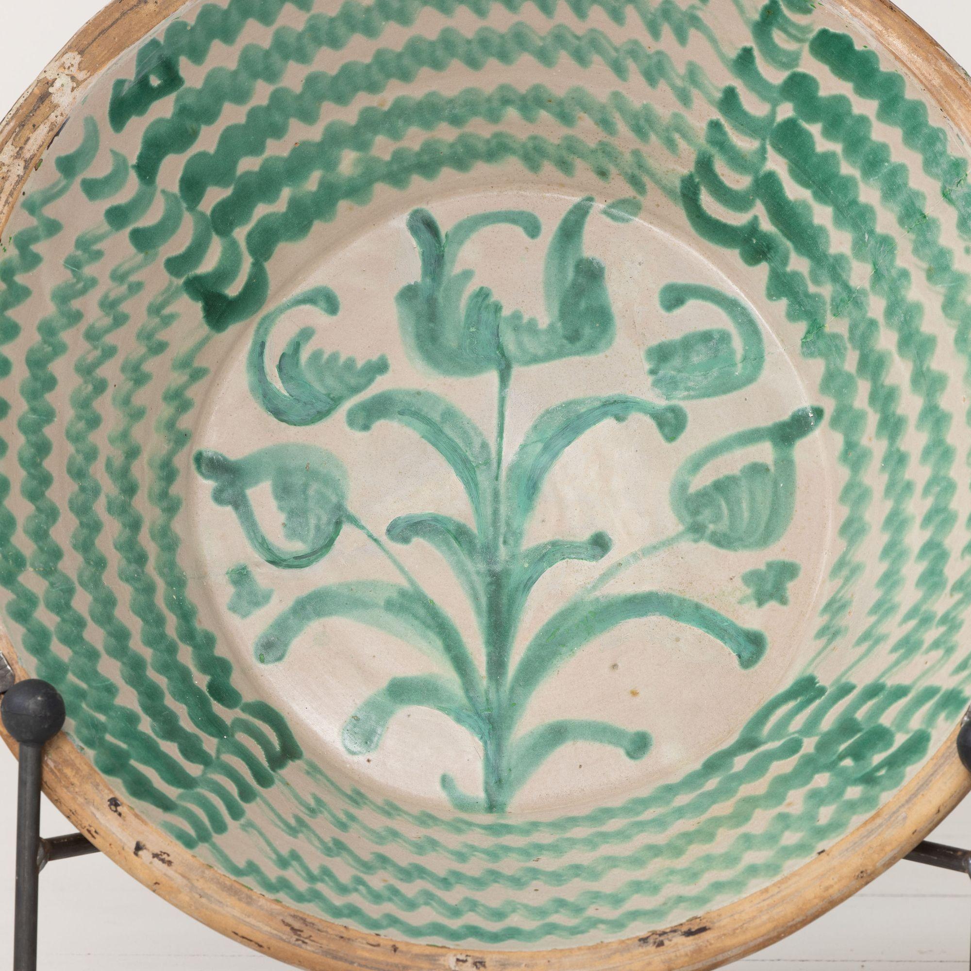 A large 19th c. Spanish Fajalauza “Lebrillo” from Granada. Circa 1880. A lebrillo is a large ceramic bowl with a rim. The origins are the Spanish Moresque. Named Fajalauza after the Nasri door of the Albaicin where the largest production center of the ceramist was located. This antique glazed terracotta bowl features a green lily flower with decorative sides over a milk-white base. In the past, this bowl was used for household chores such as cooking, washing clothes, and bathing children. Sold with both a hand-forged iron stand and wall-mount hanger. We have a collection of 10 bowls available. Please inquire for more details.