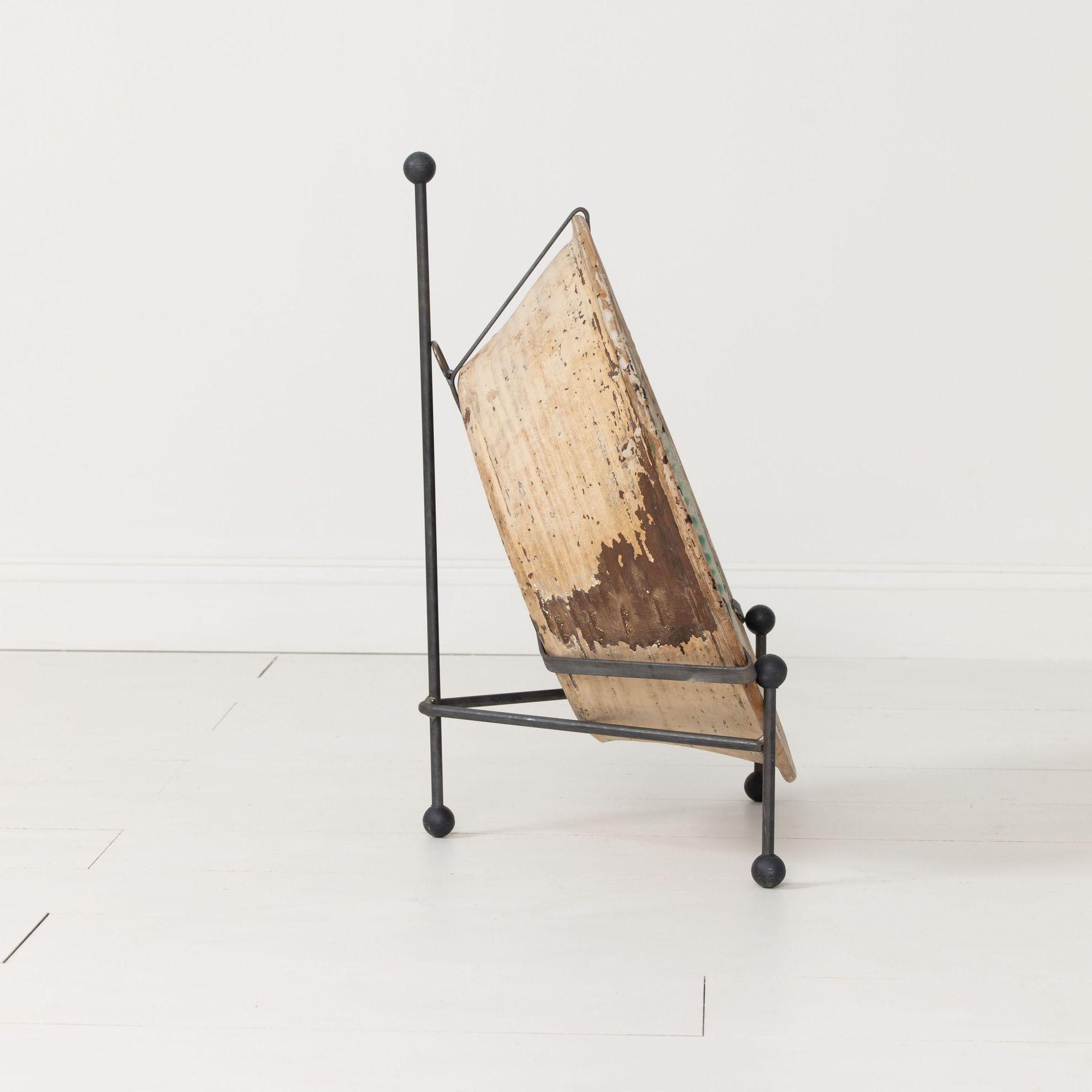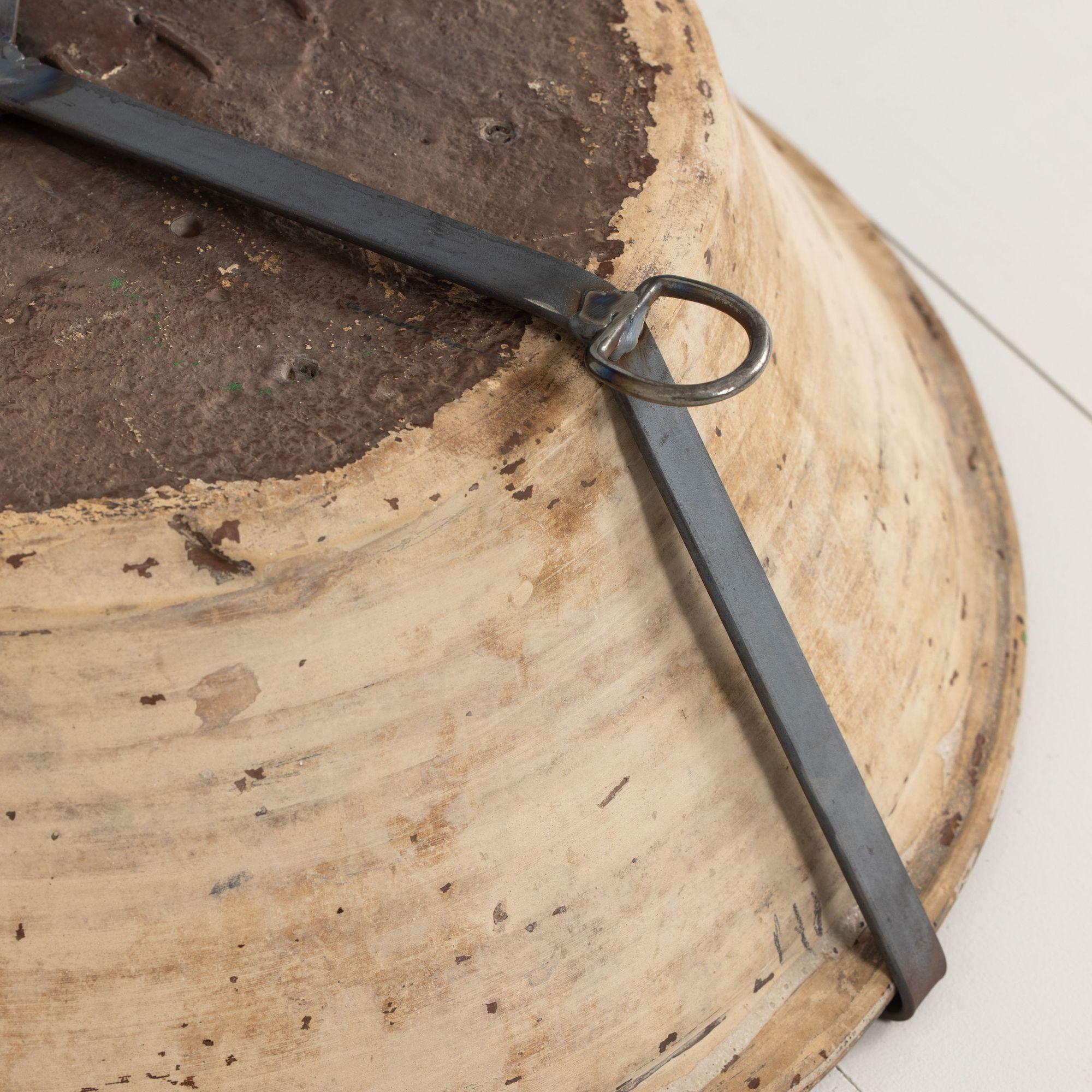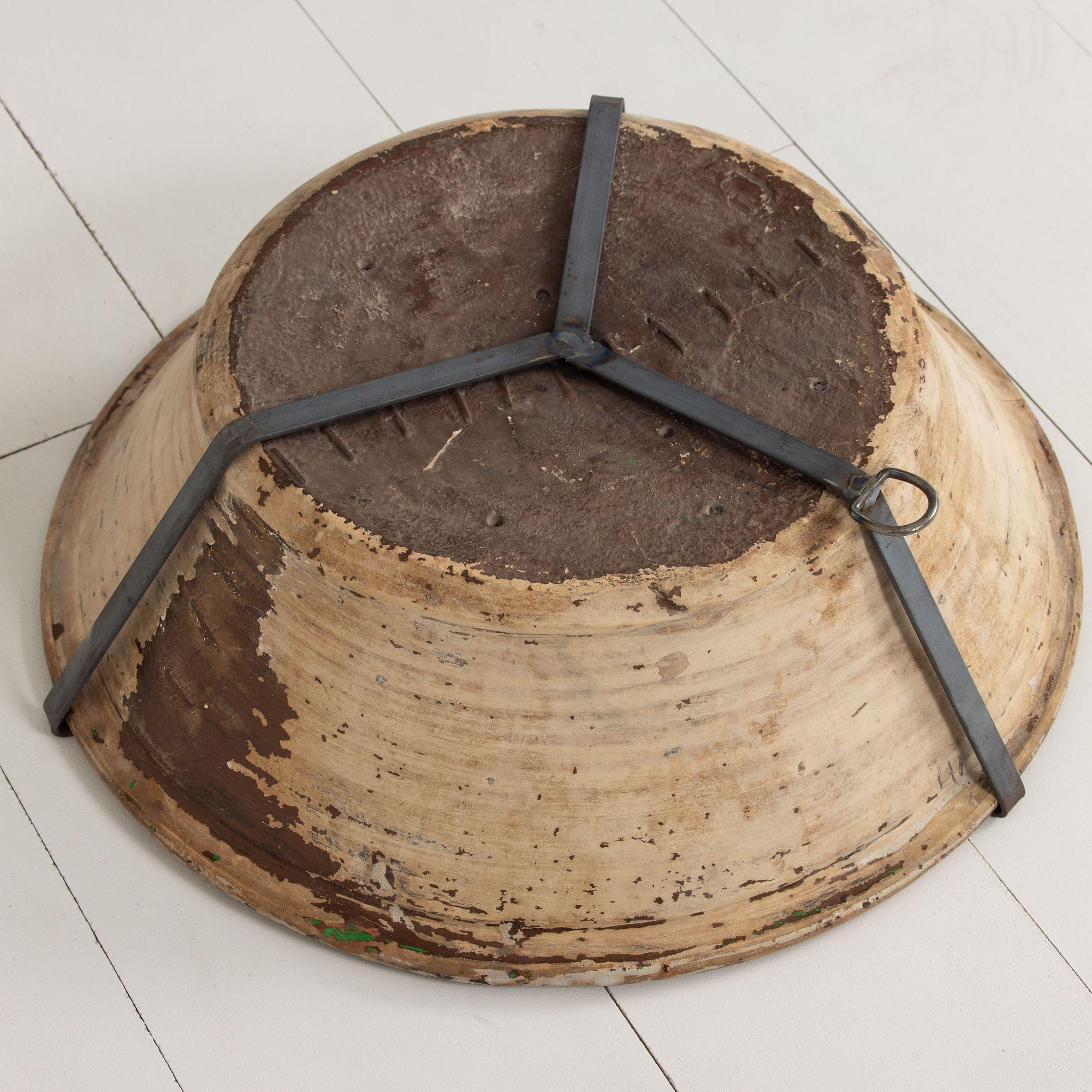 A large 19th c. Spanish Fajalauza “Lebrillo” from Granada. Circa 1880. A lebrillo is a large ceramic bowl with a rim. The origins are the Spanish Moresque. Named Fajalauza after the Nasri door of the Albaicin where the largest production center of the ceramist was located. This antique glazed terracotta bowl features a green lily flower with decorative sides over a milk-white base. In the past, this bowl was used for household chores such as cooking, washing clothes, and bathing children. Sold with both a hand-forged iron stand and wall-mount hanger. We have a collection of 10 bowls available. Please inquire for more details.