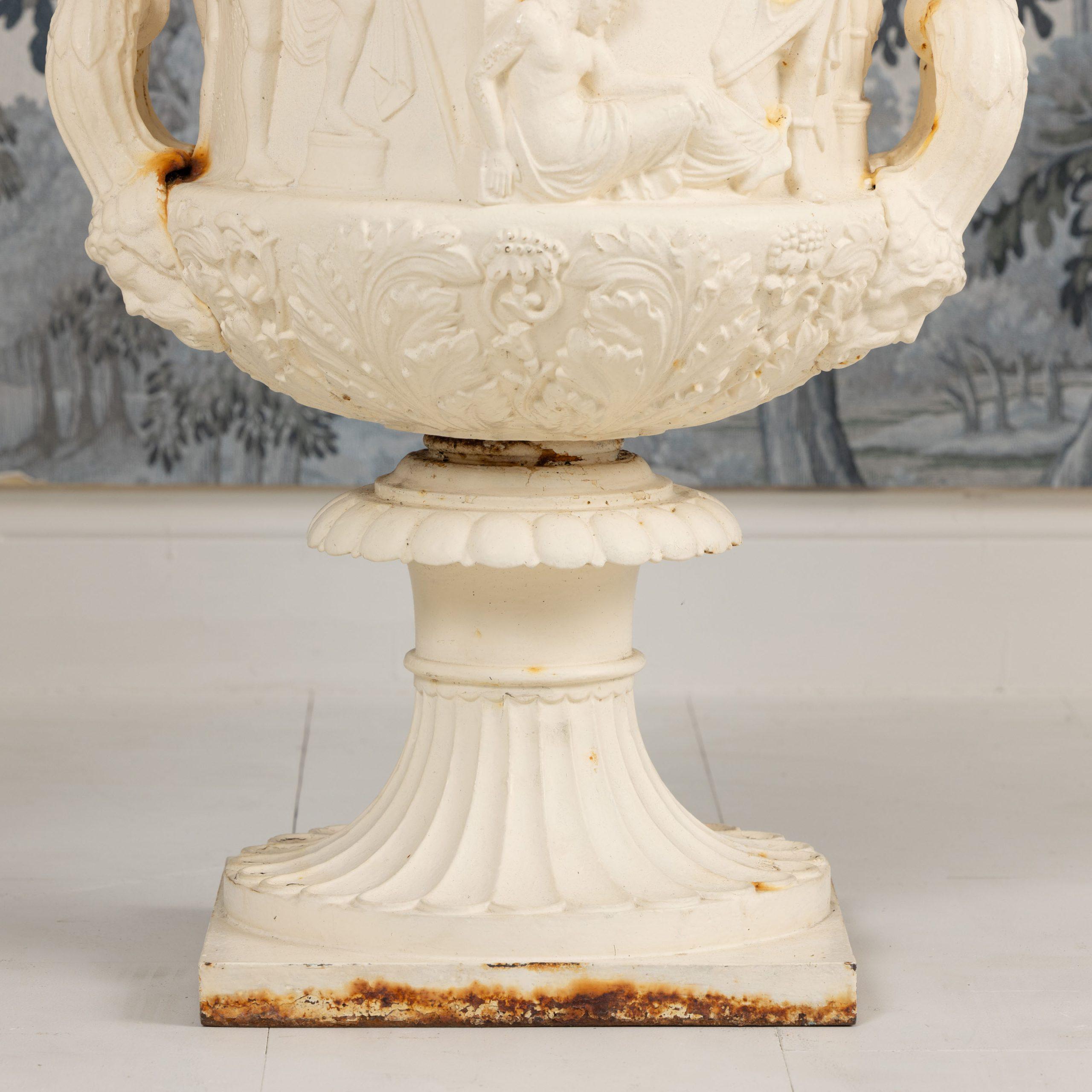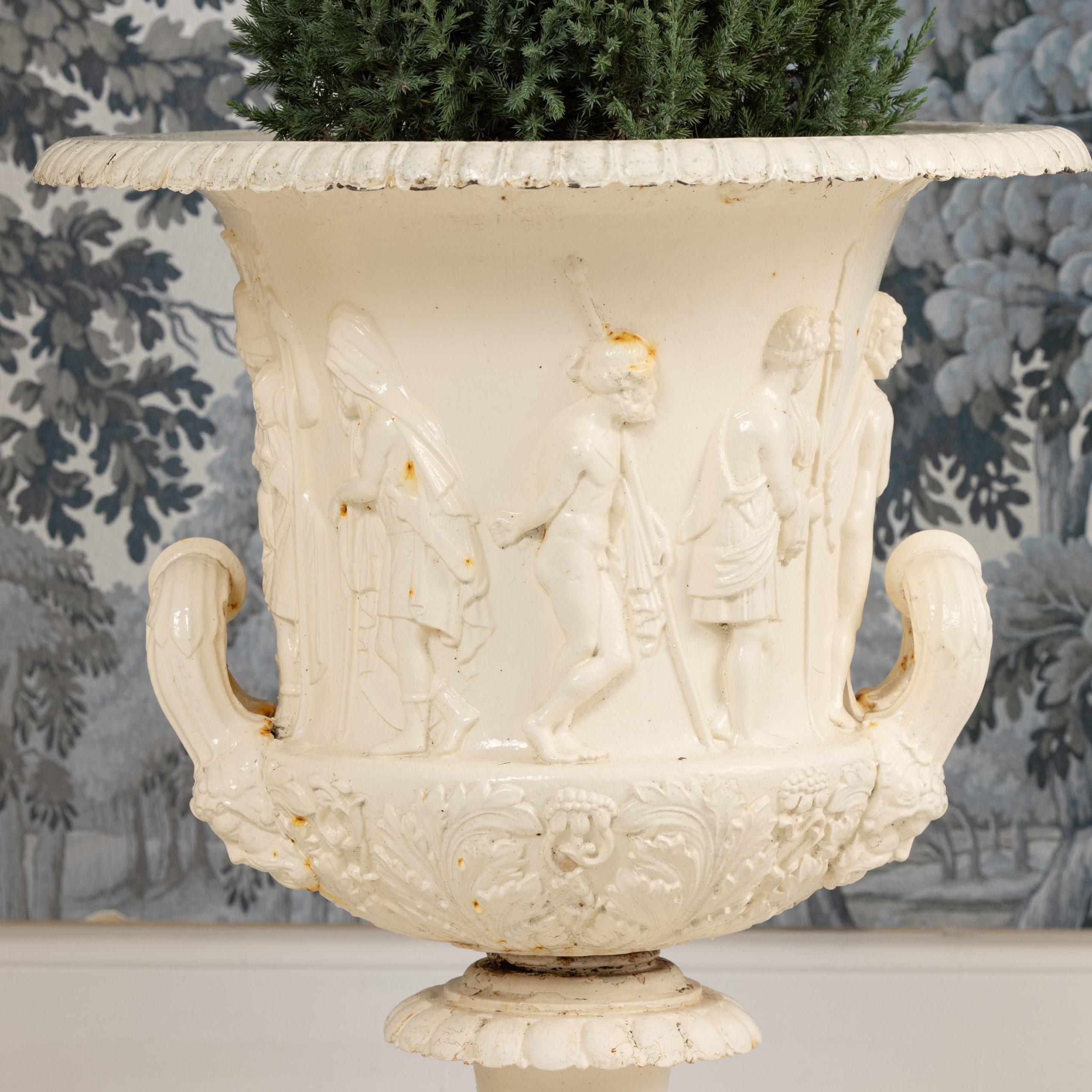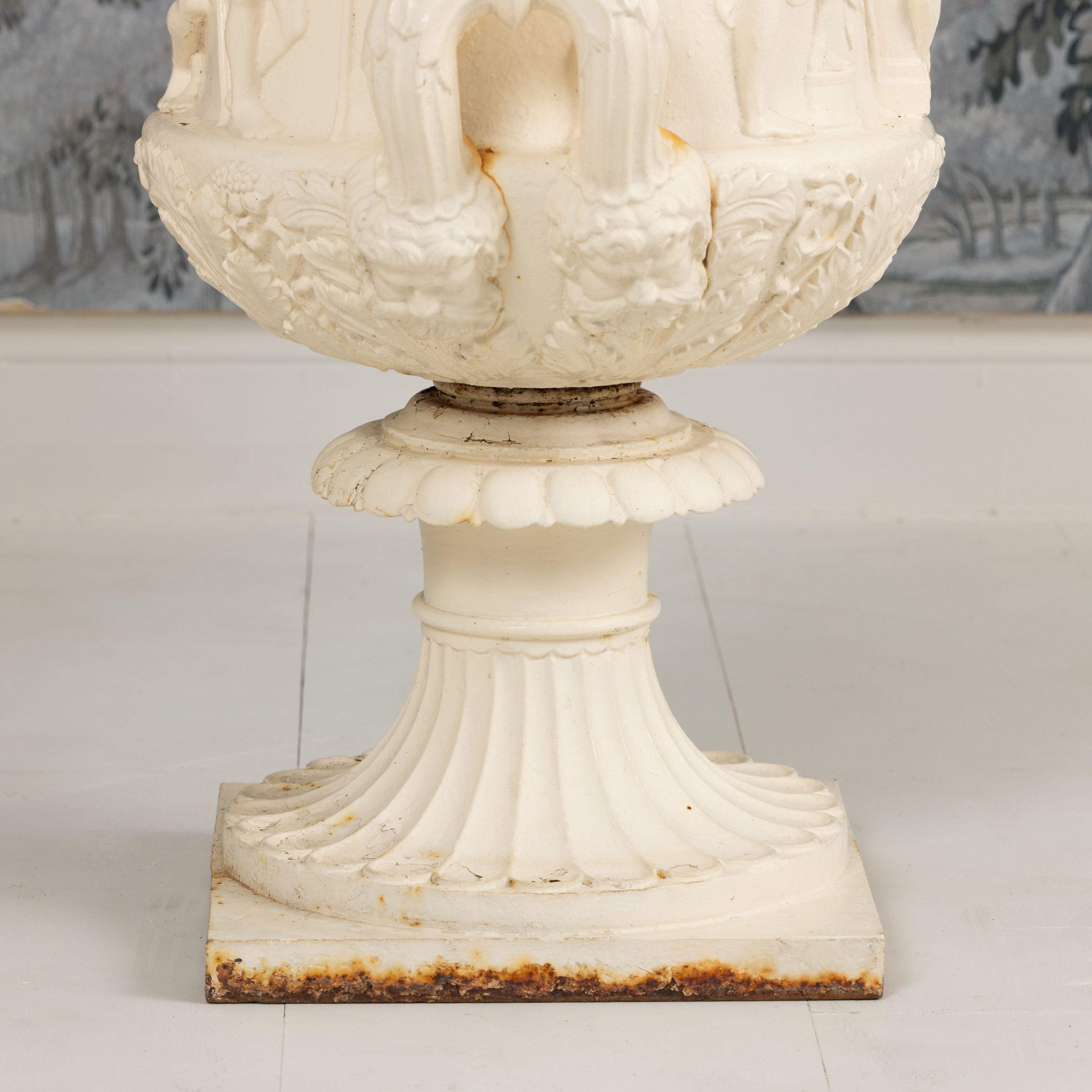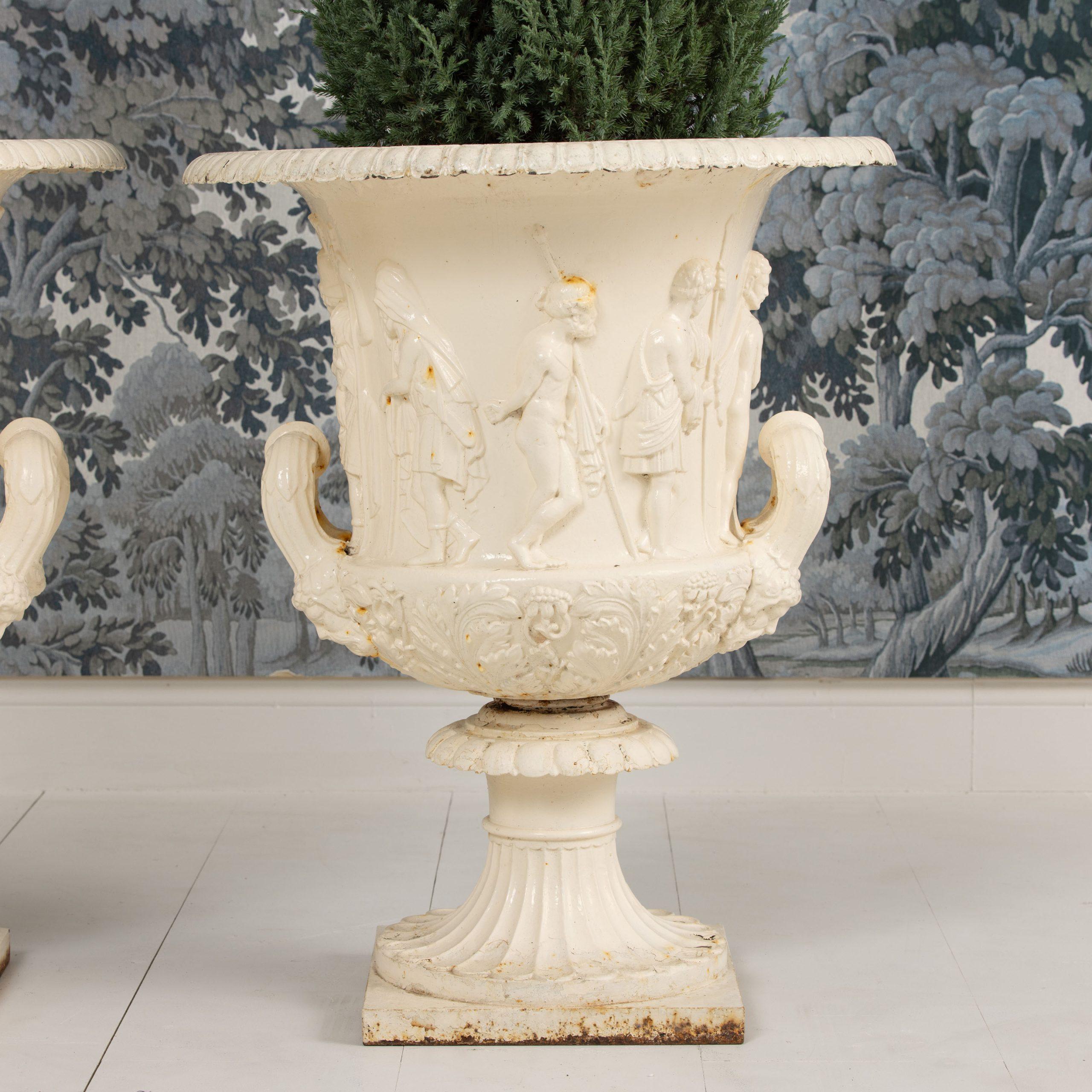 A spectacular pair of painted cast iron urns after the Medici and Borghese models attributed to the Handyside Foundry. Reeded handles, floriate campana bodies, cast with friezes of classical figures on fluted pedestals. Grand size with a beautiful, aged patina.