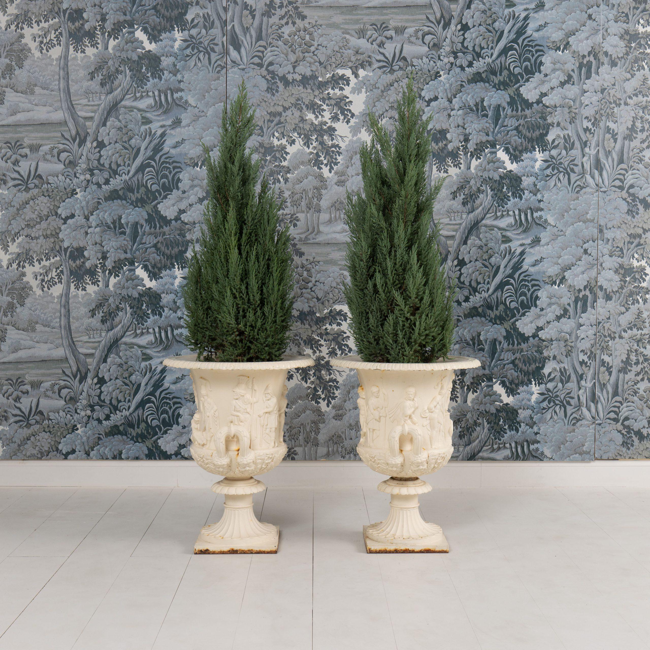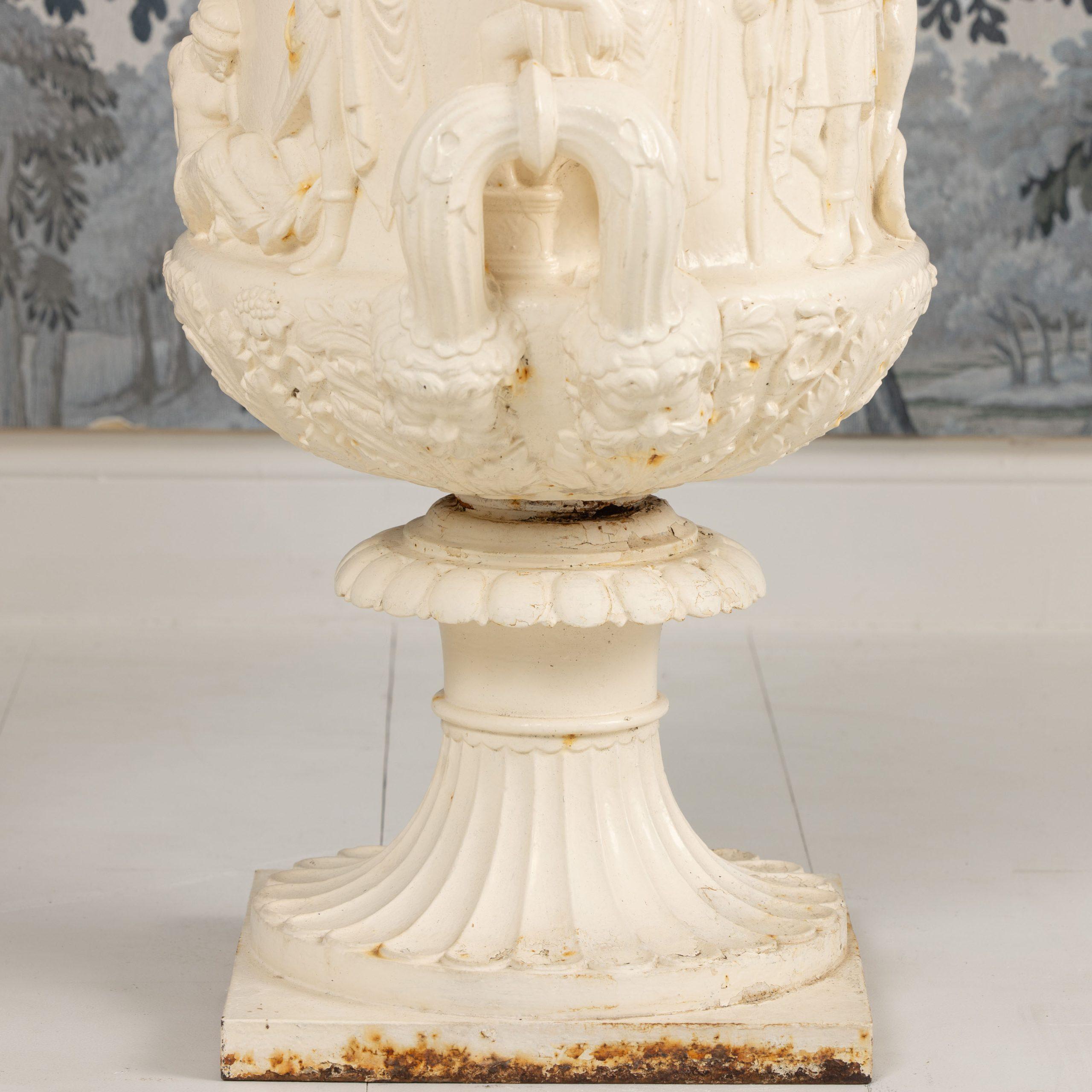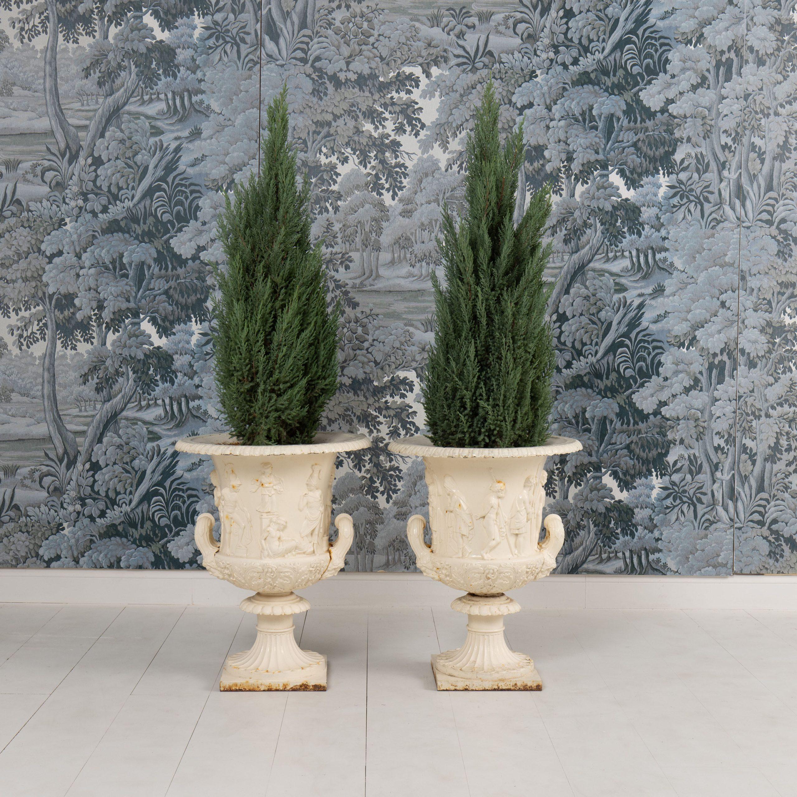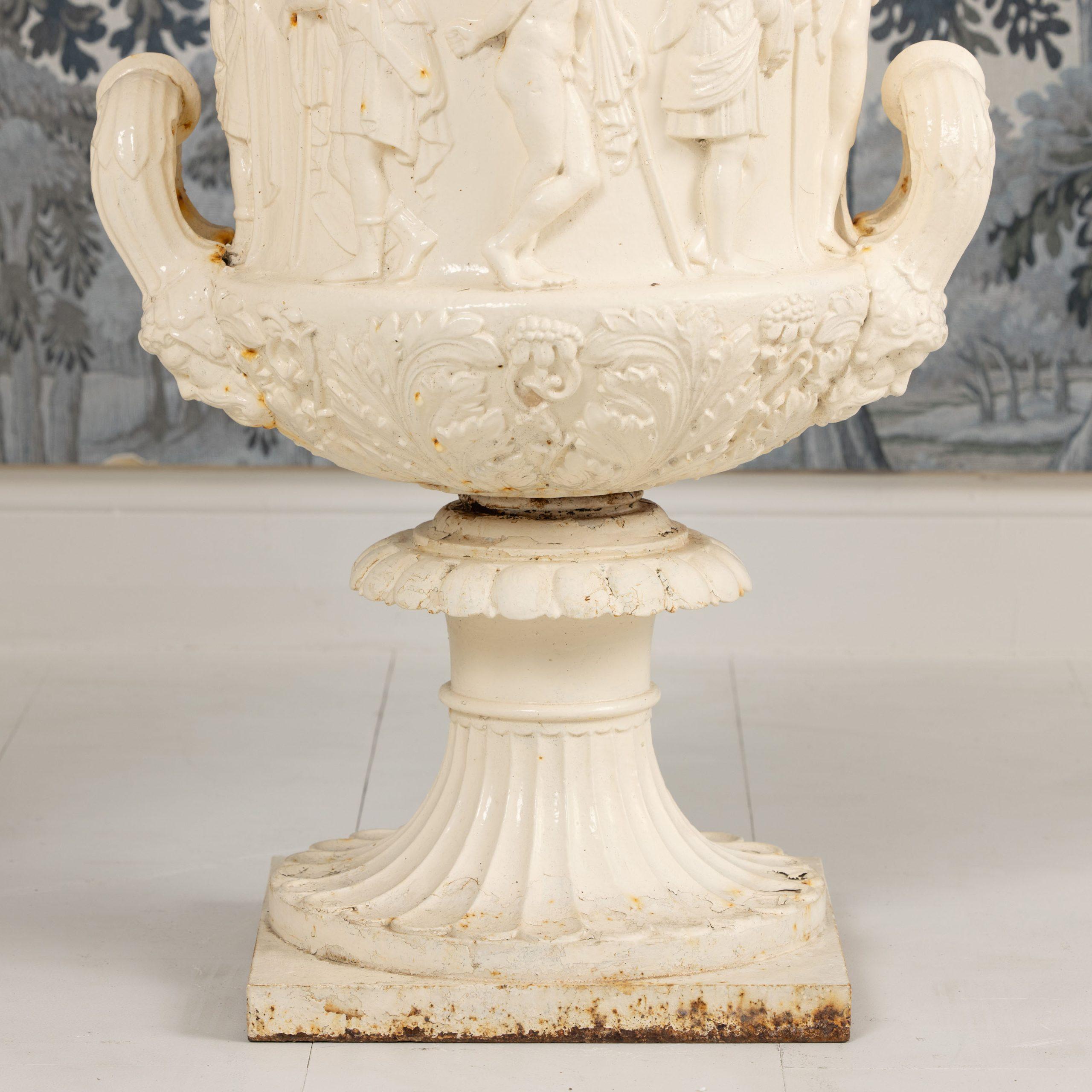 A spectacular pair of painted cast iron urns after the Medici and Borghese models attributed to the Handyside Foundry. Reeded handles, floriate campana bodies, cast with friezes of classical figures on fluted pedestals. Grand size with a beautiful, aged patina.