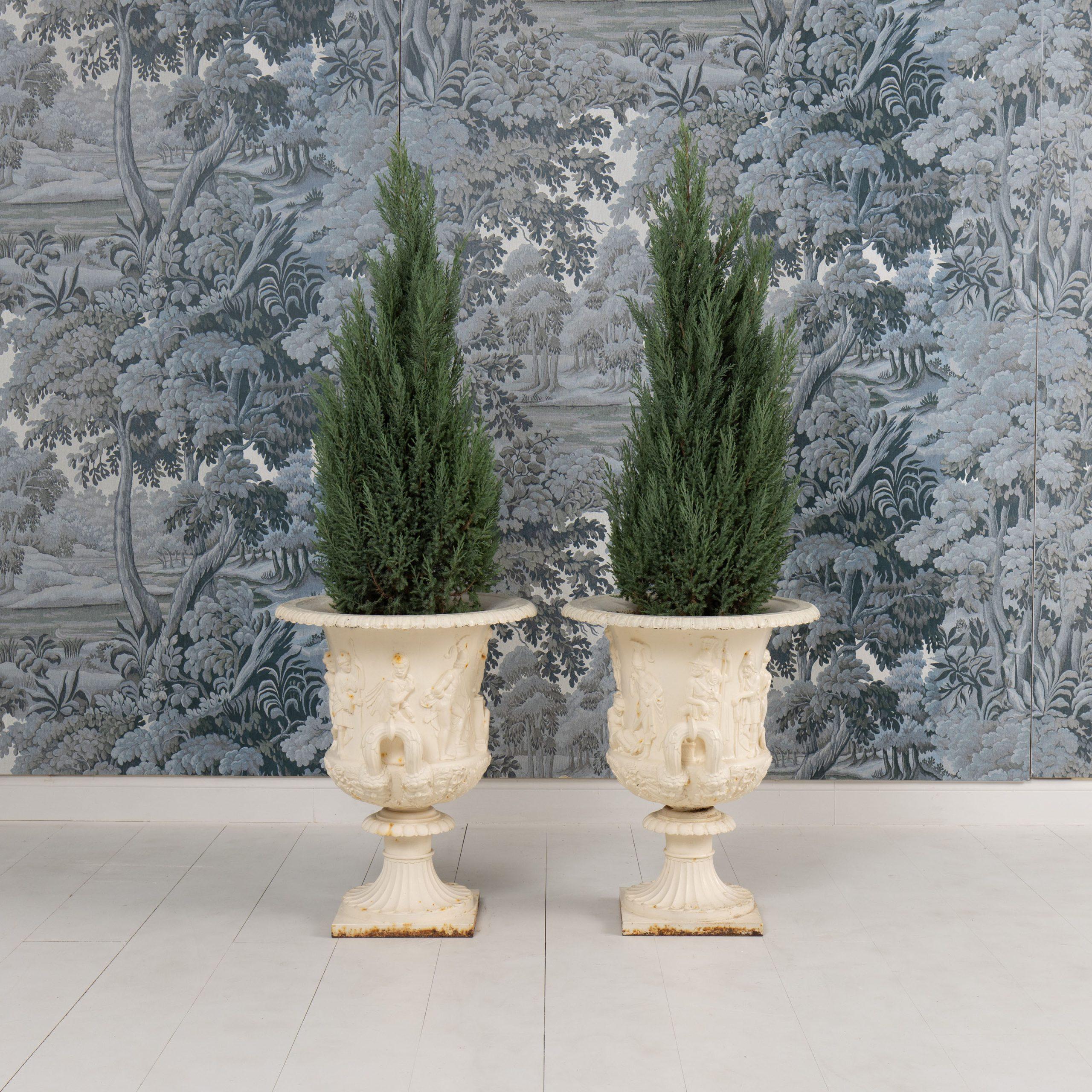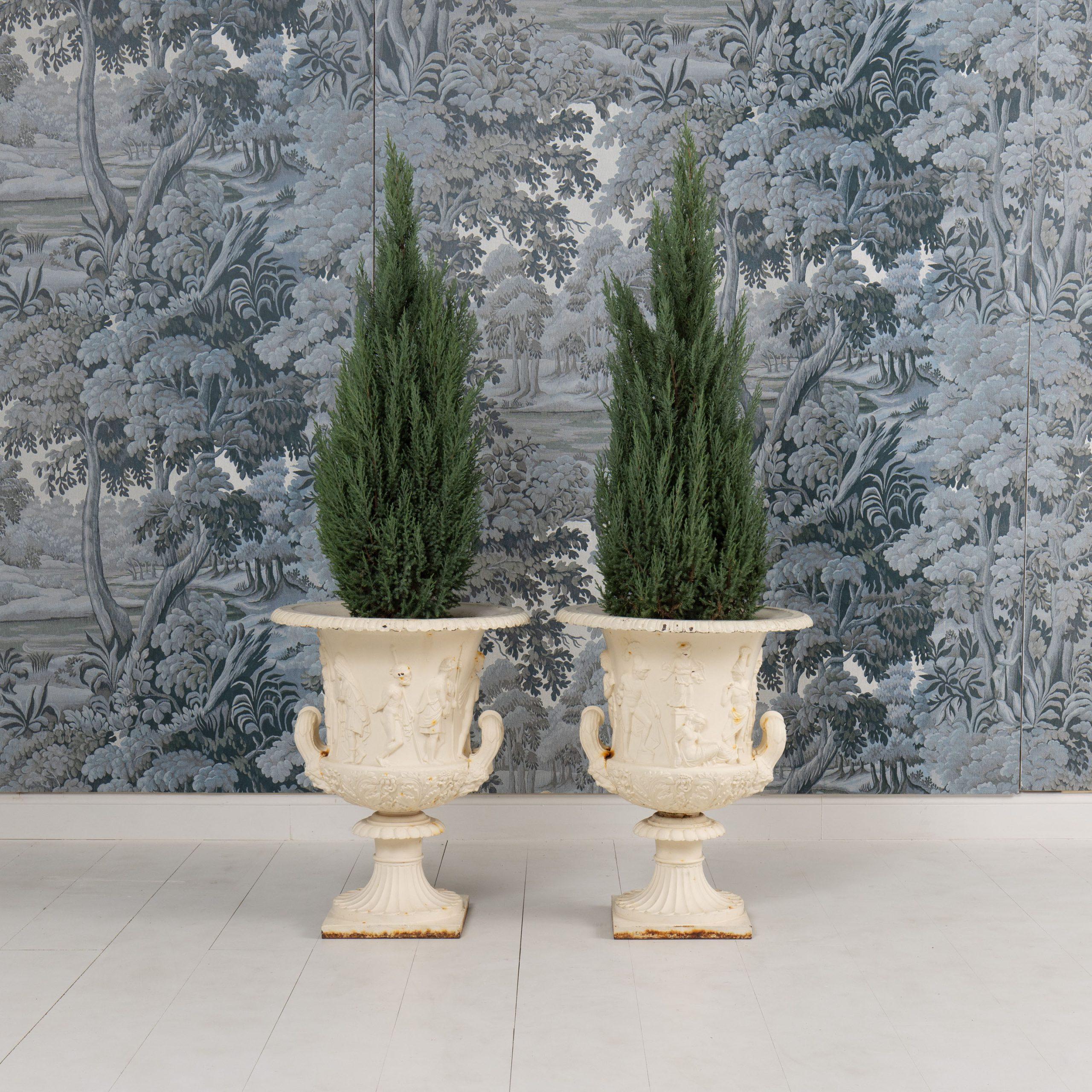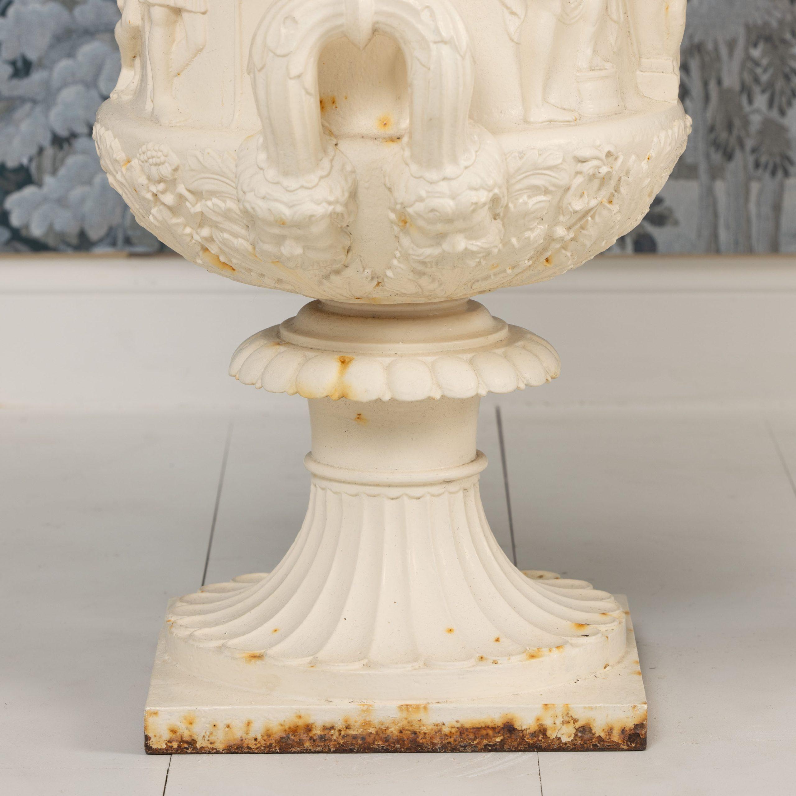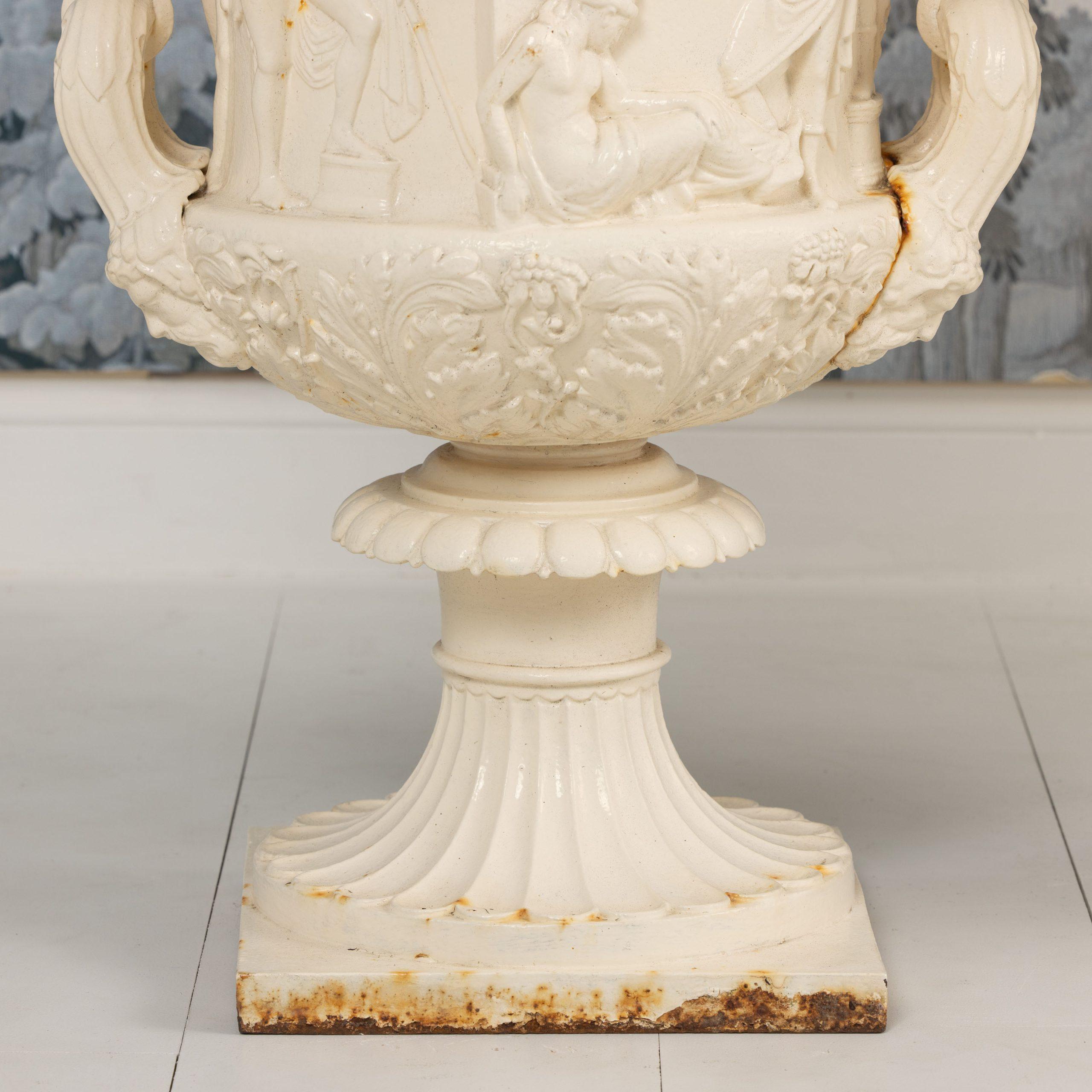 A spectacular pair of painted cast iron urns after the Medici and Borghese models attributed to the Handyside Foundry. Reeded handles, floriate campana bodies, cast with friezes of classical figures on fluted pedestals. Grand size with a beautiful, aged patina.