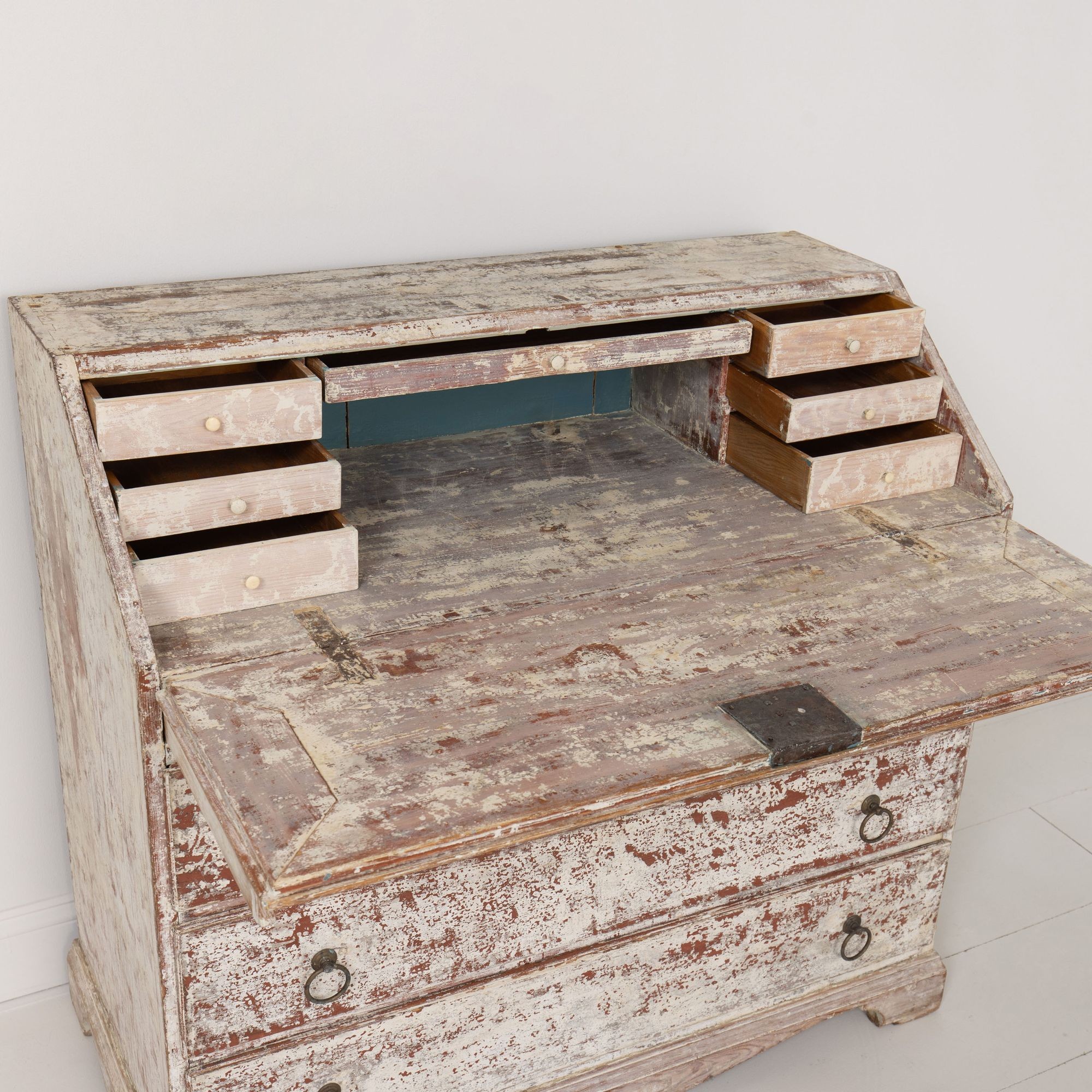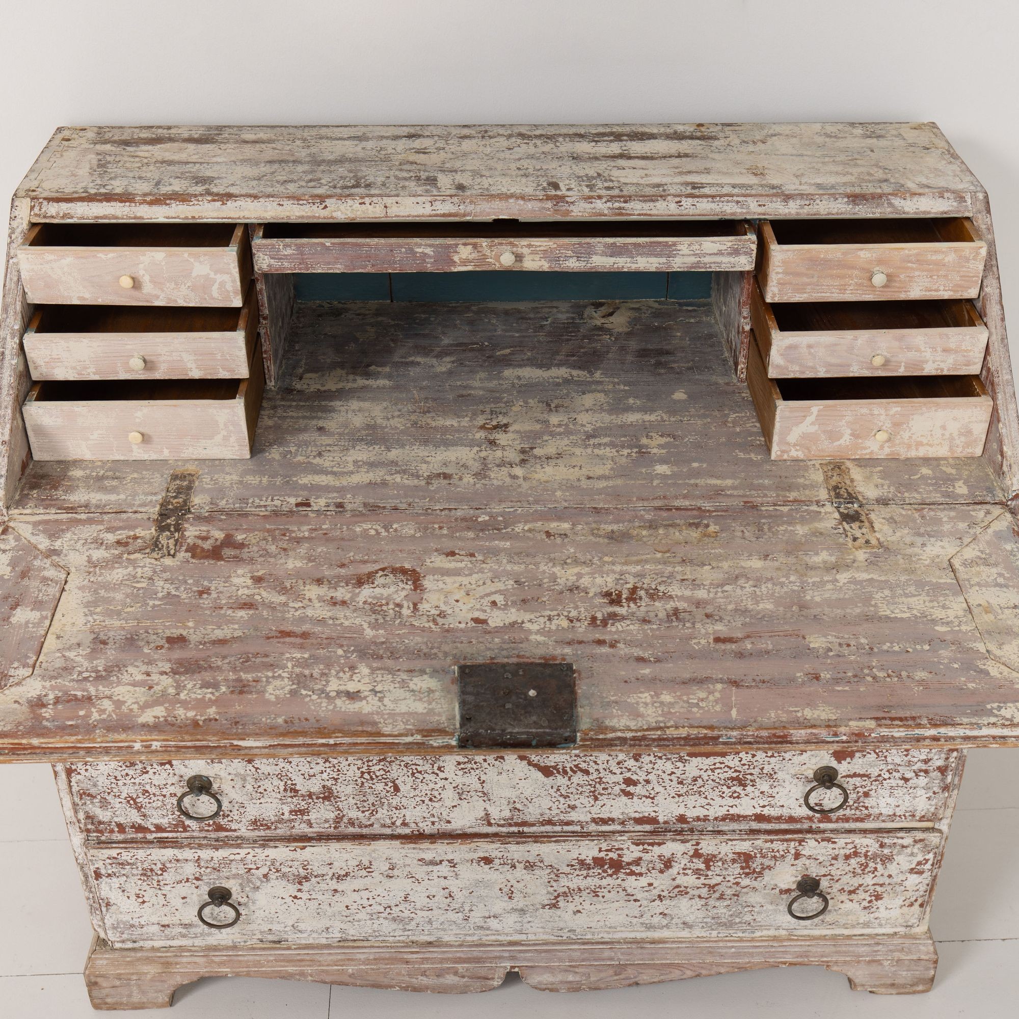 A Swedish bureau secretary with a scalloped base in original paint. Circa 1870. Behind the drop-down desk there are three graduated drawers on either side of a center pigeon hole with a long drawer above. The bureau is comprised of one long, thin drawer above three large drawers. The desk surface height is 29.5 inches. The total depth with the desk open is 31.75 inches. All drawers are in good condition and move easily. The desk lock is no longer working.