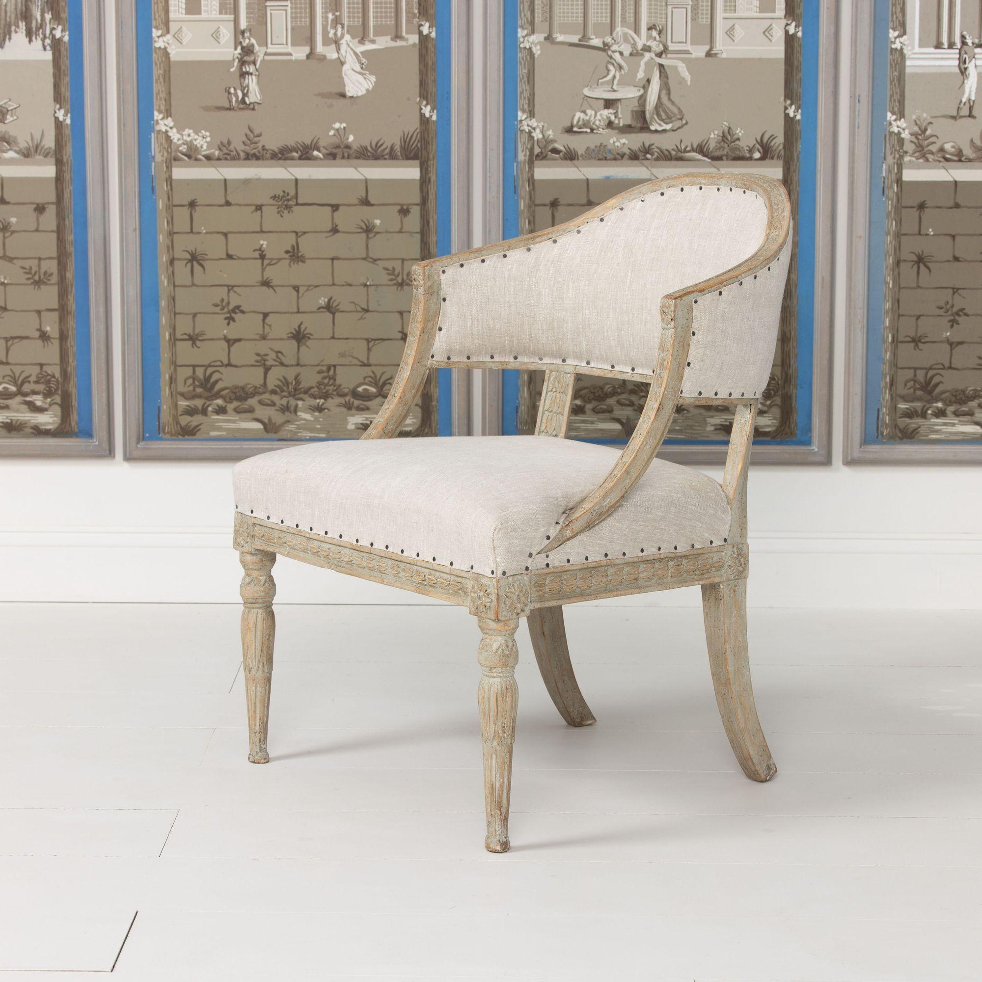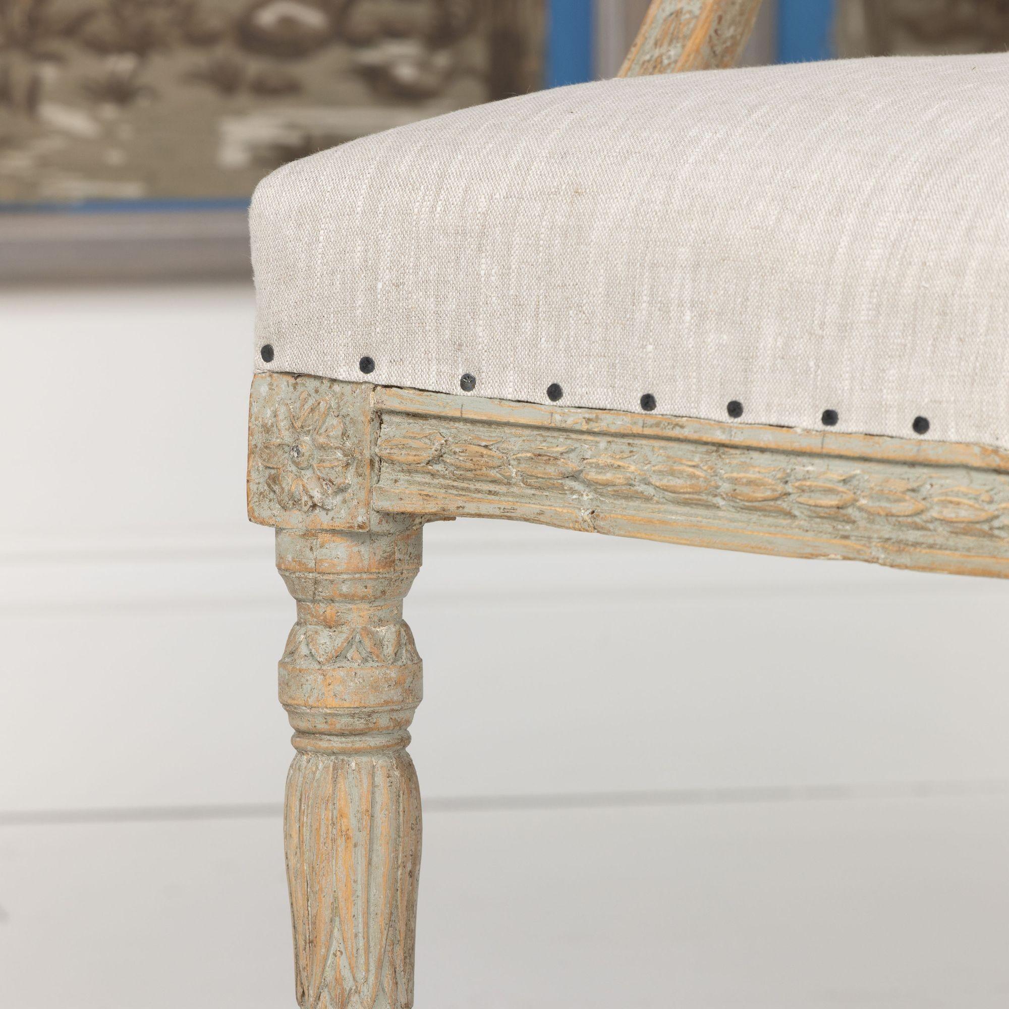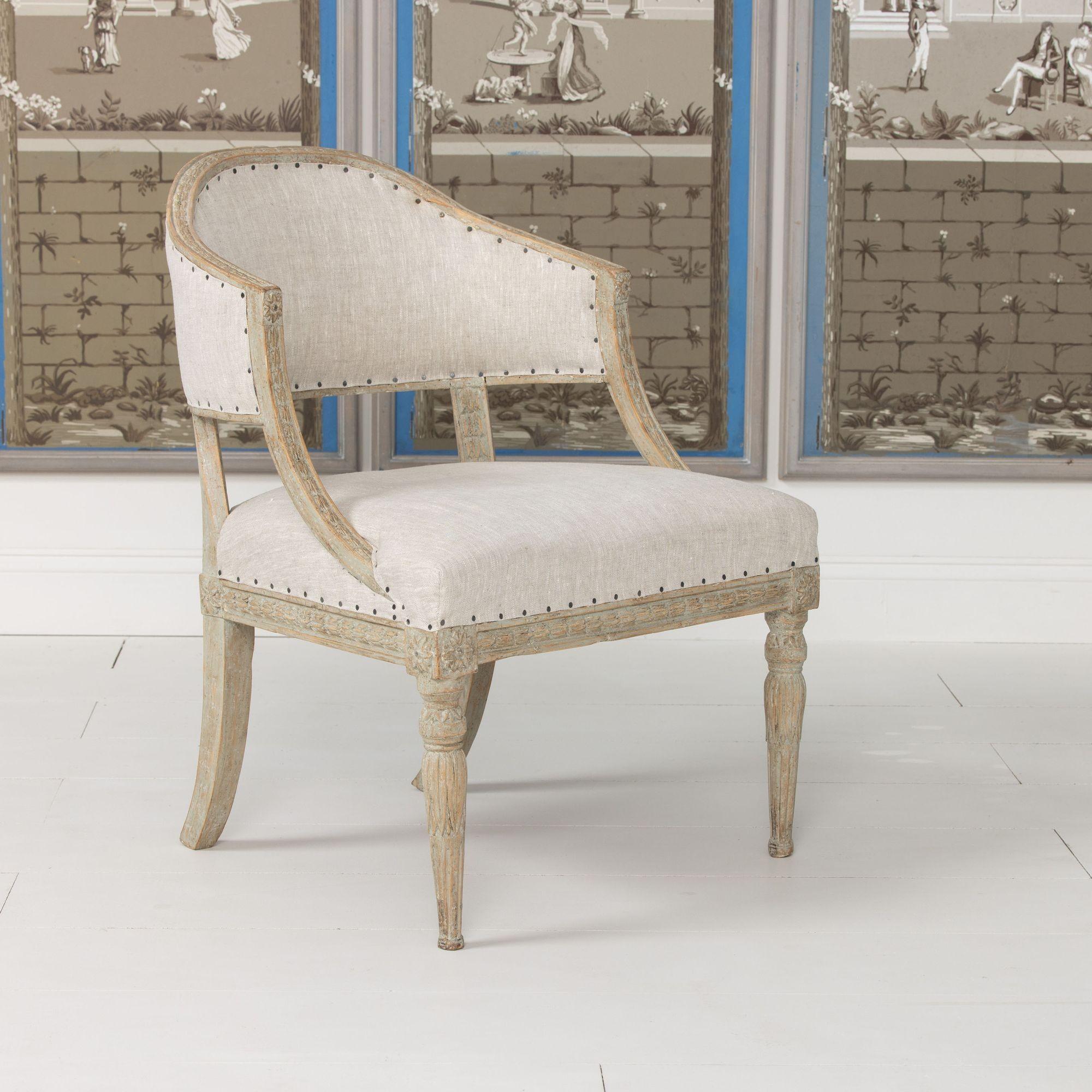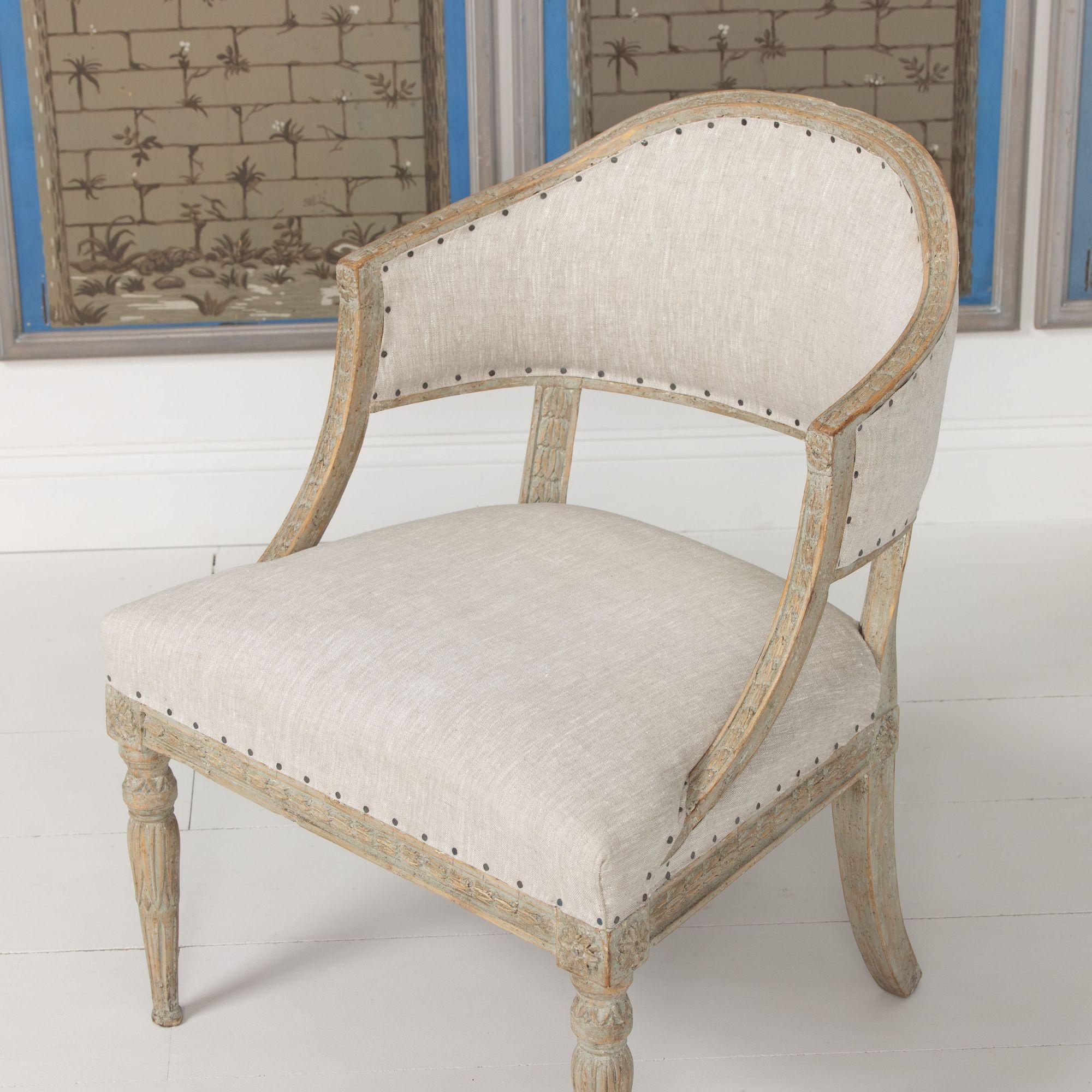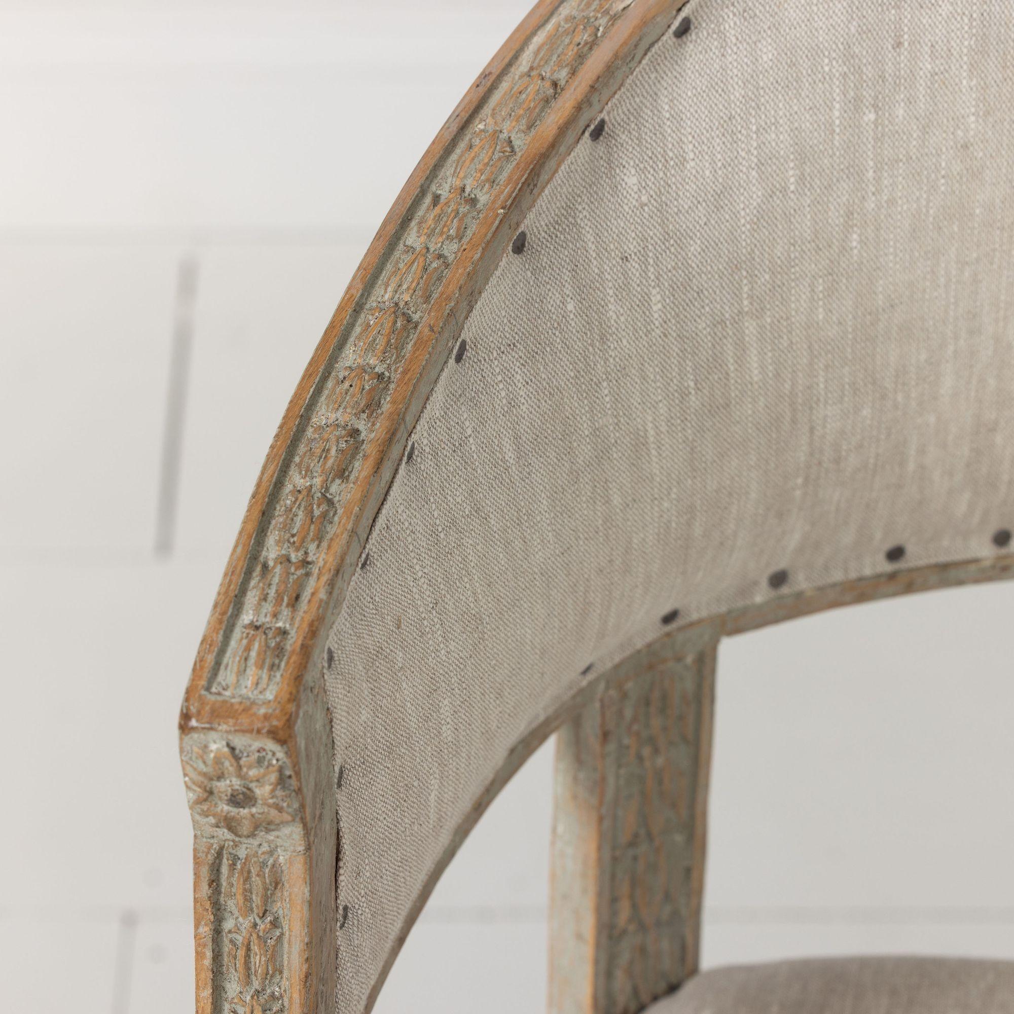 A Swedish antique armchair from the Gustavian period with a unique shaped barrel back, circa 1810. The frame features carved bell flowers with front legs adorned with lotus flowers and rosettes. This chair has been newly upholstered in linen. Richly carved and comfortable.