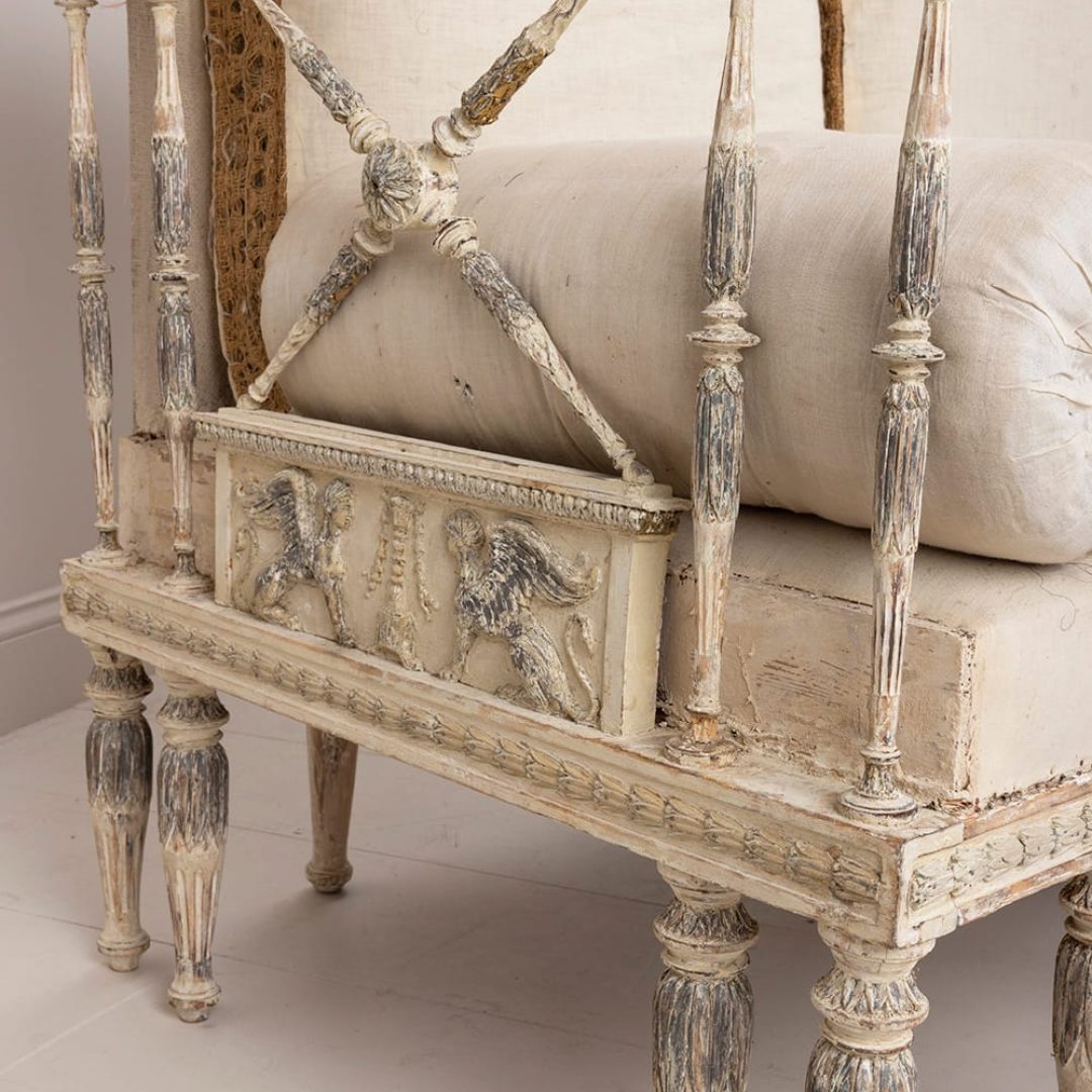 A rare 19th c. Swedish sofa from the Gustavian period hand-scraped to its beautiful, original paint with original cushions. Fine carvings, ca 1800, Stockholm, Sweden. This piece features decoratively carved detailing of bell flowers around the frame with acanthus leaves on the legs. Sphinx heads adorn the arms and the sides depict a typical Gustavian scene with a pair of griffons. Attributed to master chair maker, Ephraim Sthal (1767-1820), who worked in Stockholm and was one of the main furniture makers for the Royal Court, King Gustav III of Sweden. He is considered one of the most sophisticated masters of this period.
