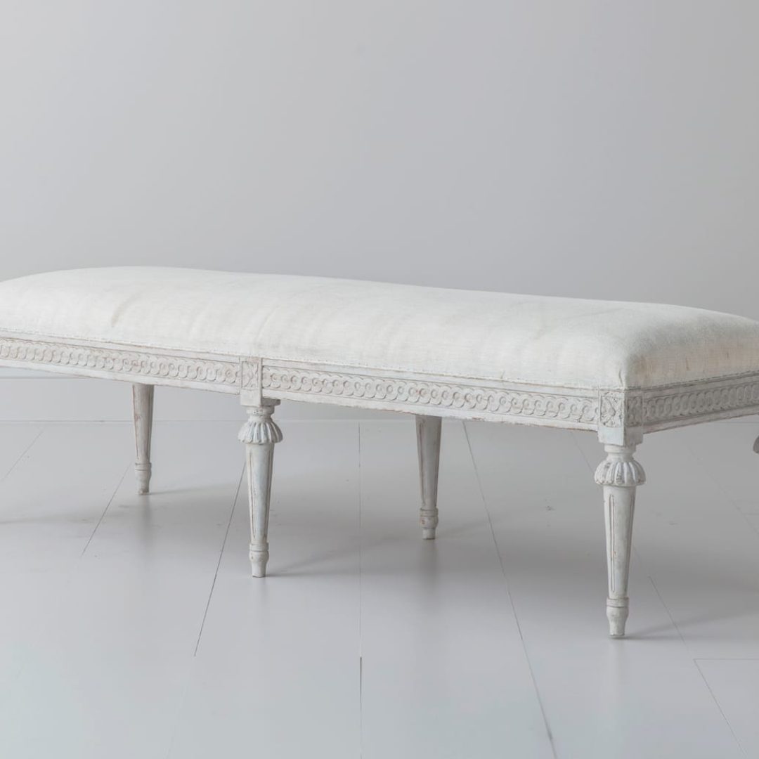 Sold individually. Please inquire for group pricing. A richly carved 19th century Swedish ‘brother and sister’ pair of painted long benches in the Gustavian style, circa 1850. There is a carved guilloche pattern on the seat frames and carved rosettes above fluted, round caps, ending in tapered and fluted legs. Chalky Gustavian-white paint finish. Dimensions: Bench I (back): 18.25 in. H x 59 in. W x 21 in. D. Bench II (front): 18.75 in. H x 60.25 in. W x 2 in. D