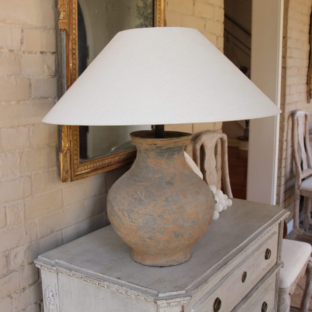 A Chinese Han Dynasty large unglazed terracotta jar, ‘Hu,’ with Taotie masks that has been mounted as a table lamp. Unglazed pottery like this dates to the Han dynasty (206 BC-220 AD). The vase has a beautiful, aged patina with incised rings around the top and lower belly and masks on either side of the belly. The vase dimensions are 13.5 in. high x 11 in. diameter. The electrical cable is installed at the base of the lamp pole, so not to damage the jar. Wired for use in the U.S. The lampshade is handmade in Belgium of fine linen and has a high quality, gold foil inner lining. The lining prevents light from showing through the shade and casts a warm light.