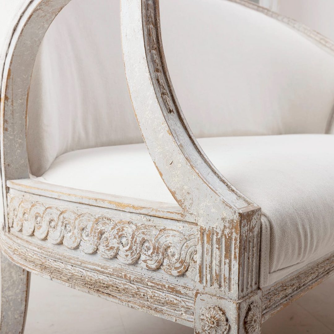 A stunning Swedish sofa in the Gustavian style in original paintwith a comfortable barrel-style back,newly upholstered in linen, circa 1900. The frame features carved bell flowers along the front and acarved guilloche pattern on the sideswhile the front legs are adorned with lotus leavesand rosettes.