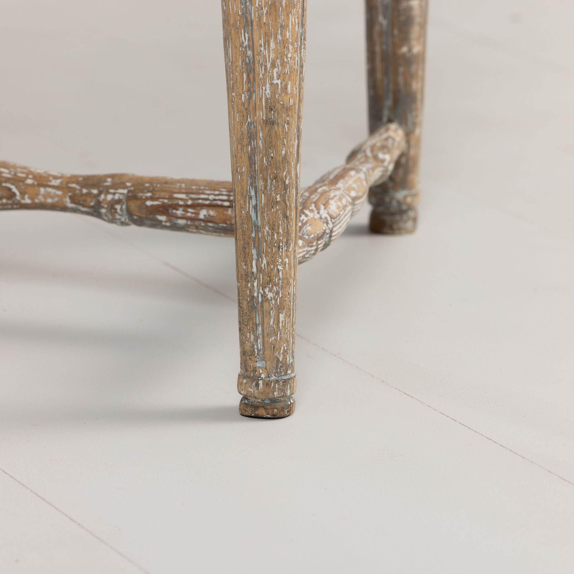 A pair of 18th c. Swedish side chairs from the Gustavian period in original paint. The aged blue patina is lovely. Shield backs, tapered and fluted legs with cross stretch, and slip seats wearing old muslin fabric. Circa 1810.