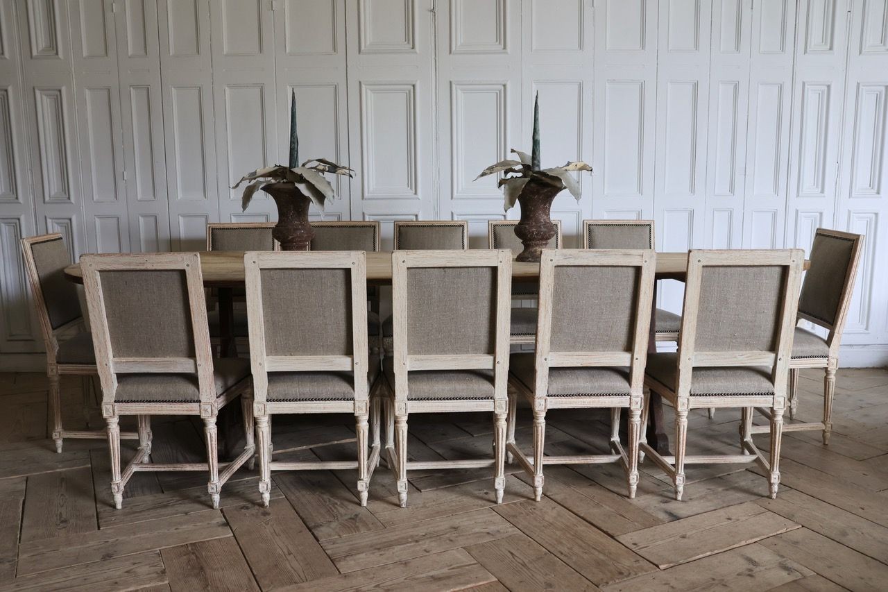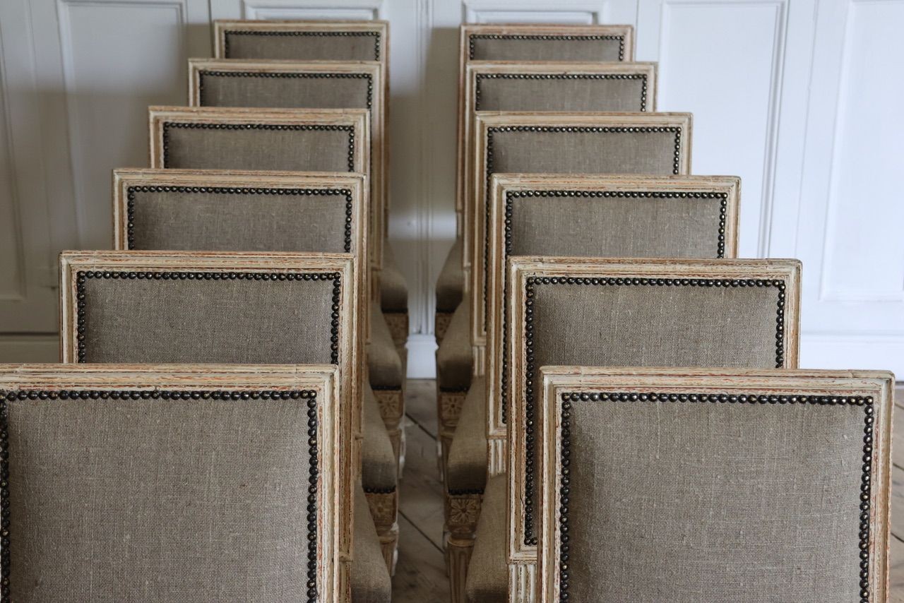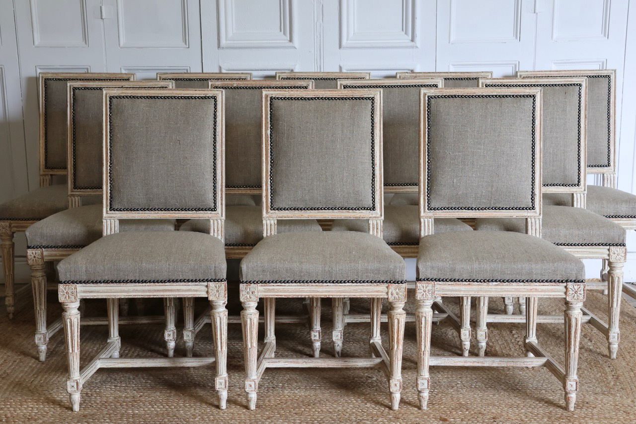 A set of twelve French dining chairs in the Louis XVI style wearing original paint and newly upholstered in natural Irish linen with nail head trim. Tapered and fluted legs with rosettes on the front corner posts and a wonderful “H” stretcher base. Circa 1930.